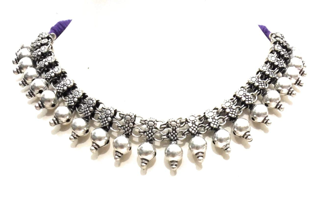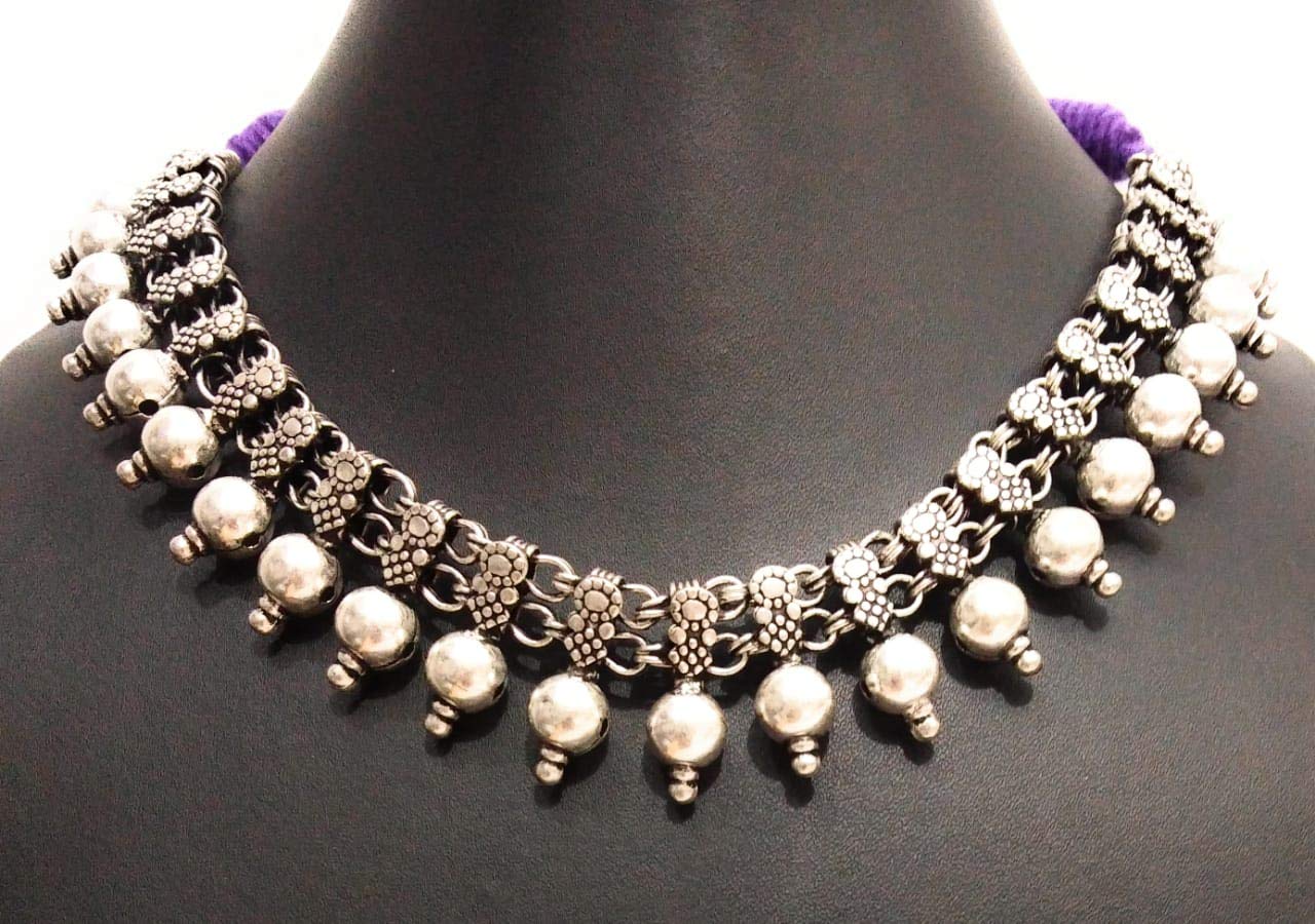 athizay Ethnic Necklace for Women for Traditional Dress Festival Oxidized Silver Metal Beaded Single line Choker Jewelry for Women