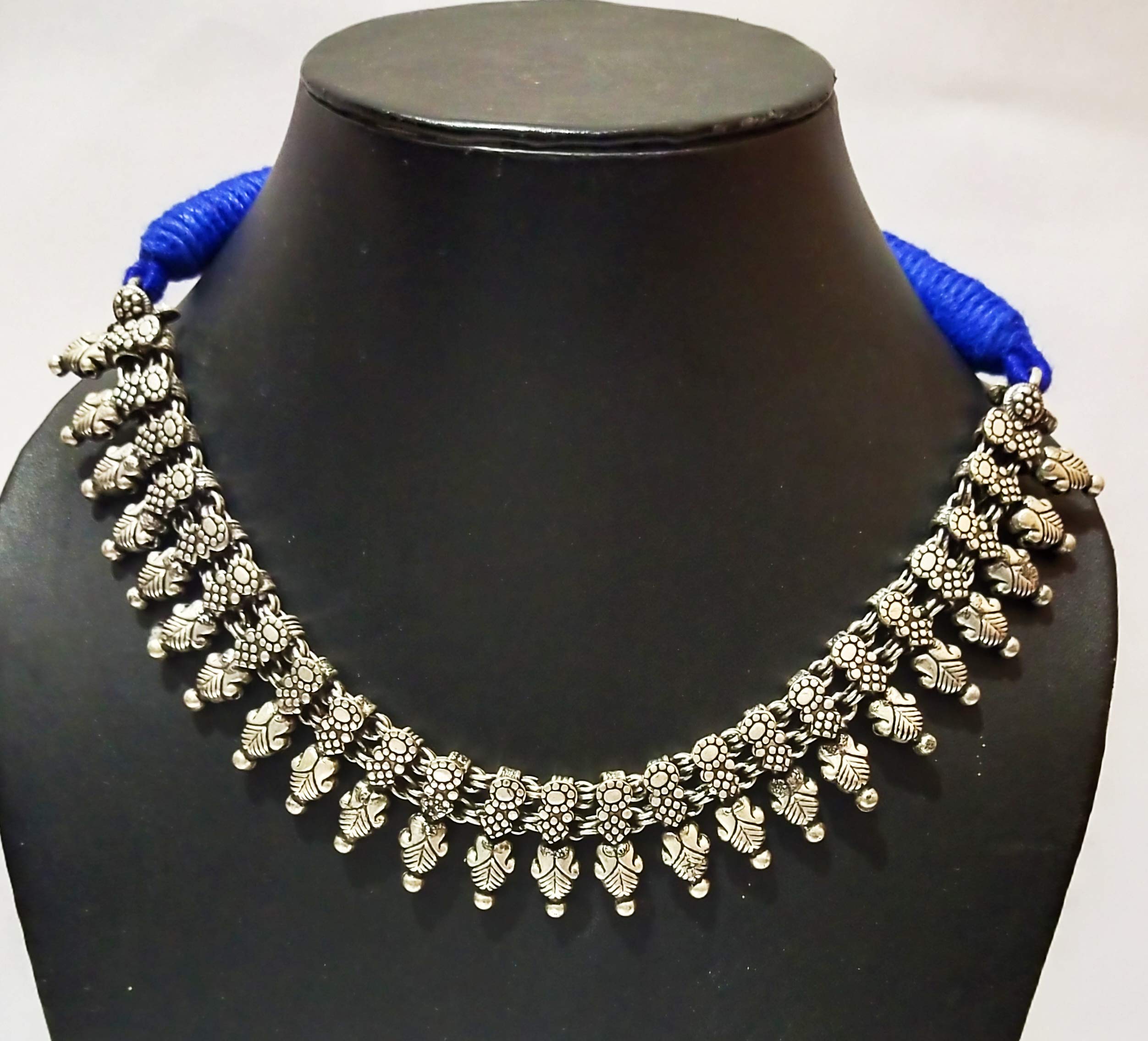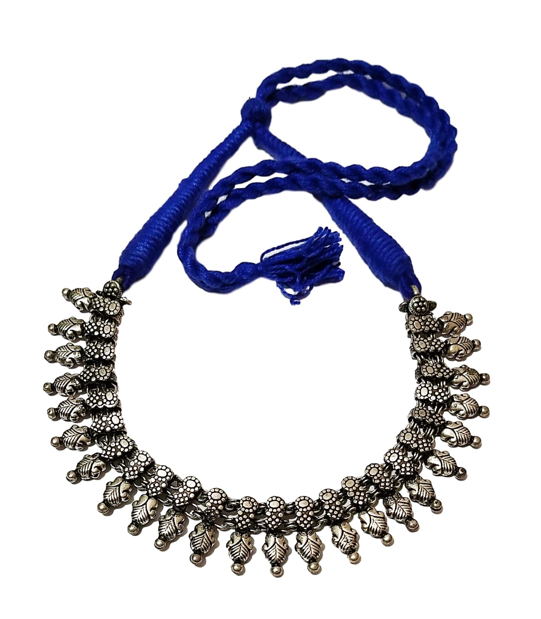 This is a beautiful sliver beads single line design necklace choker made up of oxidized silver. The attached drawstring an be adjusted to collar level as well. This is a thread oxidised silver women fashion choker necklaces for party wear wedding festivals jewellery. STYLE & SUBSTANCE –Rajwada elite Indo-western feel to the jewelry. 16 inch long single line choker for women stylish Necklace. Made from high quality oxidized silver which doesn't loose its appeal when becoming antique after years. However always keep it sealed. MADE IN - This thread Jewelry Is Heritage Of Jaipur Handcrafted by Indian Artisans Devoted To this Craft For Centuries But is Still Trendy Exquisite & Mesmerizing. Hence These Necklaces Are Not Exact Replicas Of Each Other. DRESSES TO GO ALONG - Not only ethnic and over the top dresses the necklace looks amazingly beautiful even if worn with an open collar shirt or a tube top dressing or a mermaid or haltar neck or bardot. You can pair it lehenga choli for an Indian look and pair it with a western dress for a fusion statement look. JEWELLERY CARE - Wipe with Soft Cloth after every use. Keep away from Water sprays or perfumes. Try to store your jewellery in a flat box to avoid accidental scratches. SKIN FRIENDLY and NON ALLERGIC - Nickel free and Lead free as per International Standards that makes it very skin friendly. The plating is non-allergic and safe for all environments. USE - Women love jewellery. They wear it on different occasions. They have special importance on ring ceremony wedding and festive time. They can also wear it on a regular basis . Ideal gift for special occasions. ATHIZAY – Quality you can trust. Please search for “athizay” on search bar and do check out our range and excellent ratings. 16 Inch Long Neck choker for women stylish with adjustable Cotton Dori. The necklace is an adjustable choker collar style ensemble. The ease with which you can wear it is just awesome. The knob on the cotton dori is movea