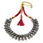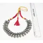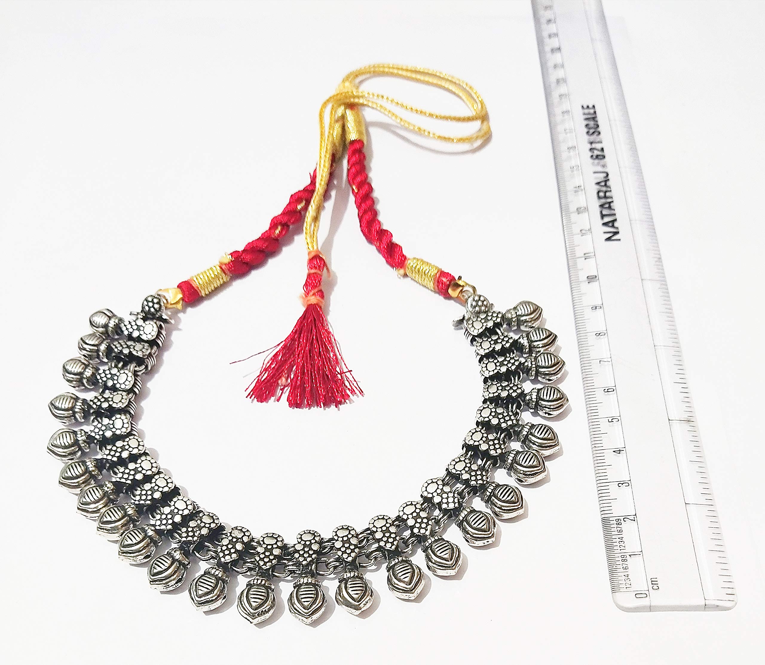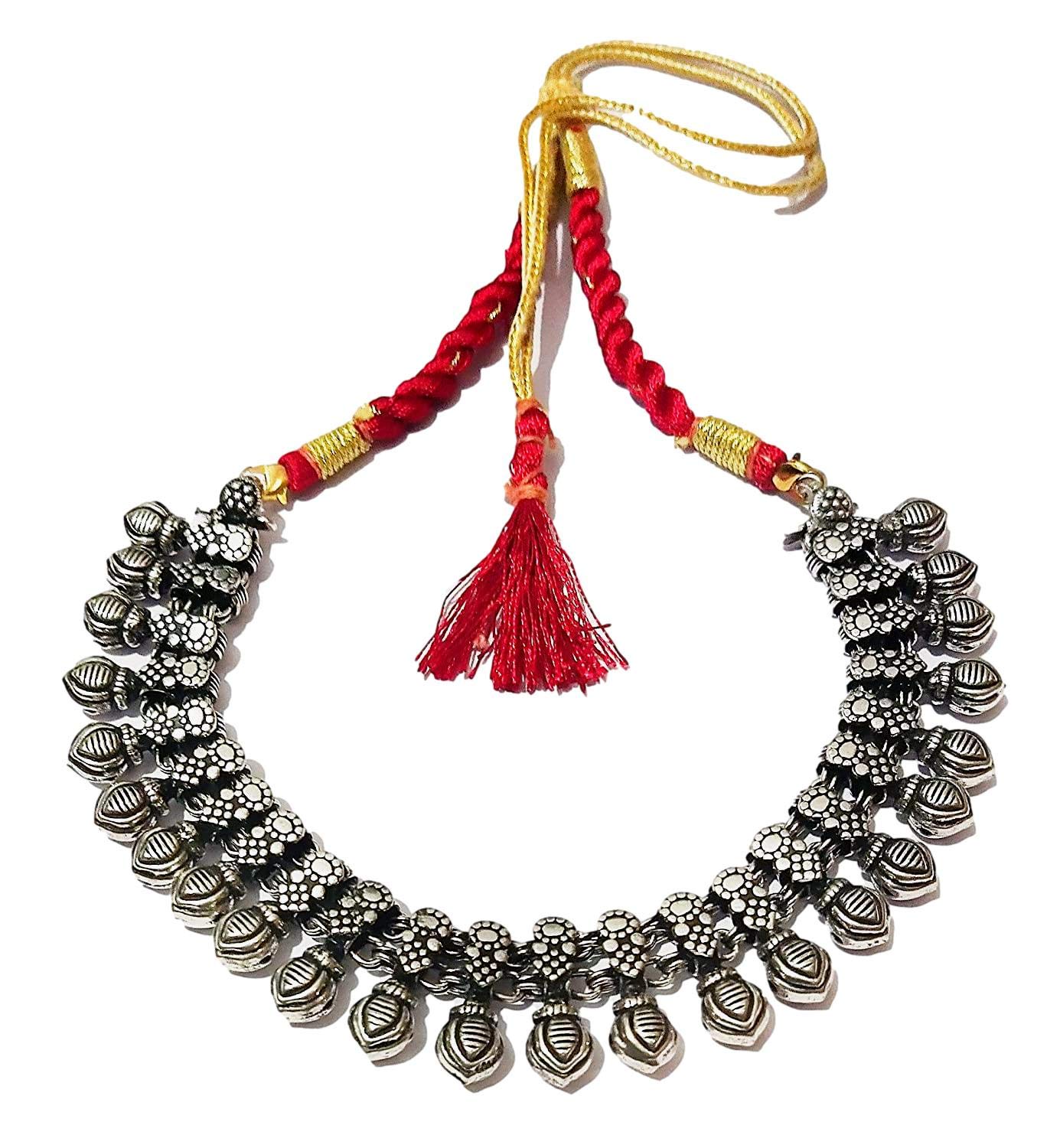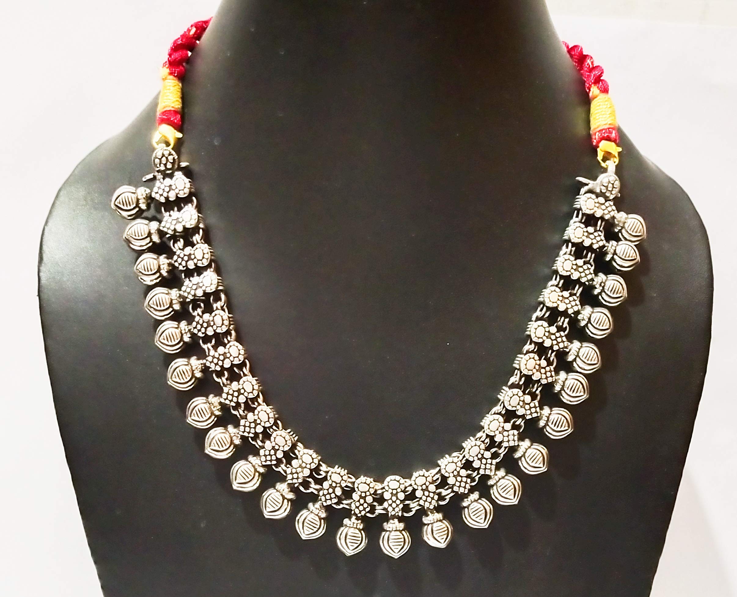 Golden Red Thread Oxidized Silver Metal beads Necklace with Antique Texture This necklace is made with metal embossed design These are individual metal chunks embossed and engraved then conjoined to make a masterpiece .This piece is bound to add to the beauty to the one who adorns it by leaps.The piece is entirely oxidized metal. If you wear it in a party you will be the cynosure of all eyes.The piece keeps adding beauty as turns grey and slowly over time gets an antique texture to it.This one is a must-have in your wardrobe. Adds to the beauty over time. Heavy Embellishment Tribal Necklace This is suitable for Yellow and Golden dress. Silver Coated Golden Red Thread Brass Oxidized Necklace Metal beads. The necklace is made in Jaipur. The oxidized silver necklace design is such that it is adjustable thus you can make it a collar choker or princess. Tribal Necklaces for Girls & Women Antique Texture statement jewellery. Such a design looks extremely good on Bib Bandeau tube top and off shoulder dresses. it is a stylish statement item for any Black violet Red or white dress. It will suit a pink couture as well. Export Quality Metal Jewelry for women stylish.Hollywood Style. The necklace should not be worn with round neck t shirt as it would loose its appearance. Suitable for any occasions and dress. From a protection perspective please make sure that youo wear the necklace last after make up is fully done. Once the party is over the necklace should be the first item to be taken off. This will ensure its longevity. Also protect it from water direct spray of deodorant.