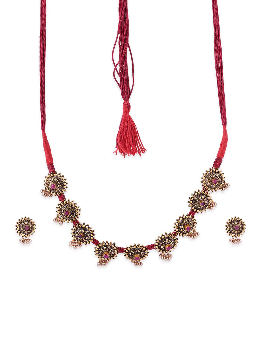PRODUCT DETAILS This jewellery set consists of a necklace and a pair of earrings Silver-plated dual-toned choker necklace secured with a drawstring closure A pair of matching studs secured with a post-and-back hook closure Size & Fit Necklace: 21 cm x 2 cm (Length x Width) Earrings: 3.8 cm x 3.8 cm (Length x Width) each Material & Care Material: German Silver Plating: Silver-plated Care Instruction Wipe your jewellery with a soft cloth after every use Always store your jewellery in a flat box to avoid accidental scratches Keep sprays and perfumes away from your jewellery Do not soak your jewellery in water Clean your jewellery using a soft brush dipped in jewellery cleaning solution only