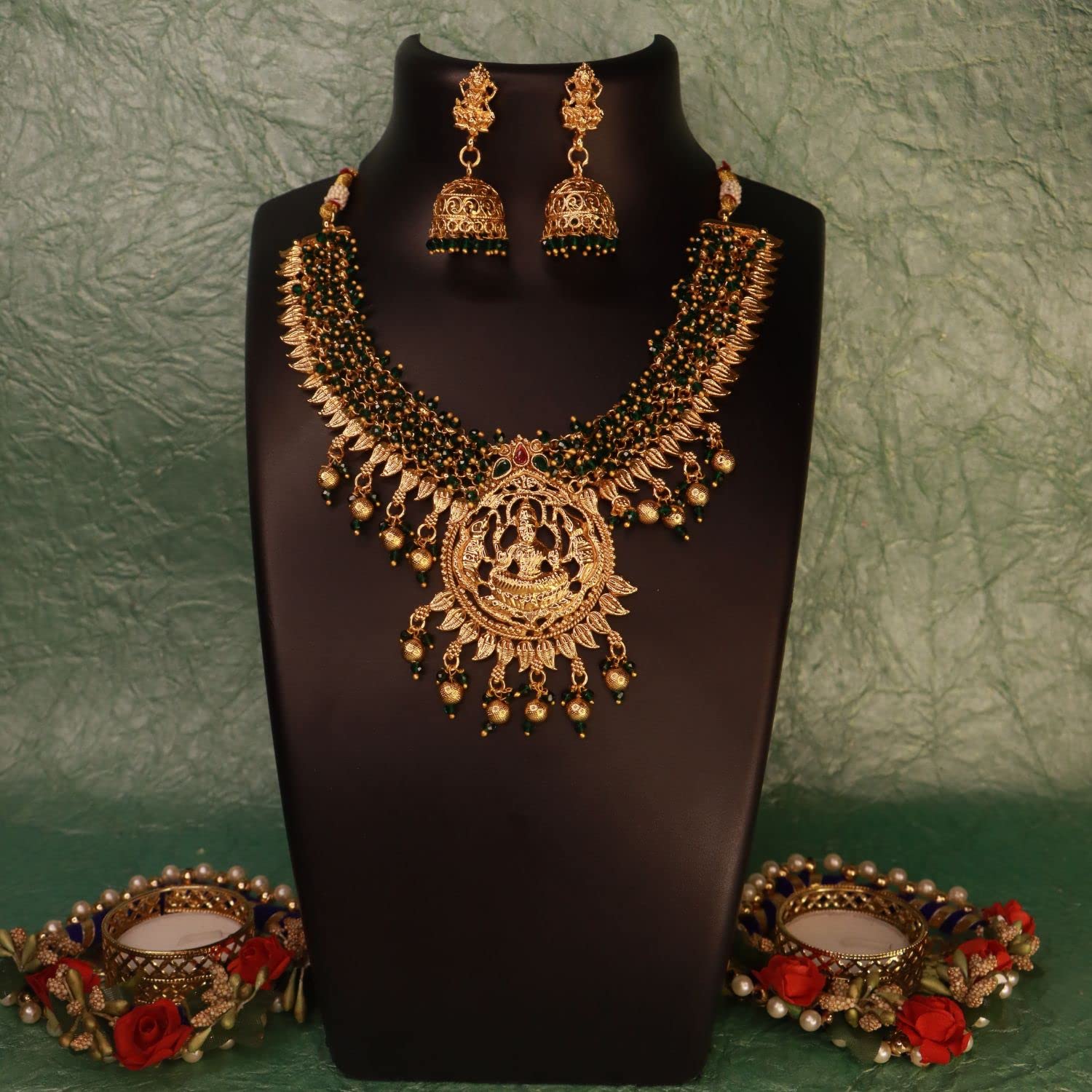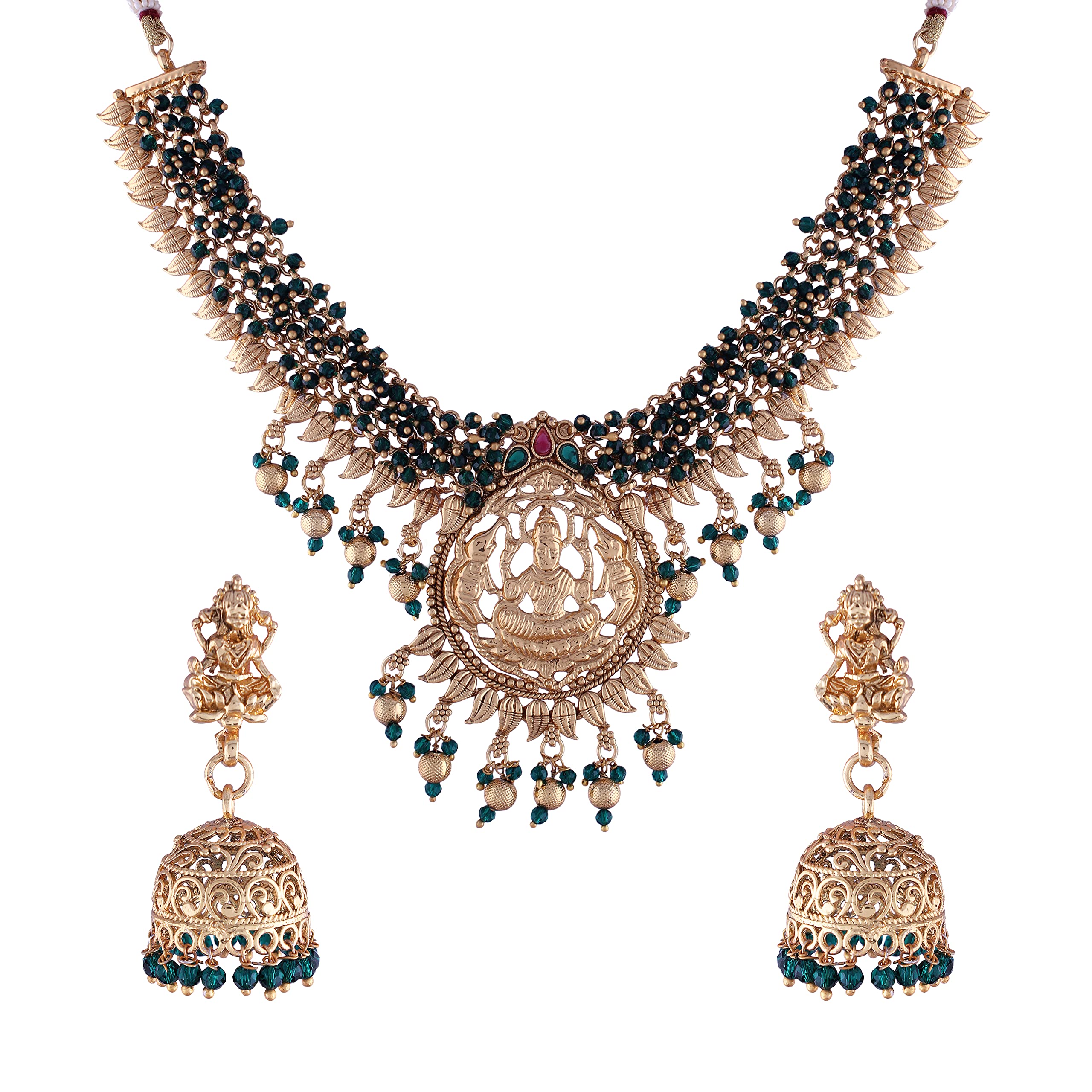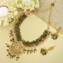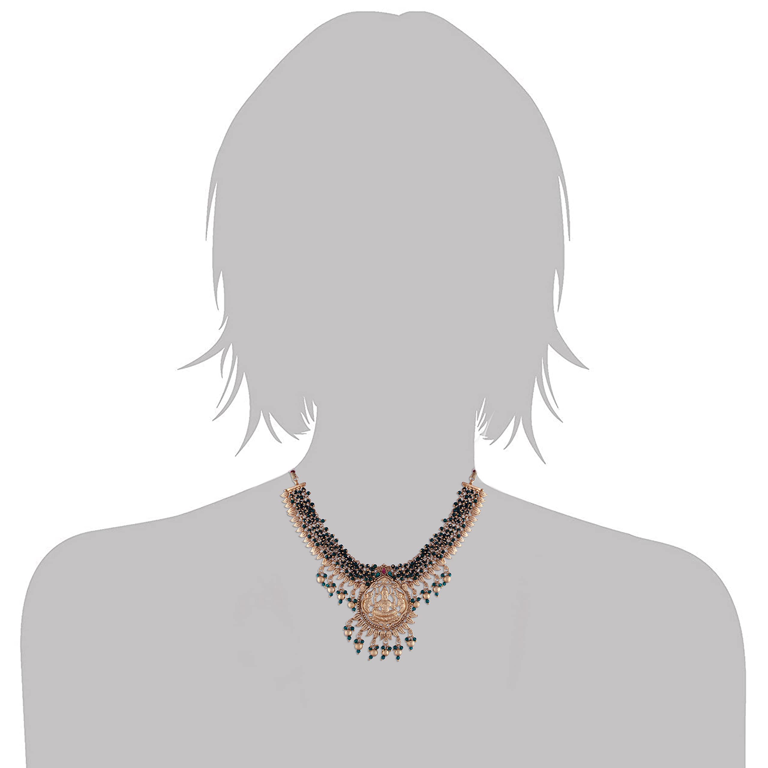This jewellery set is crafted in 18K gold plating and consists of a choker and a pair of earrings. The necklace feature beads & pearls studded in it and is secured with a drawstring closures. Style this necklace set with a saree or a salwar suit to enhance the look.