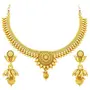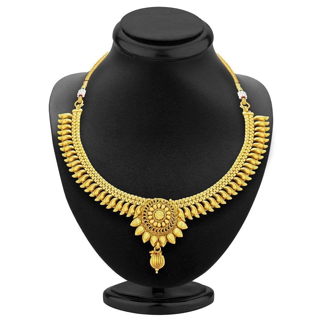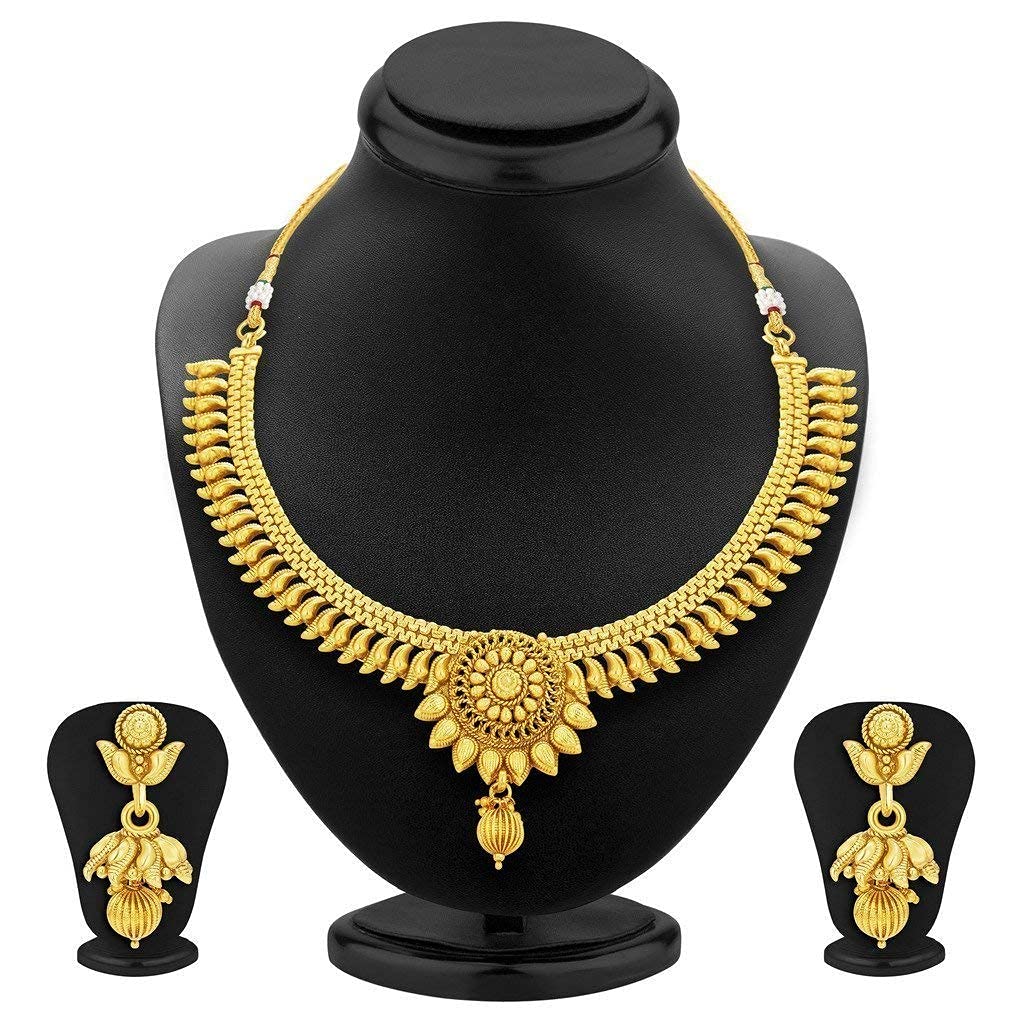 Dimension : Necklace Length - 14 cm x Width - 12 cm Earring Height - 4 cm x Width - 2 cm. This jewellery set is crafted in gold plating and consists of a necklace and a pair of earrings. This necklace set with a saree or a salwar suit to enhance the look. This jewelry set is a great option and a perfect pick for your wedding functions. Be assured to find a variety of contemporary and traditional designs in the mesmerising collection that we offer.