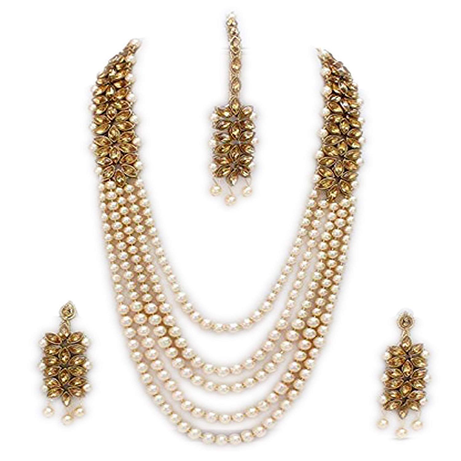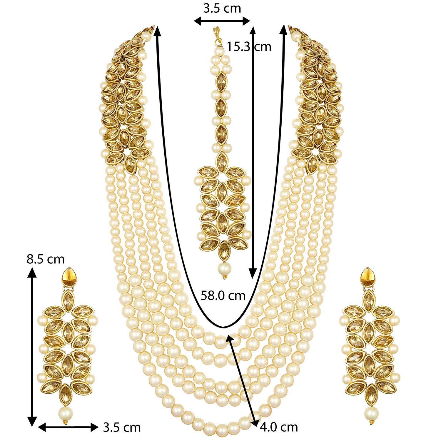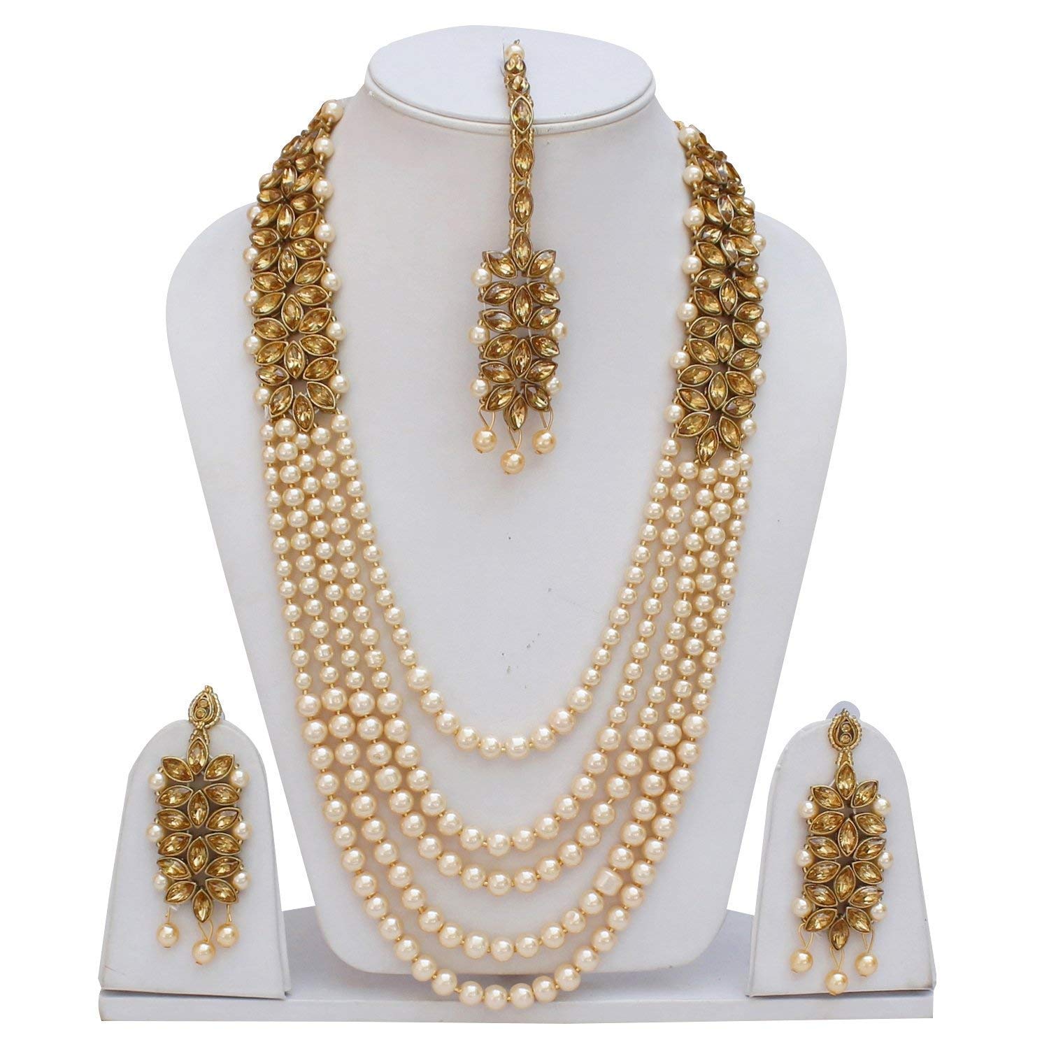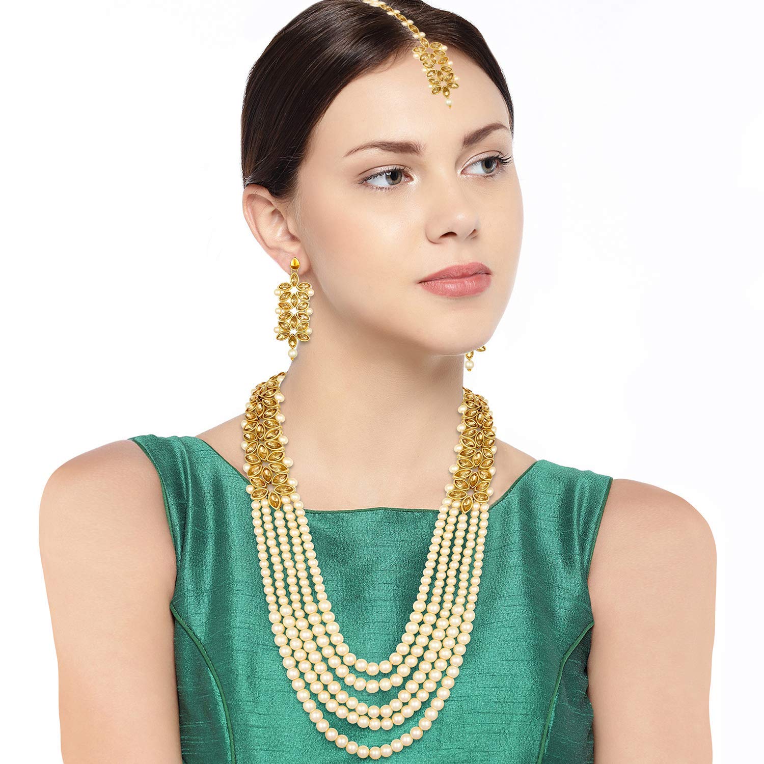 I Jewels 18K Gold Plated Traditional 5 Layers Kundan & Pearl Beaded Moti Raani Haar Necklace Jewellery Set For Women (ML164)