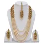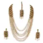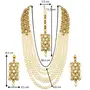 This jewellery set is crafted in gold plating and consists of a necklace and a pair of earrings with maang tikka. The necklace feature kundan-studded and pearl in it and is secured with a drawstring closures. Style this necklace set with a saree or lehenga on your wedding day to enhance the look.