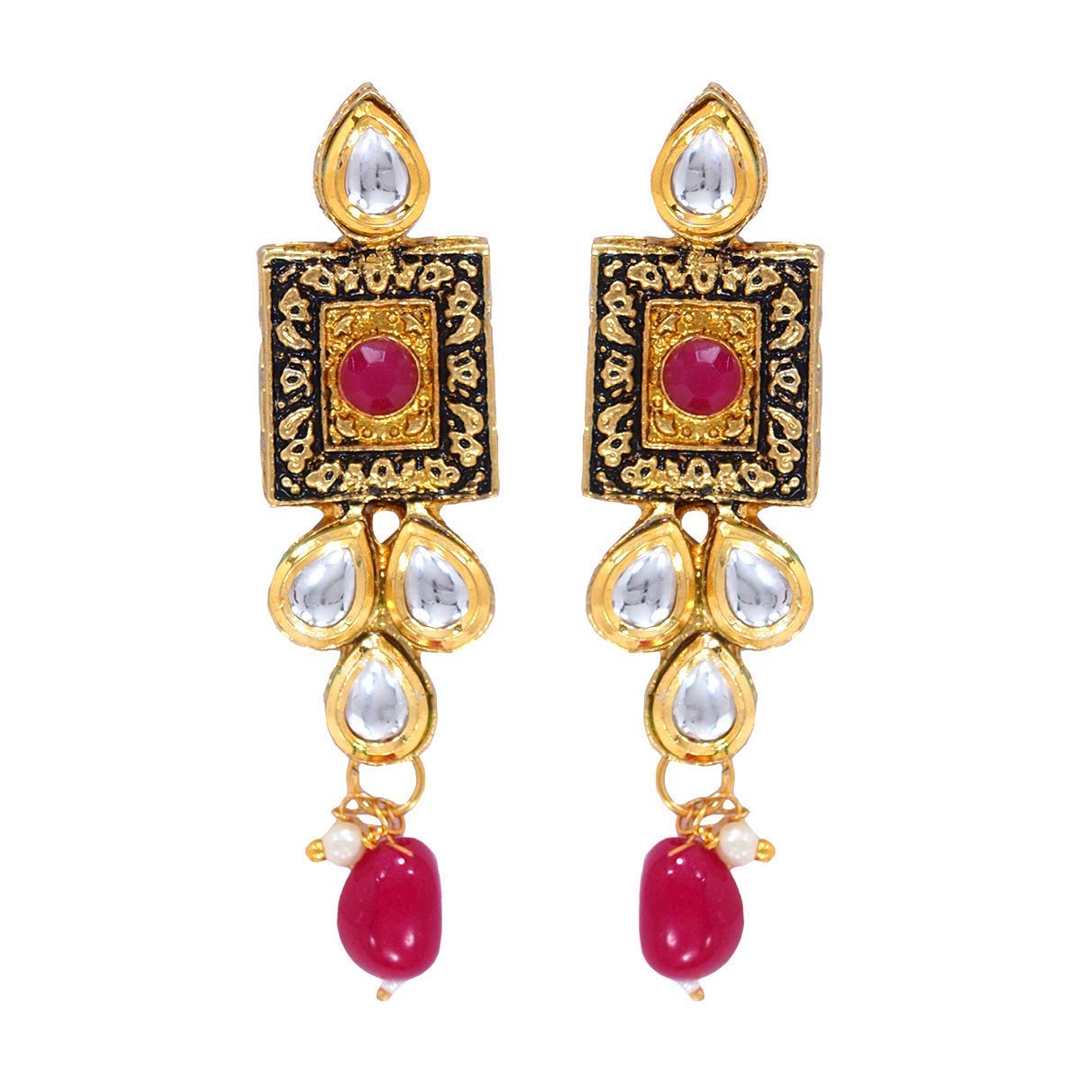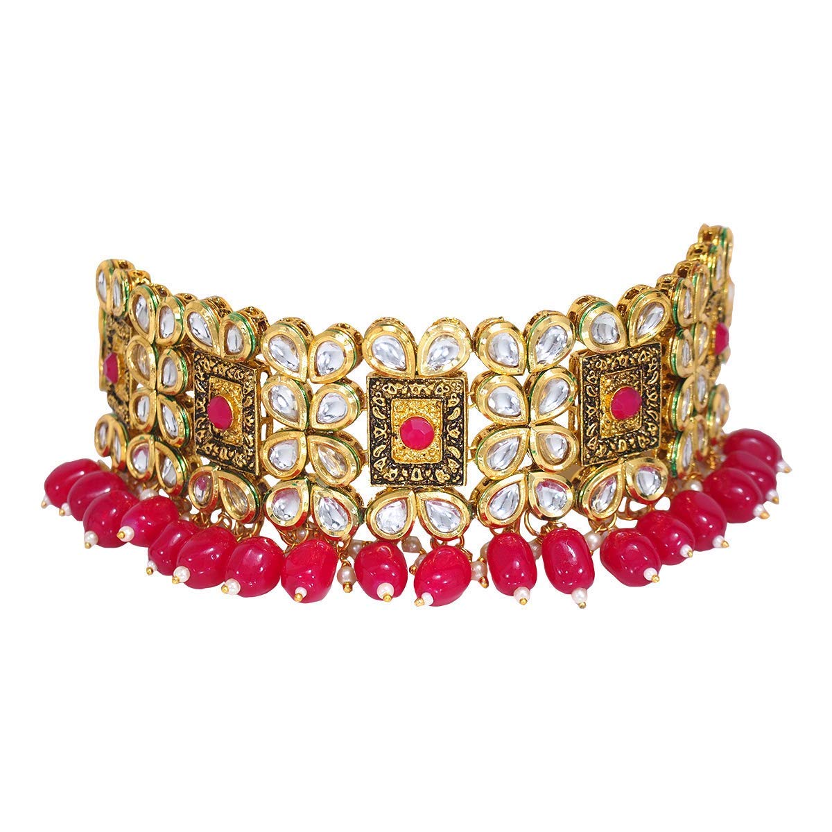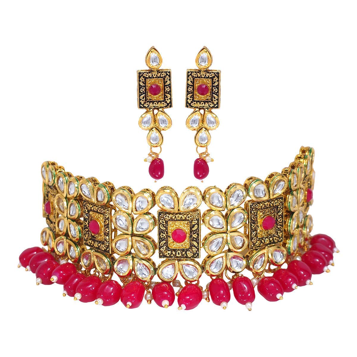 This jewellery set is crafted in gold plating and consists of a necklace and a pair of earrings. The necklace feature stone-studded in it and is secured with a drawstring closures. Style this necklace set with a saree or a salwar suit to enhance the look.