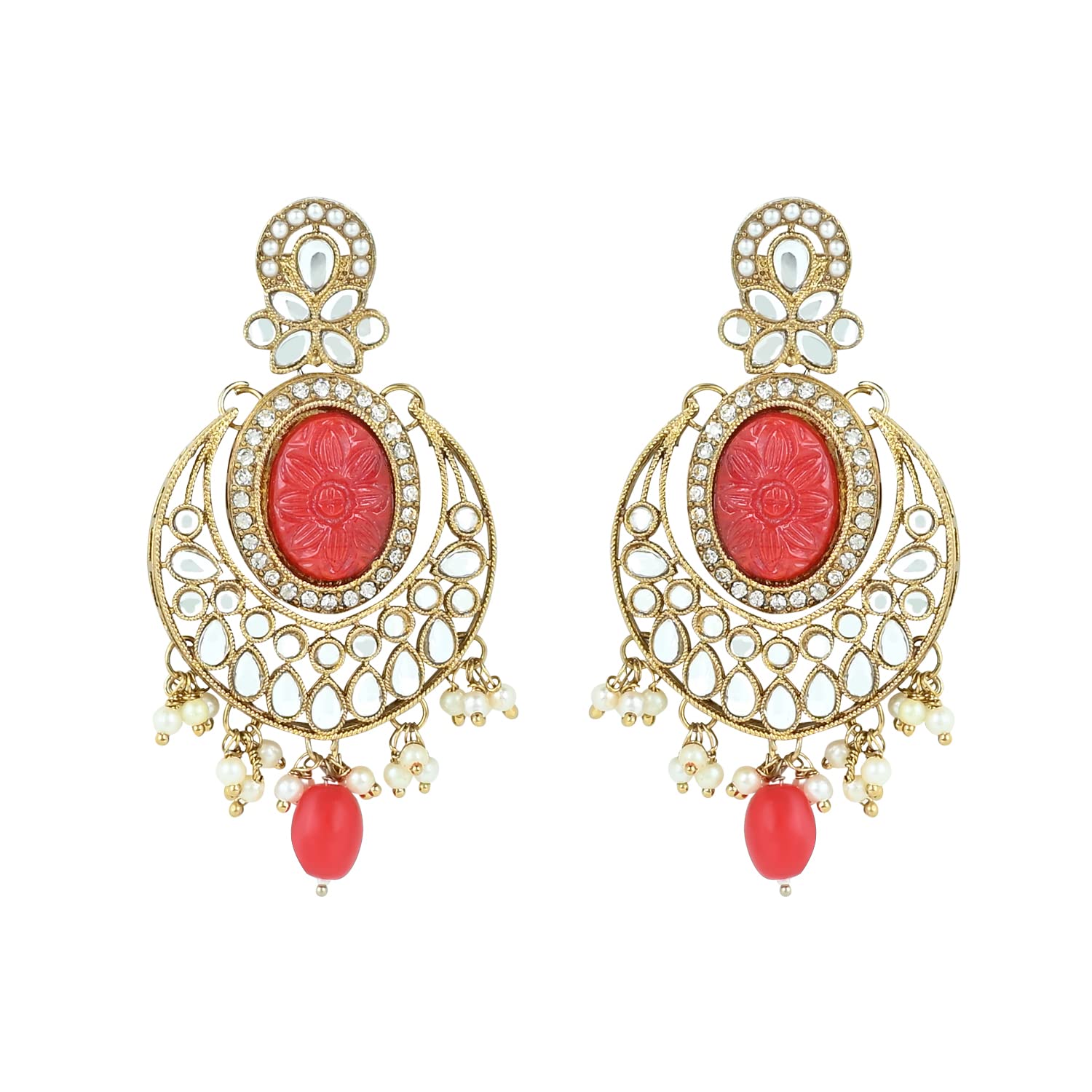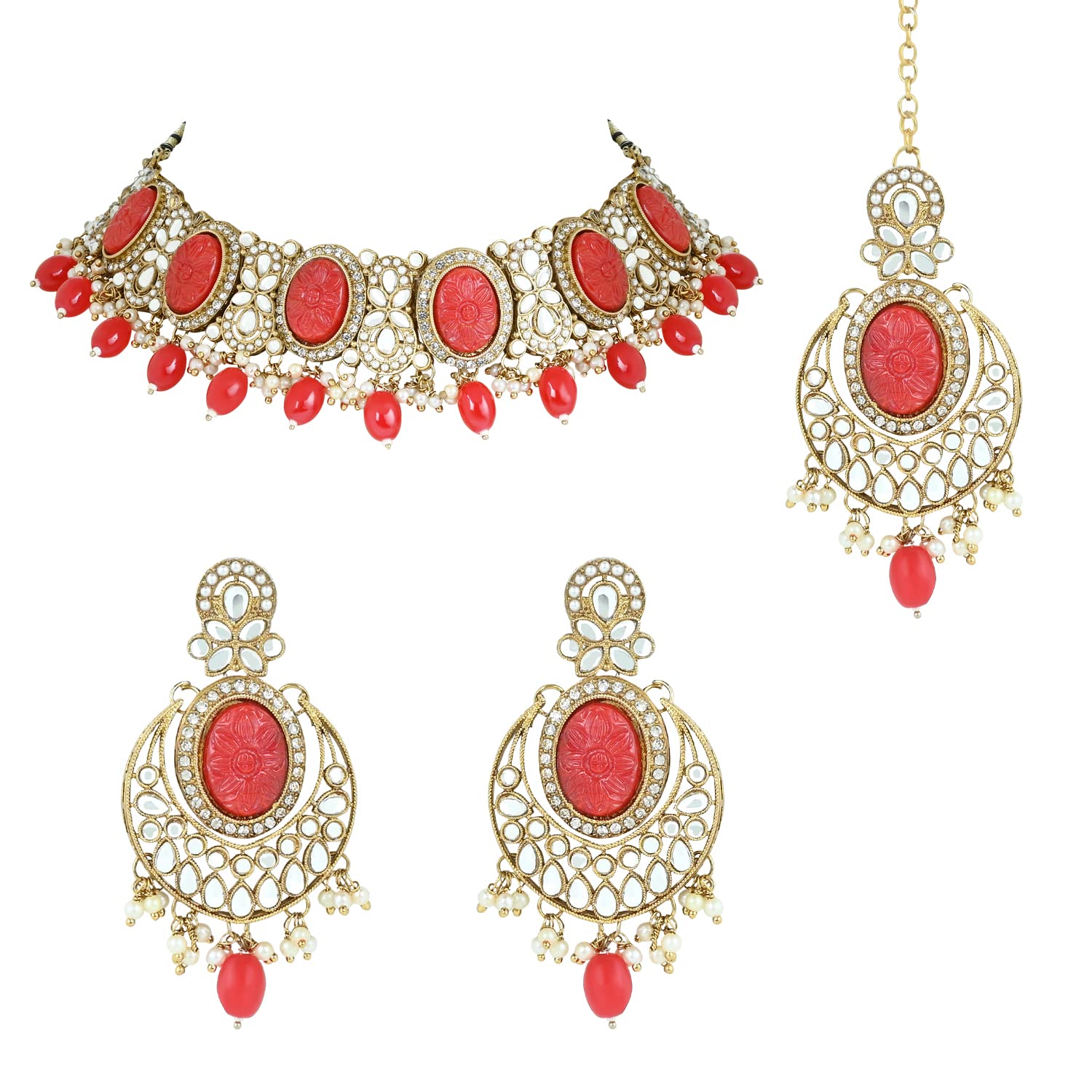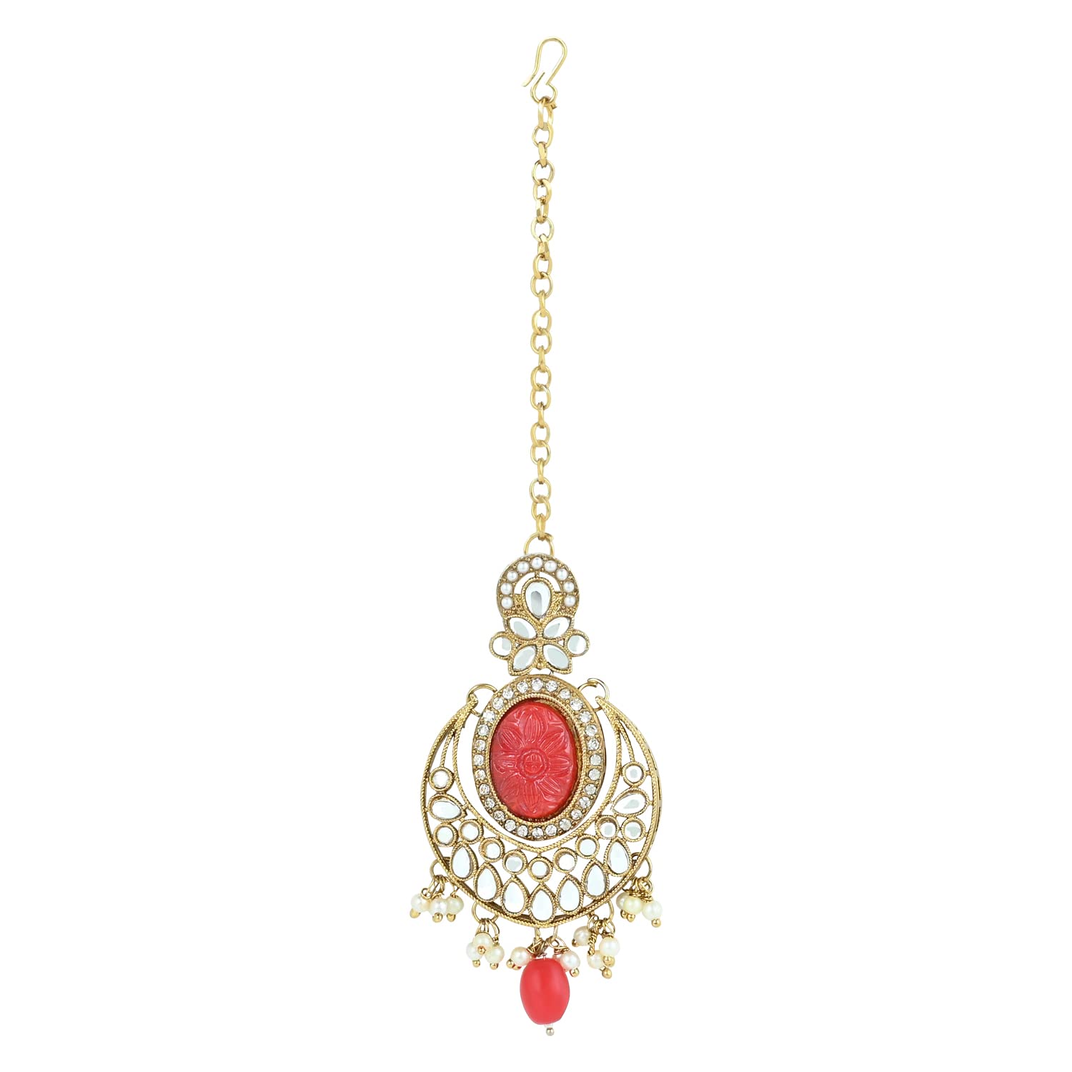 I Jewels 18k Gold Plated Traditional Red Pearl Kundan & Stone Studded Jewellery Necklace Set with Maang Tikka for Women (K7233R)