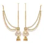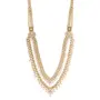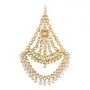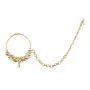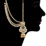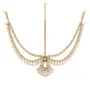 This jewellery set is crafted in gold plating and consists of a necklace choker and a pair of earrings nath passa mathapatti and a pair of panja. The choker necklace feature kundan-studded in it and is secured with a drawstring closurs. Style this necklace set with a saree or a salwar suit to enhance the look. This jewelry set is a great option and a perfect pick for your wedding functions. Be assured to find a variety of contemporary and traditional designs in the mesmerising collection that we offer.