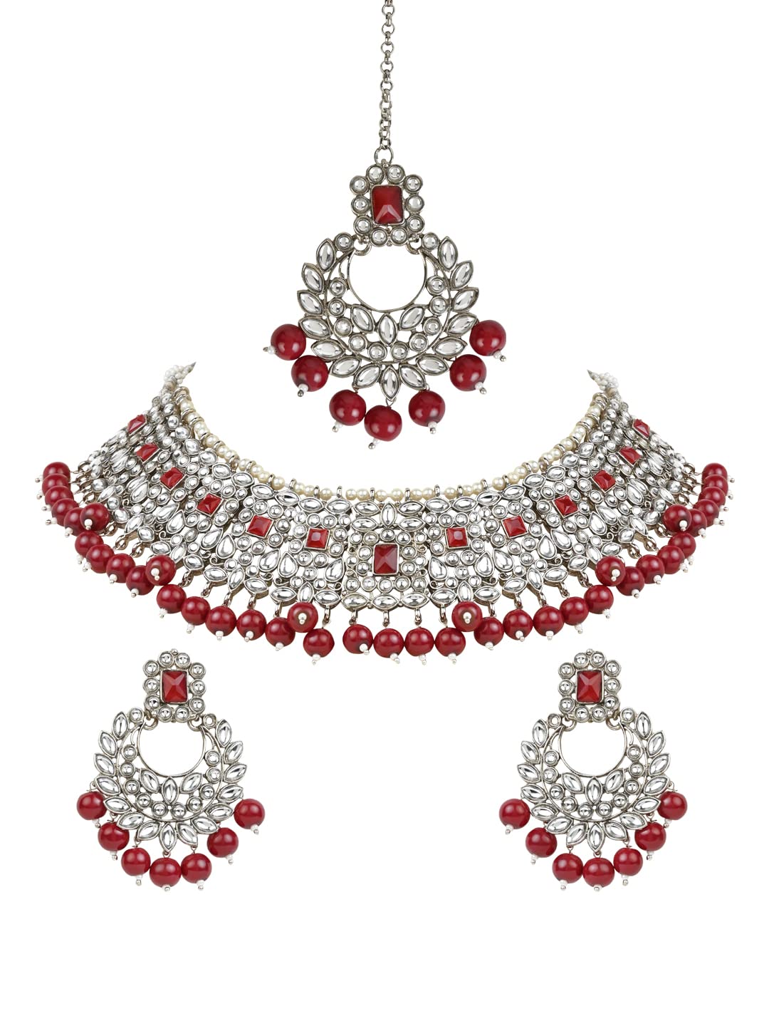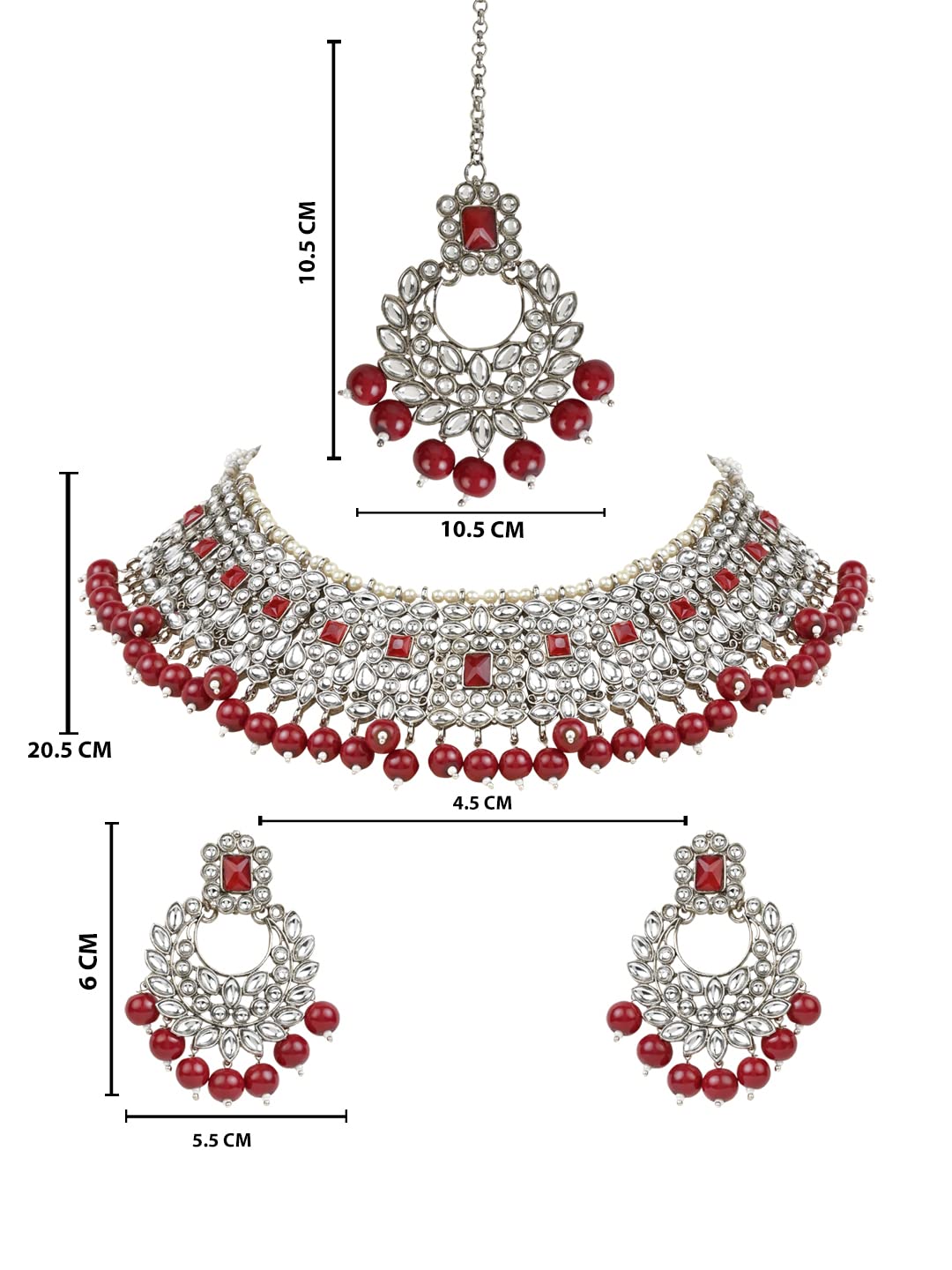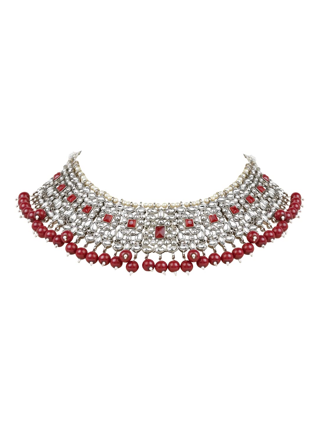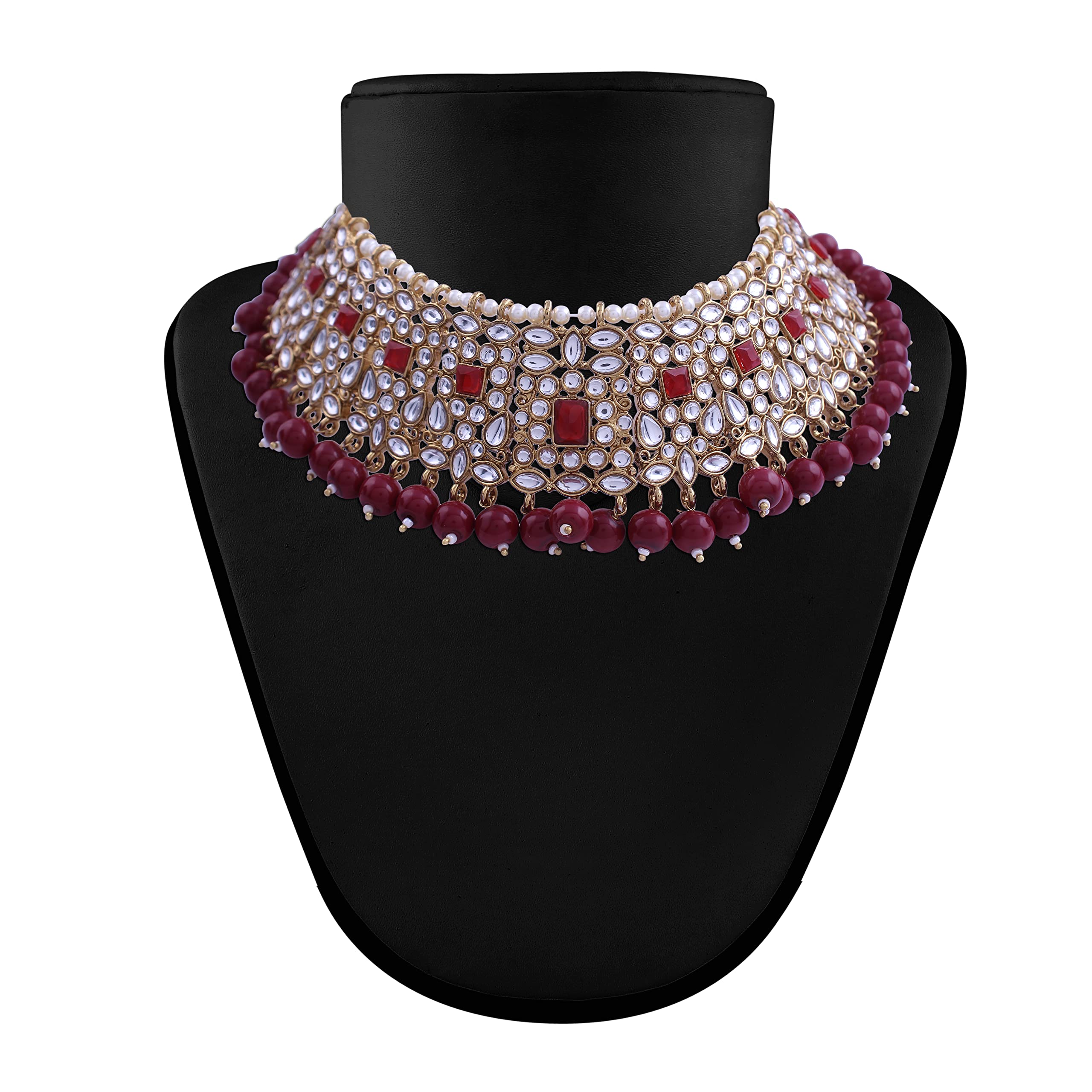This jewellery set is crafted in 18K gold plated traditional light weight beaded choker set glided with moti work. The necklace feature beads & moti work in it and is secured with a drawstring closures. Style this necklace set with a saree or a salwar suit to enhance the look.