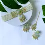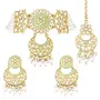 DIMENSIONS: Necklace Length - 10 Inch X Width - 8.8 Cm Earring Height - 6.4 Cm X Width - 3.6 Cm Maang Tikka Length - 14.3 Cm X Width - 3.6 Cm Weight - 98 Grams. This jewellery set is crafted in gold plating and consists of a choker pair of earrings and maang tikka. The Meenakari choker necklace feature kundan-studded in it and is secured with a drawstring closures. Style this necklace set with a saree or a salwar suit to enhance the look.