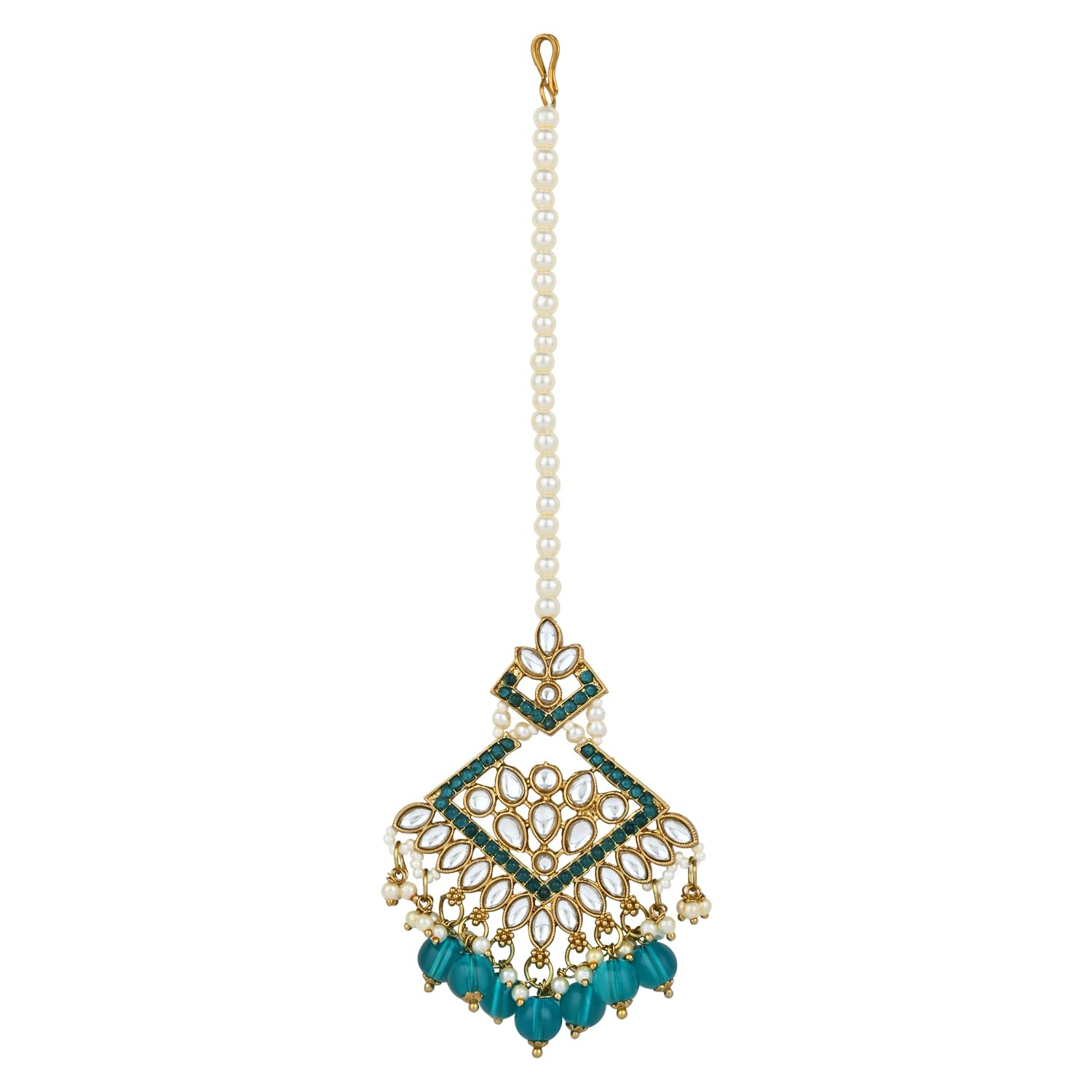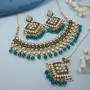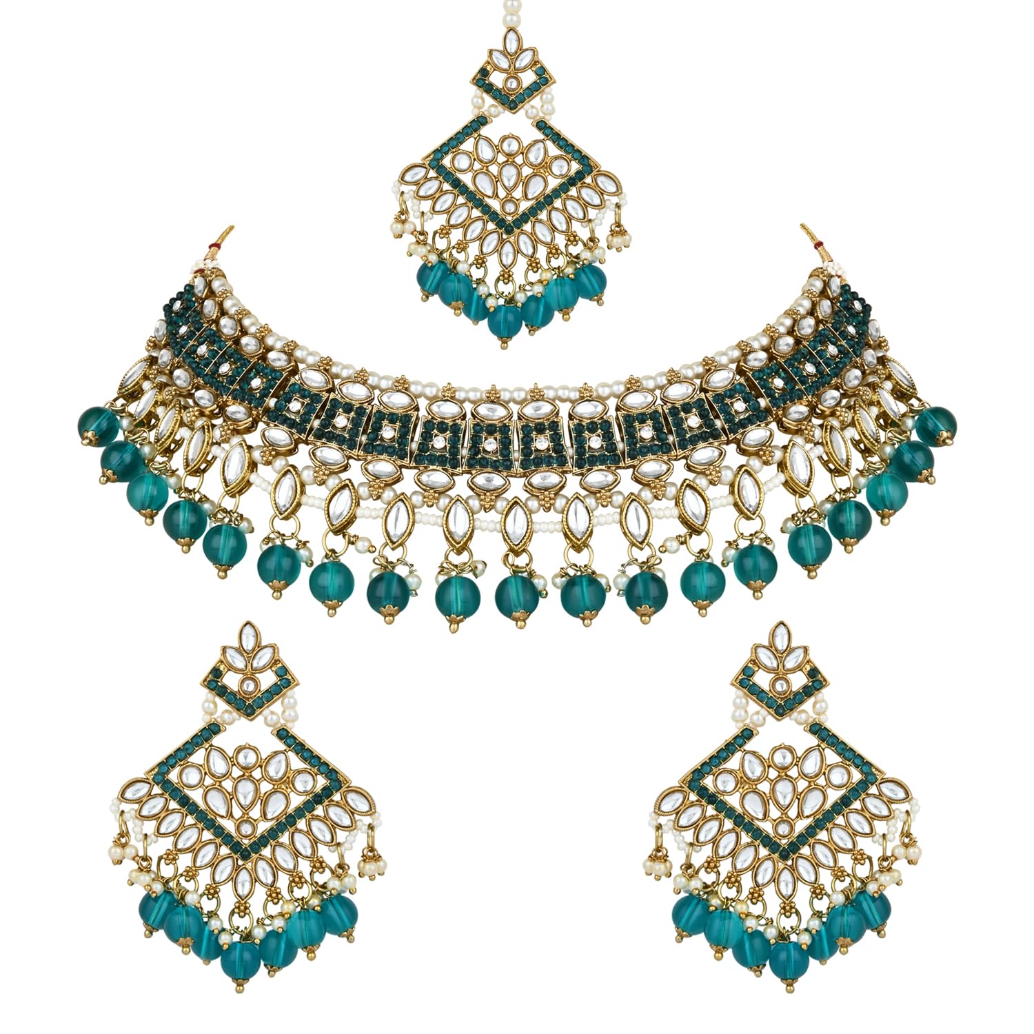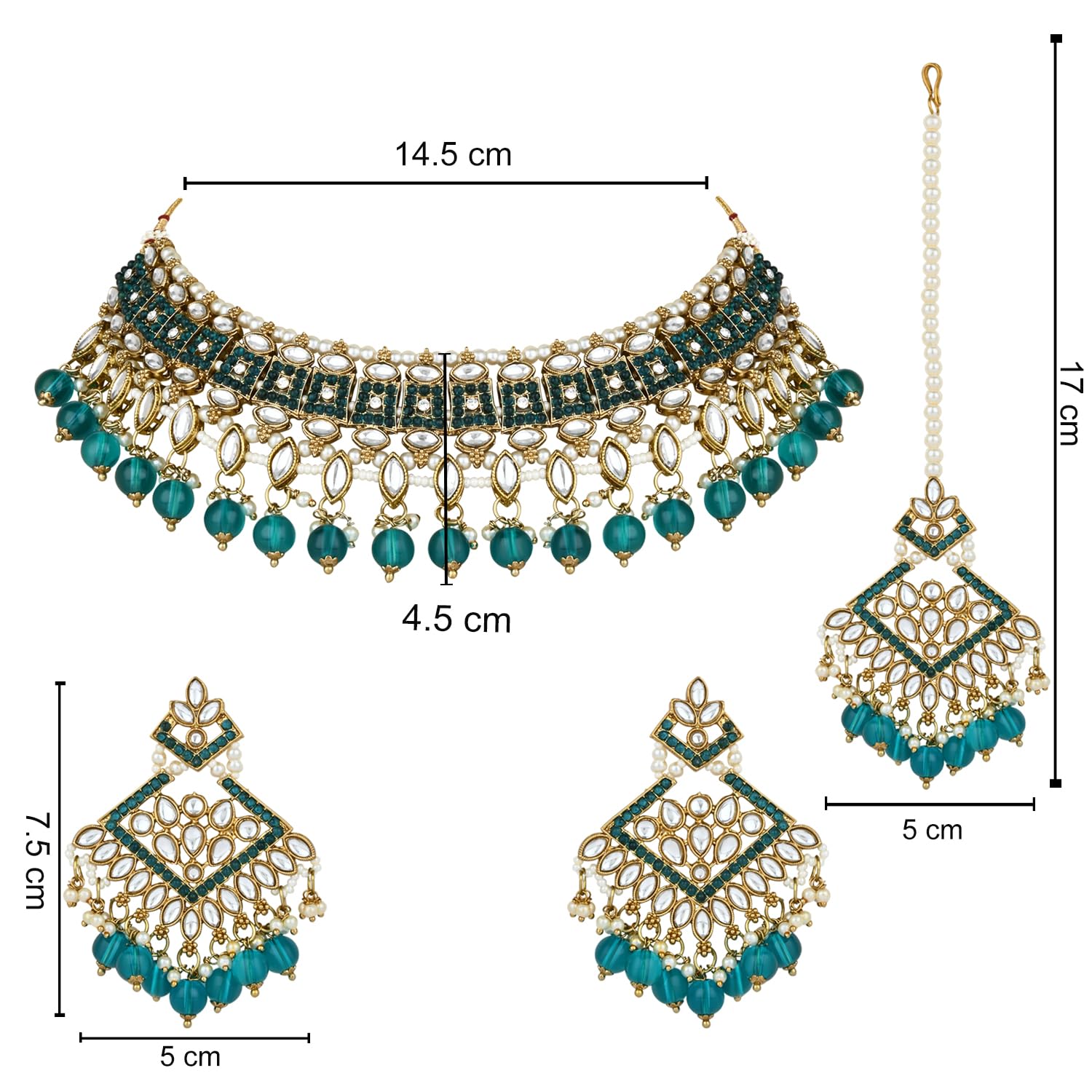 The gold-plated choker necklace set consists of a necklace a pair of earrings and a maang tikka. The necklace features kundan studded with pearl beaded in it giving it an elegant and traditional look. The stones and pearls are set in a beautiful pattern adding a touch of sophistication and grace to the necklace. The necklace is secured with drawstring closures which make it easy to adjust the size to fit comfortably around the neck. This is an important feature as it ensures that the necklace will be comfortable to wear for extended periods of time. The necklace is secured with drawstring closures which make it easy to adjust the size to fit comfortably around the neck. This is an important feature as it ensures that the necklace will be comfortable to wear for extended periods of time. The earrings and maang tikka are also adorned with stones and pearls which match the pattern of the necklace. The earrings have a beautiful design which makes them easy and comfortable to wear. The maang tikka is a traditional Indian hair accessory that can be worn with the necklace and earrings to complete the look.