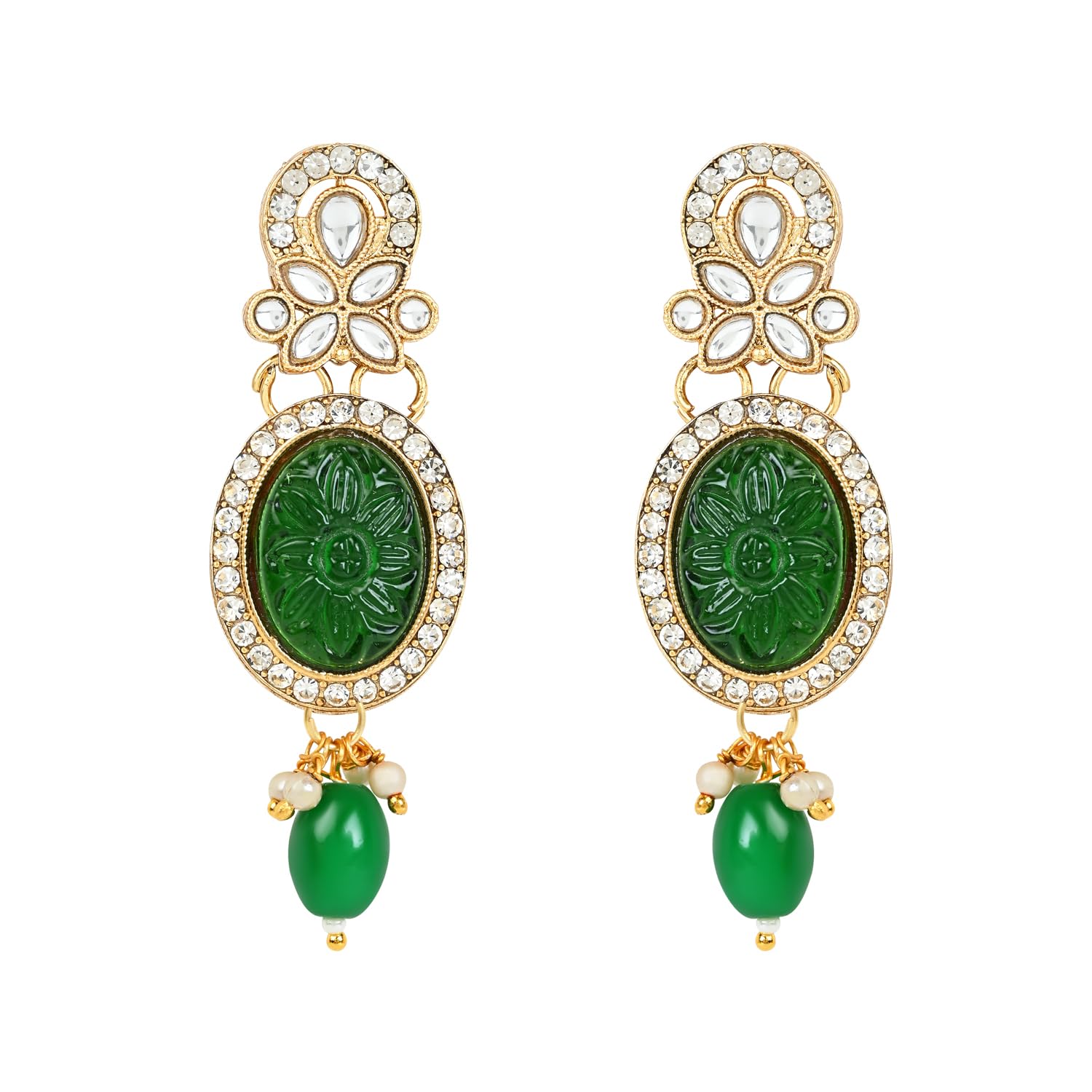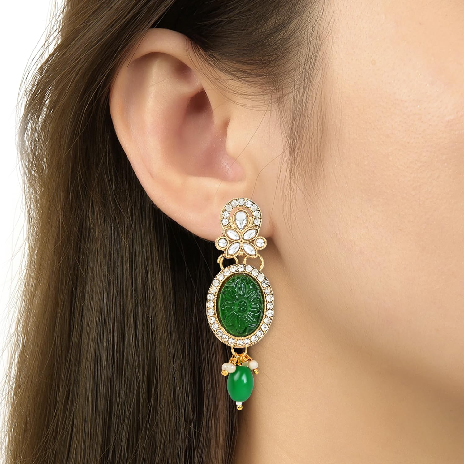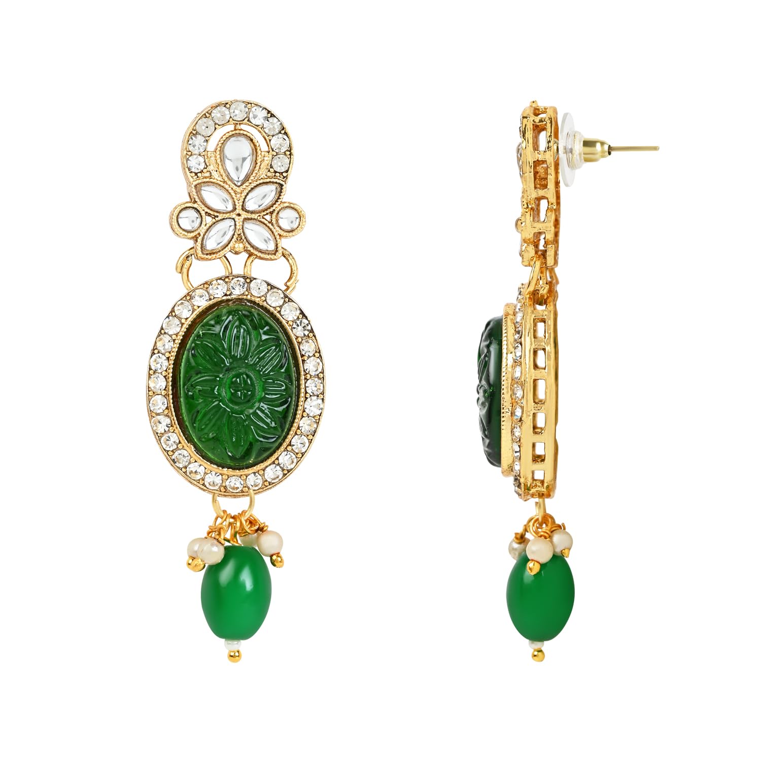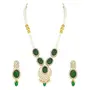 The gold-plated choker necklace set consists of a necklace a pair of earrings and a maang tikka. The necklace features kundan studded with pearl beaded in it giving it an elegant and traditional look. The stones and pearls are set in a beautiful pattern adding a touch of sophistication and grace to the necklace. The necklace is secured with drawstring closures which make it easy to adjust the size to fit comfortably around the neck. This is an important feature as it ensures that the necklace will be comfortable to wear for extended periods of time. The necklace is secured with drawstring closures which make it easy to adjust the size to fit comfortably around the neck. This is an important feature as it ensures that the necklace will be comfortable to wear for extended periods of time. The earrings and maang tikka are also adorned with stones and pearls which match the pattern of the necklace. The earrings have a beautiful design which makes them easy and comfortable to wear. The maang tikka is a traditional Indian hair accessory that can be worn with the necklace and earrings to complete the look.
