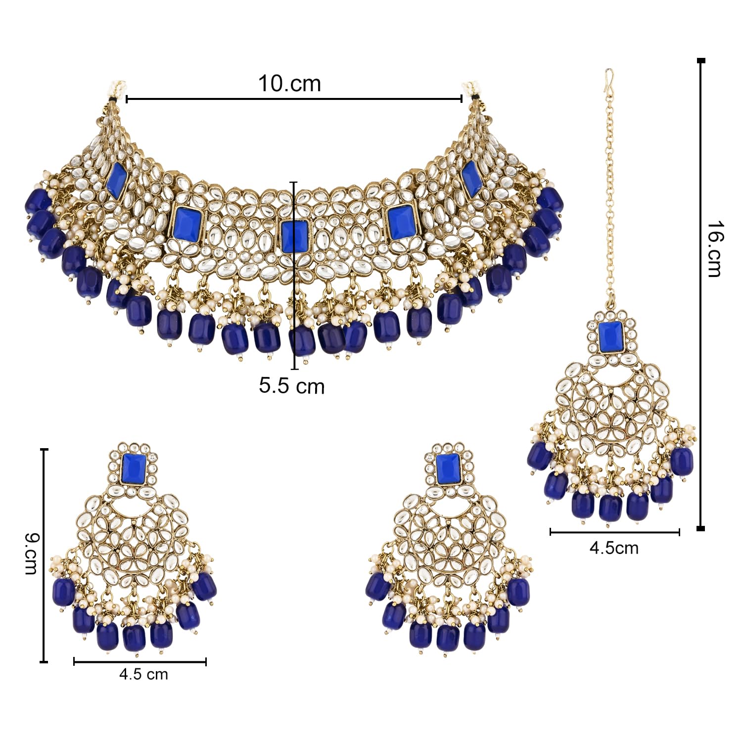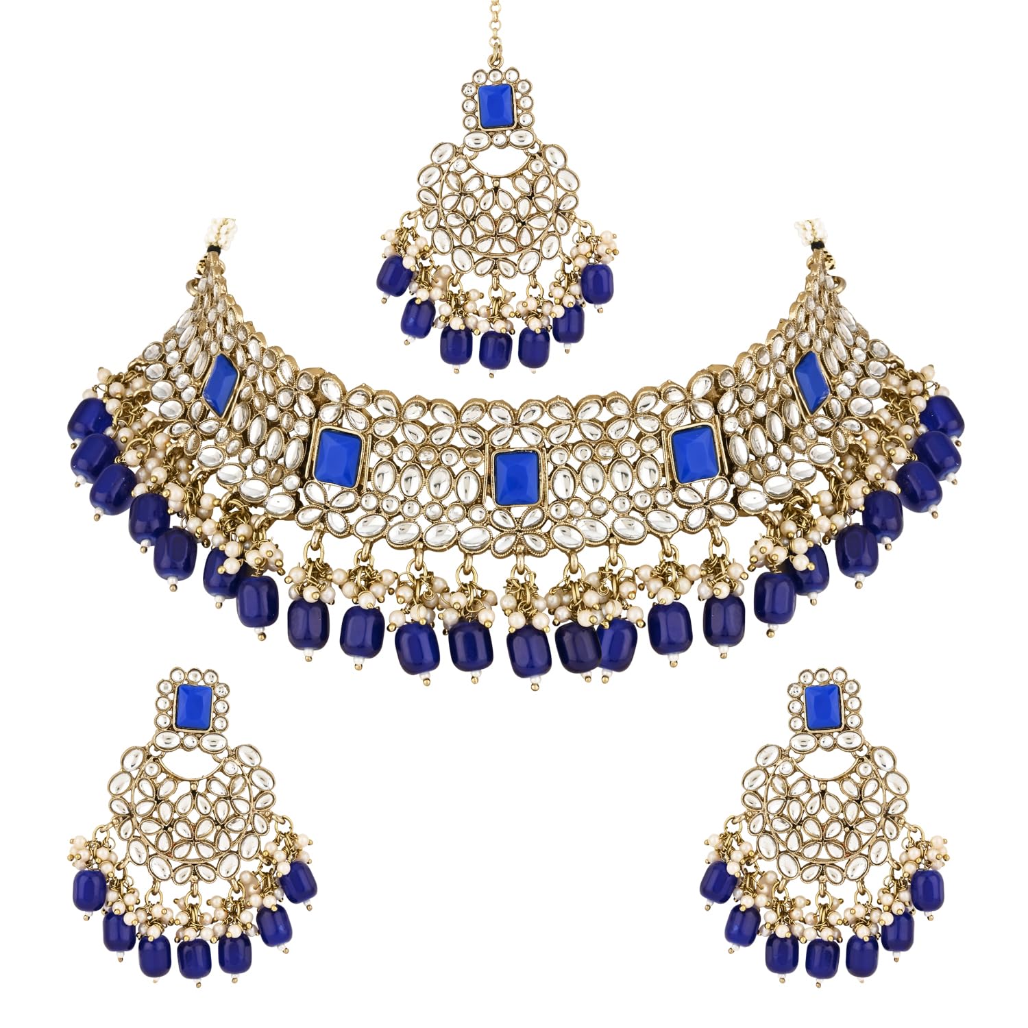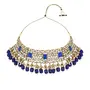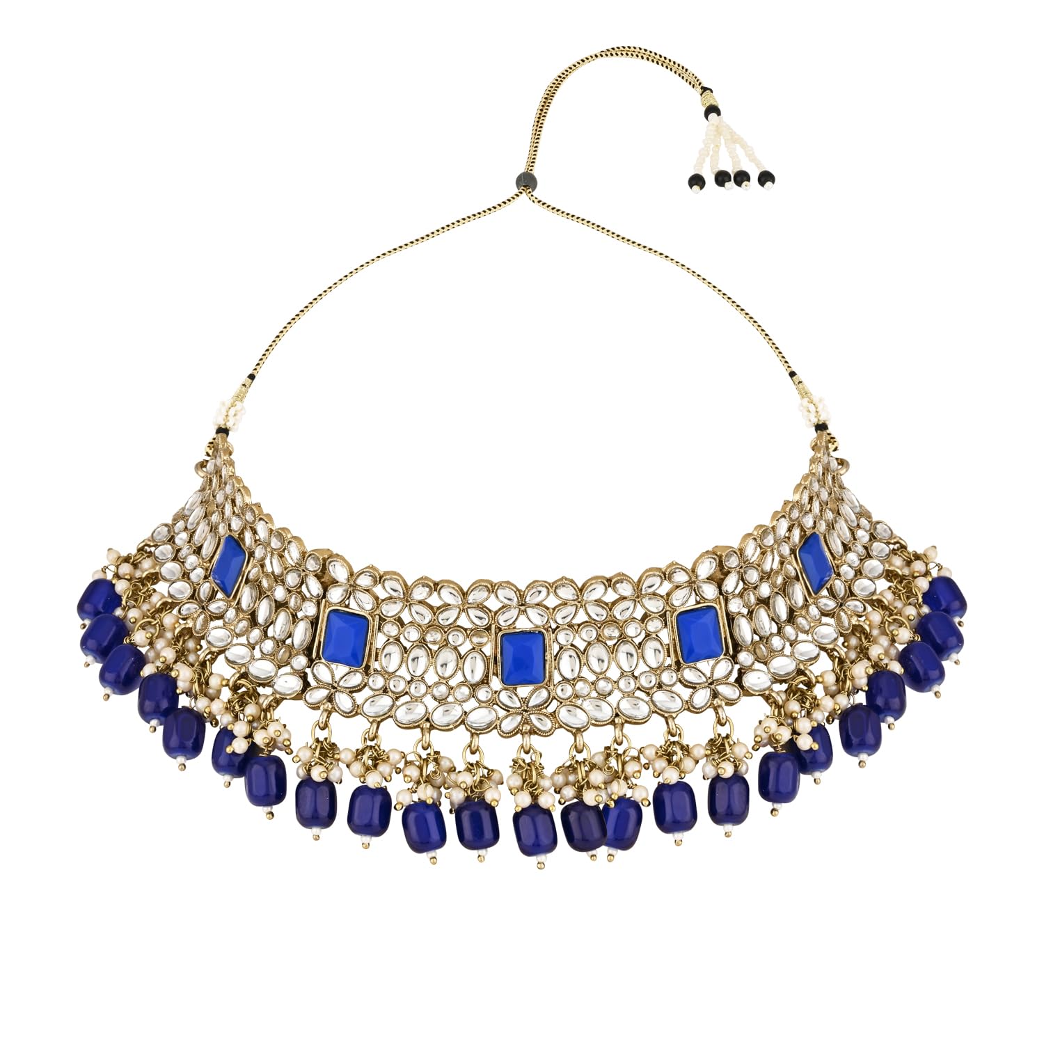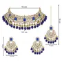 This jewellery set is crafted in 18K gold plating traditional stone studded necklace and a pair of earrings. The necklace feature stone studded in it and is secured with a drawstring closures. Style this necklace set with a saree or a salwar suit to enhance the look.
