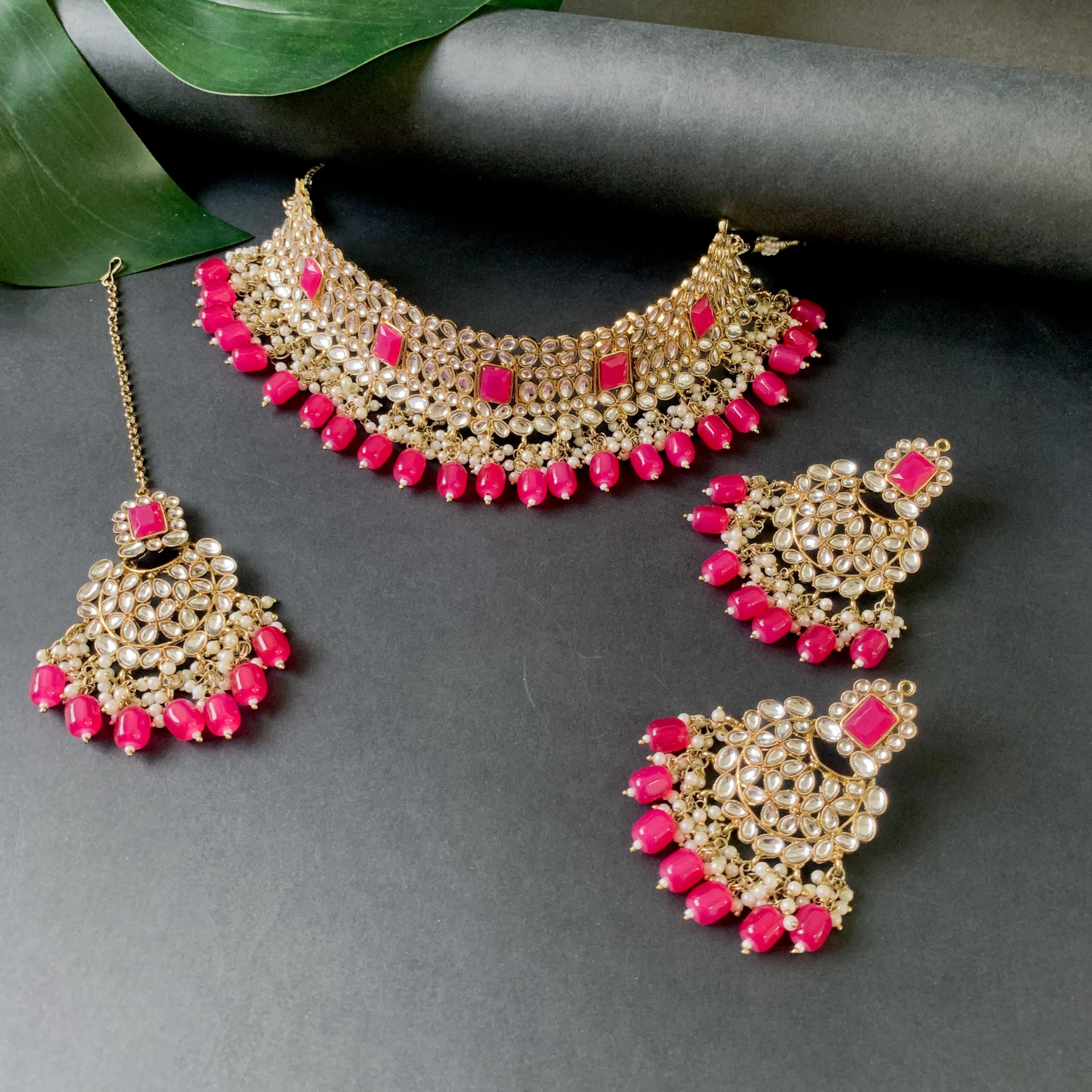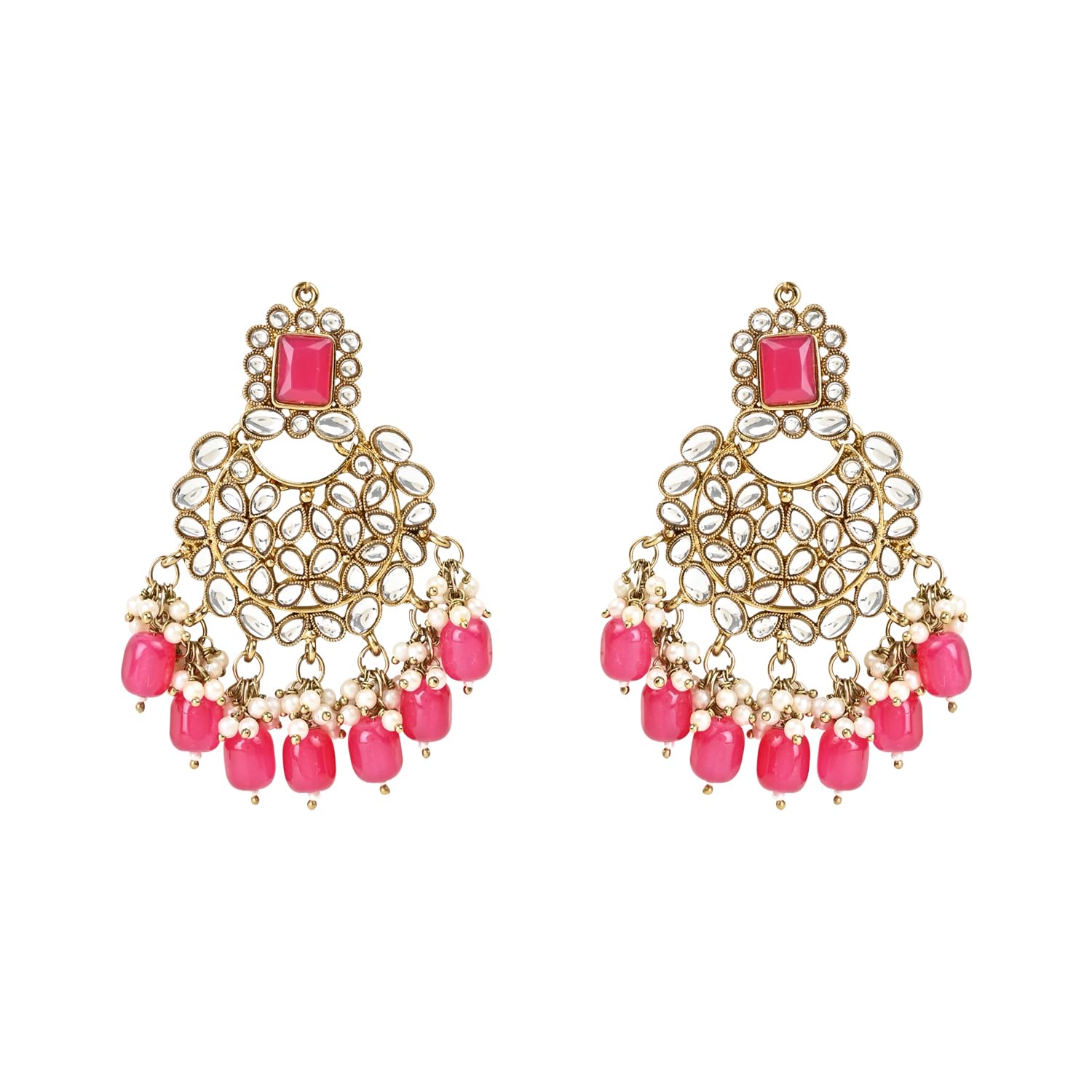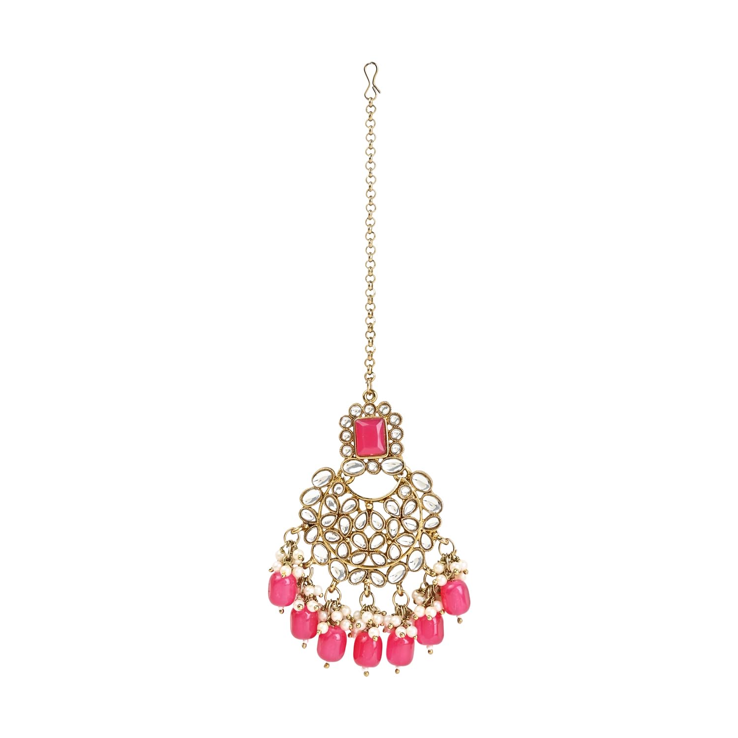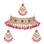 This jewellery set is crafted in 18K gold plating traditional stone studded necklace and a pair of earrings. The necklace feature stone studded in it and is secured with a drawstring closures. Style this necklace set with a saree or a salwar suit to enhance the look.
