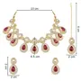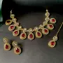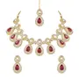 The gold-plated choker necklace set consists of a necklace a pair of earrings and a maang tikka. The necklace features kundan studded with pearl beaded in it giving it an elegant and traditional look. The stones and pearls are set in a beautiful pattern adding a touch of sophistication and grace to the necklace. The necklace is secured with drawstring closures which make it easy to adjust the size to fit comfortably around the neck. This is an important feature as it ensures that the necklace will be comfortable to wear for extended periods of time. The necklace is secured with drawstring closures which make it easy to adjust the size to fit comfortably around the neck. This is an important feature as it ensures that the necklace will be comfortable to wear for extended periods of time. The earrings and maang tikka are also adorned with stones and pearls which match the pattern of the necklace. The earrings have a beautiful design which makes them easy and comfortable to wear. The maang tikka is a traditional Indian hair accessory that can be worn with the necklace and earrings to complete the look.