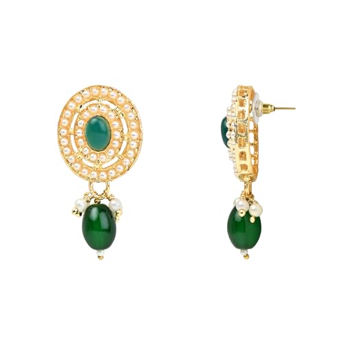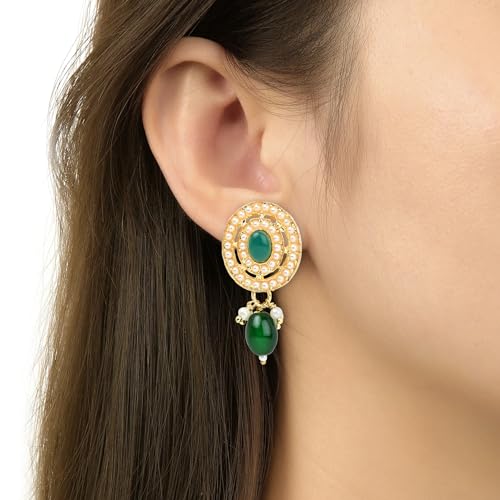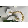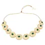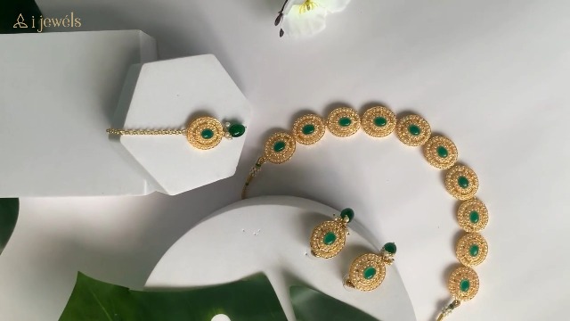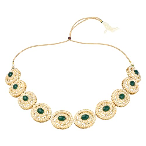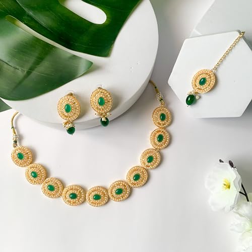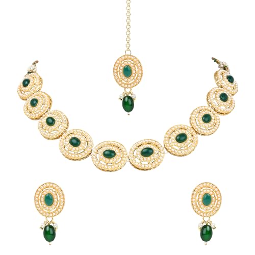 The gold-plated choker necklace set consists of a necklace a pair of earrings and a maang tikka. The necklace features kundan studded with pearl beaded in it giving it an elegant and traditional look. The stones and pearls are set in a beautiful pattern adding a touch of sophistication and grace to the necklace. The necklace is secured with drawstring closures which make it easy to adjust the size to fit comfortably around the neck. This is an important feature as it ensures that the necklace will be comfortable to wear for extended periods of time. The necklace is secured with drawstring closures which make it easy to adjust the size to fit comfortably around the neck. This is an important feature as it ensures that the necklace will be comfortable to wear for extended periods of time. The earrings and maang tikka are also adorned with stones and pearls which match the pattern of the necklace. The earrings have a beautiful design which makes them easy and comfortable to wear. The maang tikka is a traditional Indian hair accessory that can be worn with the necklace and earrings to complete the look.