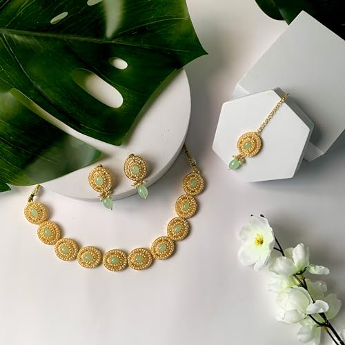 This set includes matching earrings and a Maang Tikka each meticulously designed to harmonize with the necklace. Together they create a harmonious and regal look. The Maang Tikka adds a touch of traditional charm making it the perfect choice for weddings festivals and cultural ceremonies. Whether it's a wedding festival or a special gathering this jewelry set is designed to make you stand out. Its timeless charm effortlessly elevates any outfit making it the perfect choice for women and girls who appreciate both tradition and sophistication.