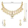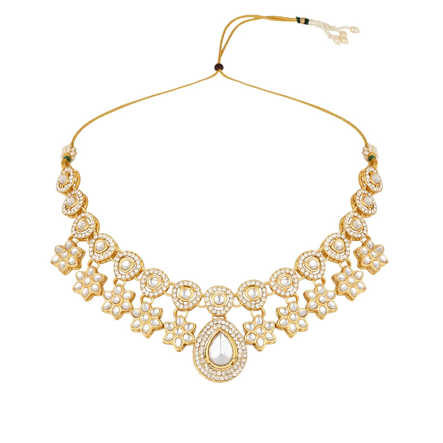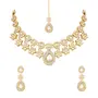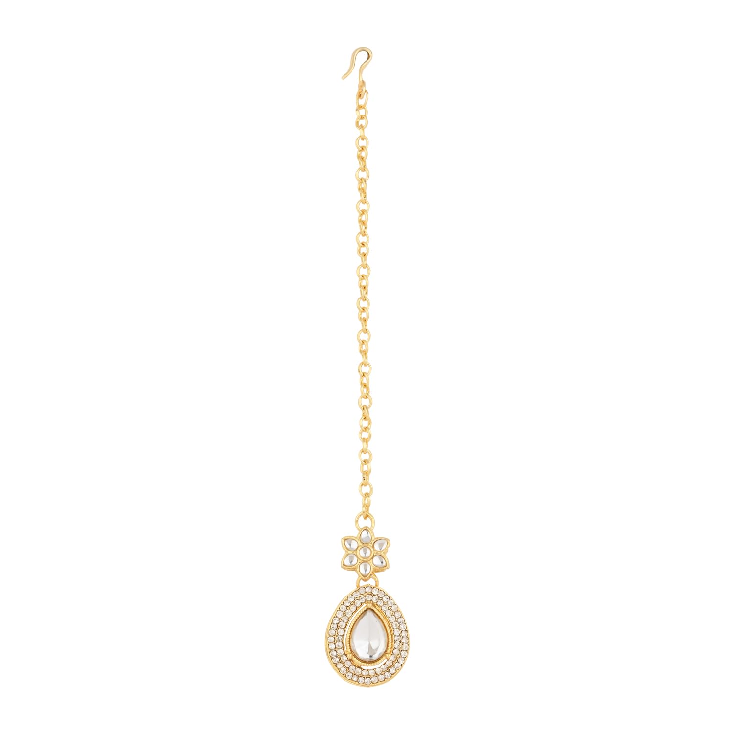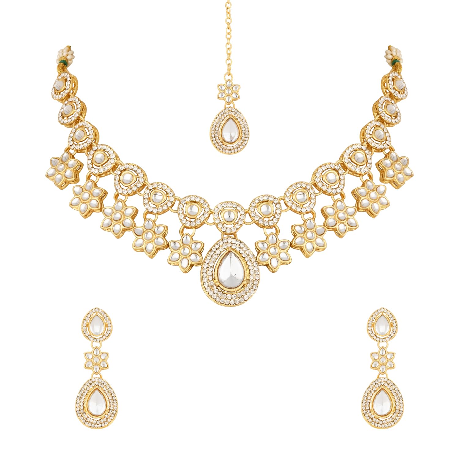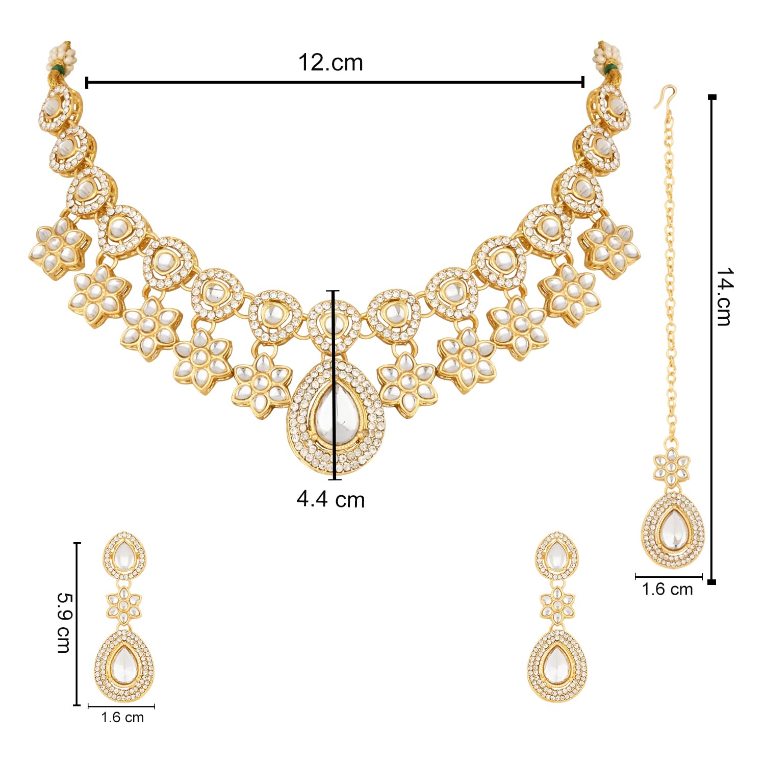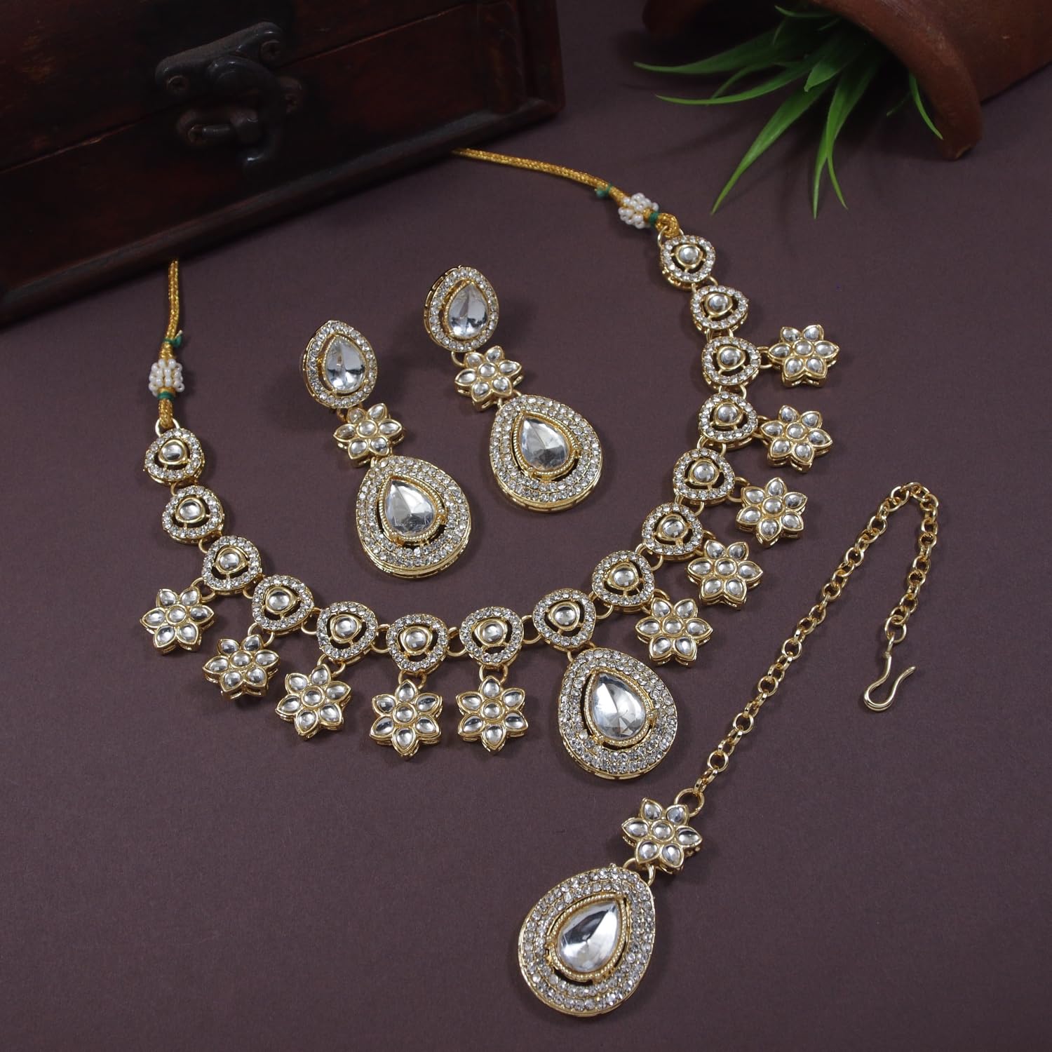 This choker necklace earrings and Maang Tikka set epitomizes traditional Indian jewelry craftsmanship at its finest. It's a nod to the timeless charm of Kundan and stone-studded designs that have been cherished for generations. The centerpiece of this set is the intricate Kundan work. Carefully selected Kundan stones are arranged in an elegant pattern surrounded by smaller hand-set stones that add a dazzling brilliance. The intricate details reflect the artistry of traditional Indian jewelry design. Whether it's your wedding day a festival or a special gathering this set is designed to make you stand out. It's a perfect choice for any traditional event radiating elegance and opulence.