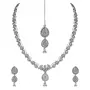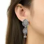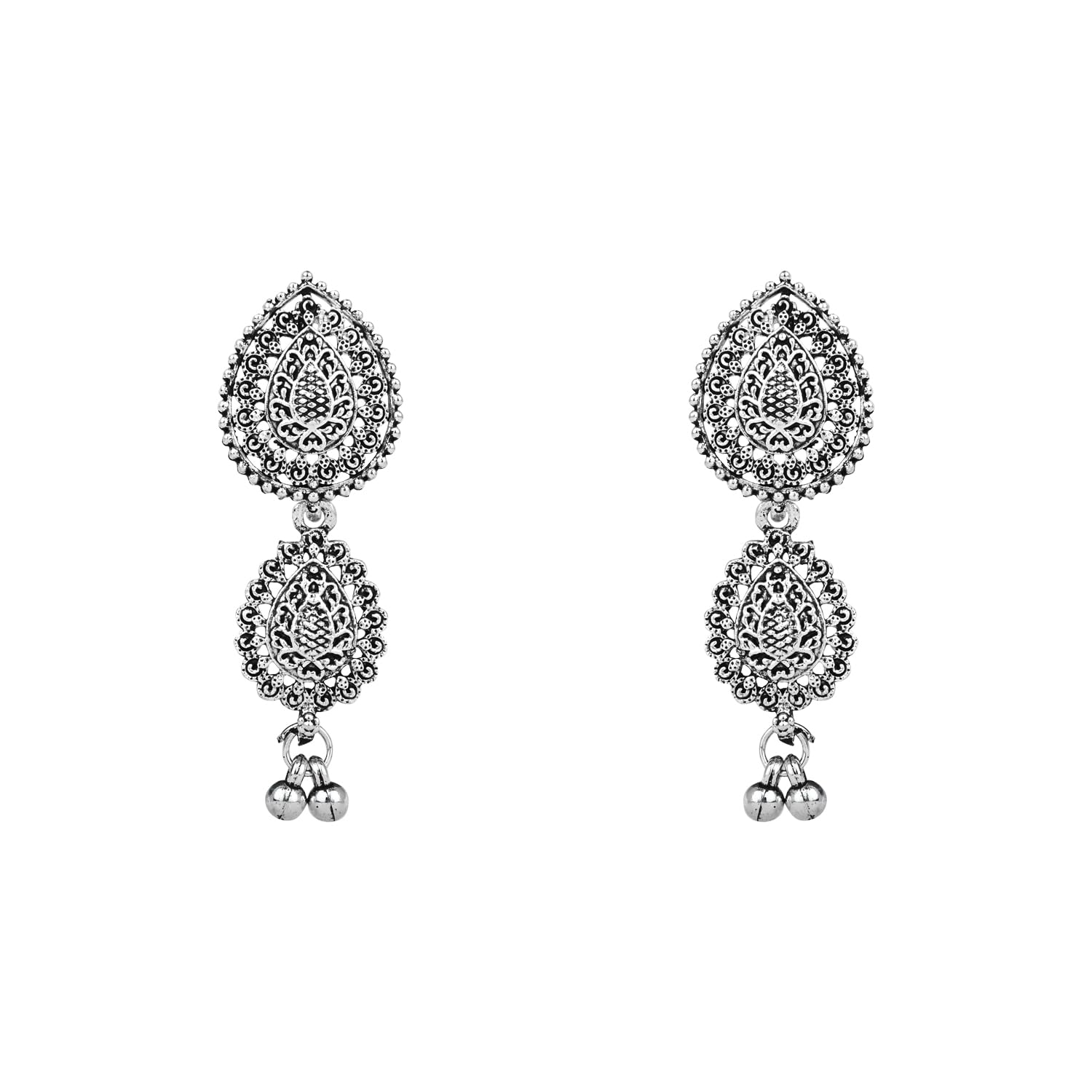 DIMENSION: Necklace Length - 27 cm x Width - 1 cm Earring Height - 5 cm x Width - 1.7 cm Maang Tikka Height - 15 cm x Width - 1.7 cm. Embrace the festive spirit with this exquisite jewelry set featuring a beautiful floral design and delicate ghungroos (small bells). This set includes a stylish long necklace and matching jhumka earrings. The necklace complements various necklines draping gracefully around your neck. The pendant boasts intricate floral detailing making it a noticeable centerpiece. The accompanying earrings are a perfect match striking the right balance between size and comfort. The oxidized silver finish adds a rustic charm to the set making it a timeless addition to your collection. Celebrate Navratri in style and grace with this jewelry set that truly embodies the spirit of the season.