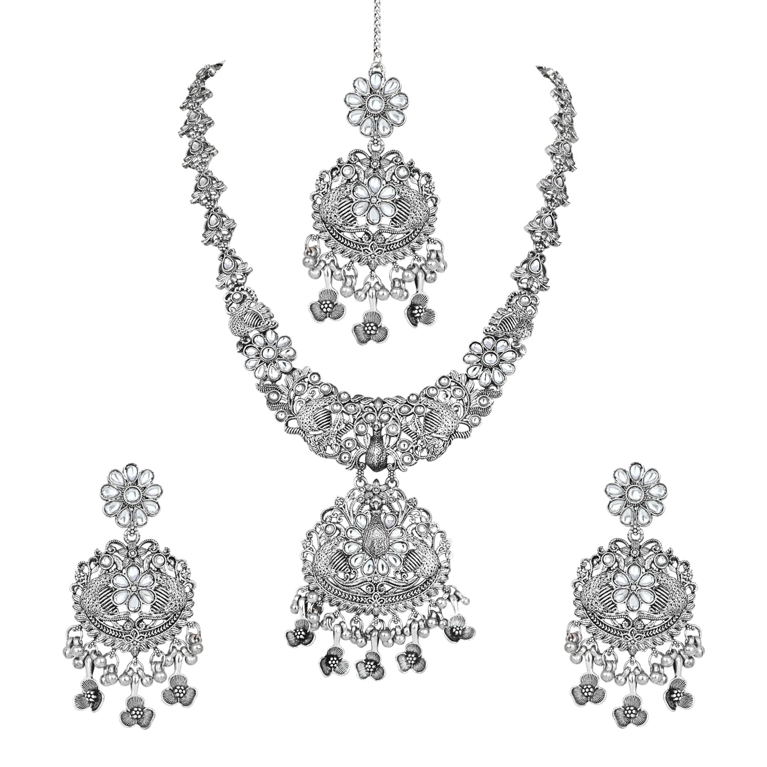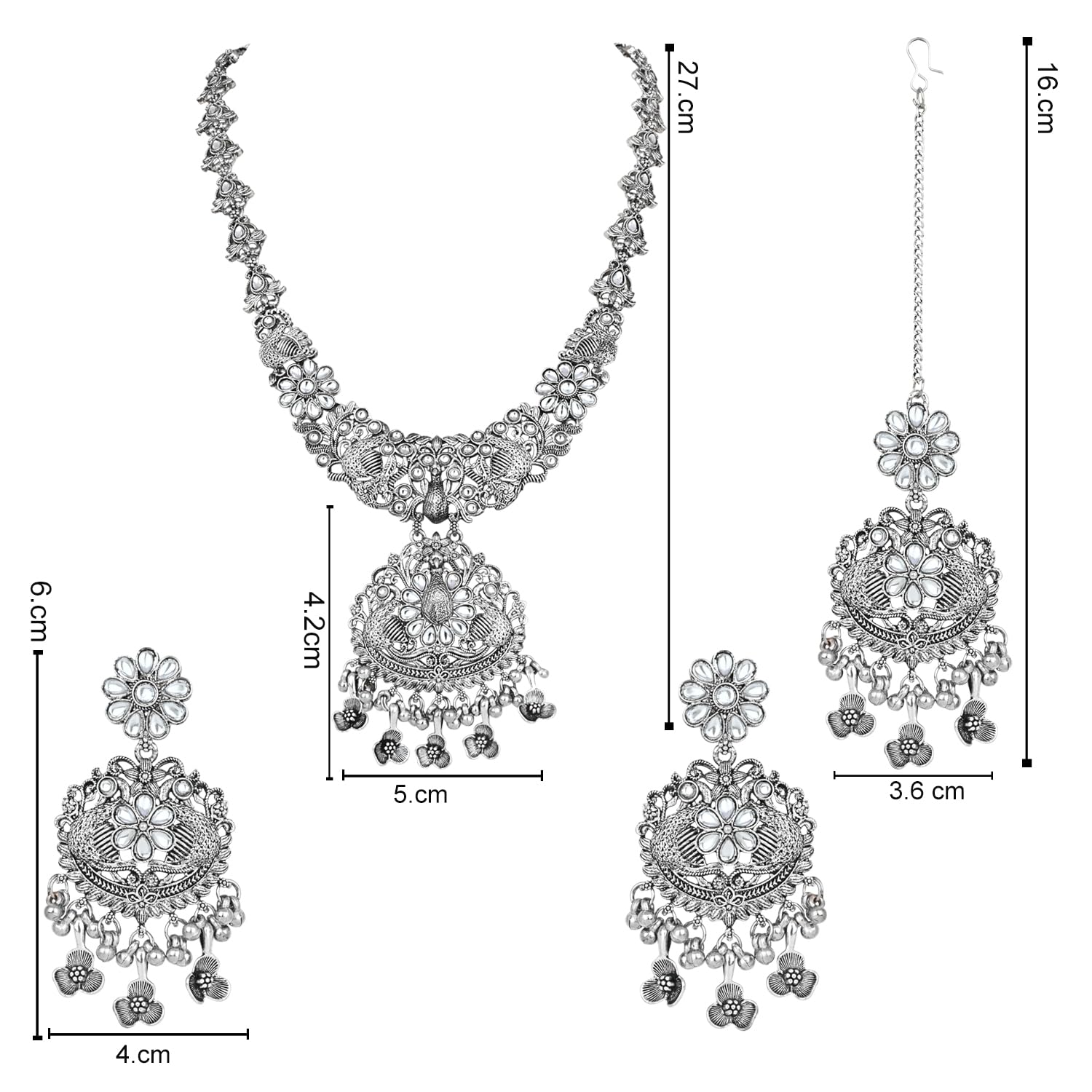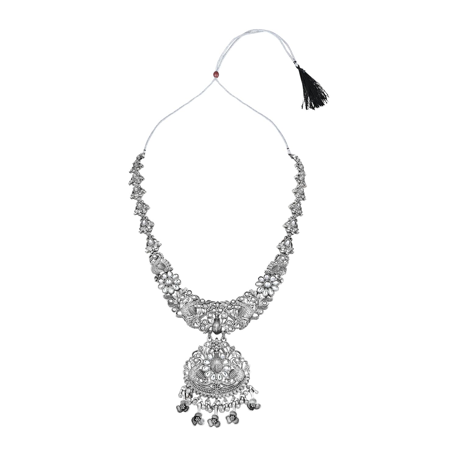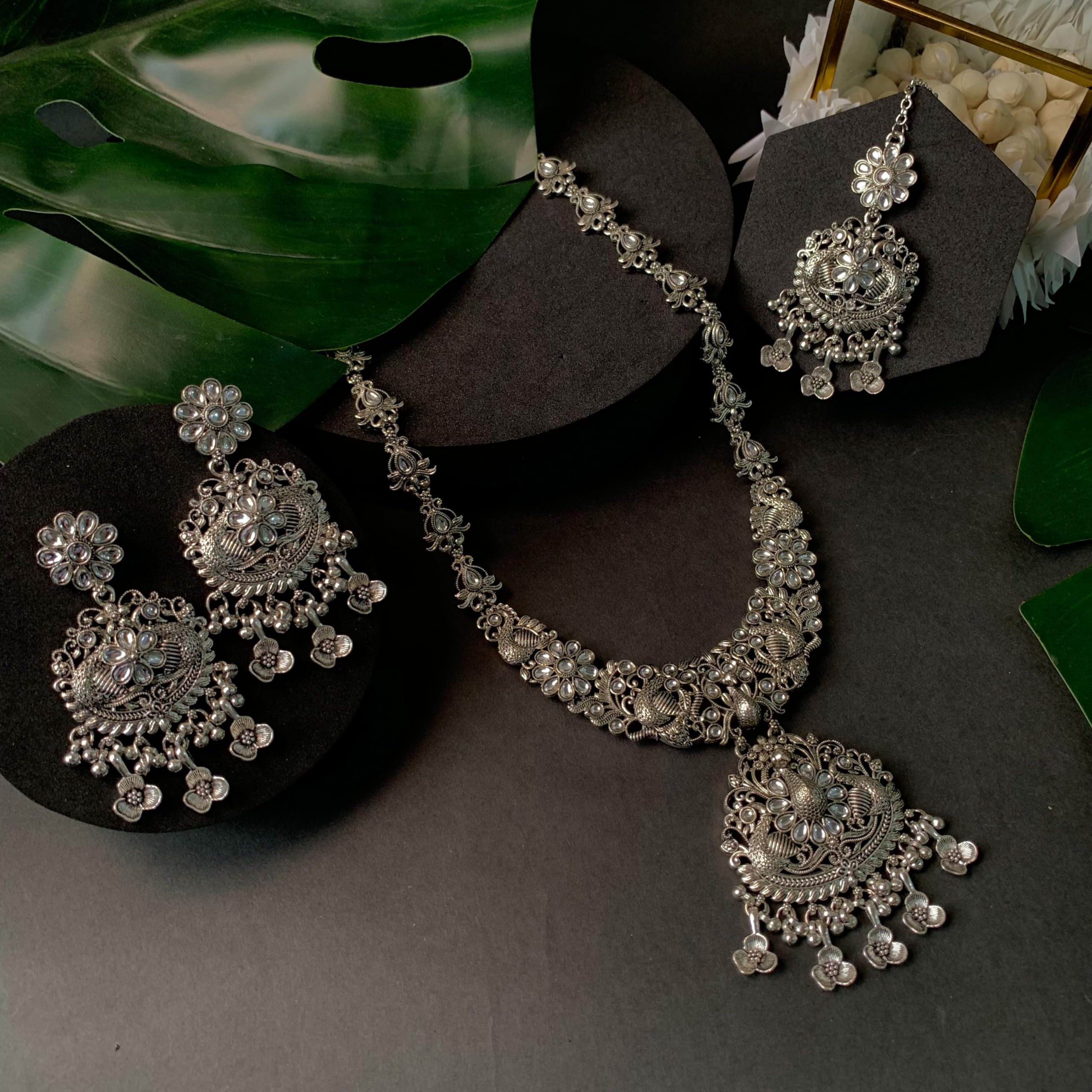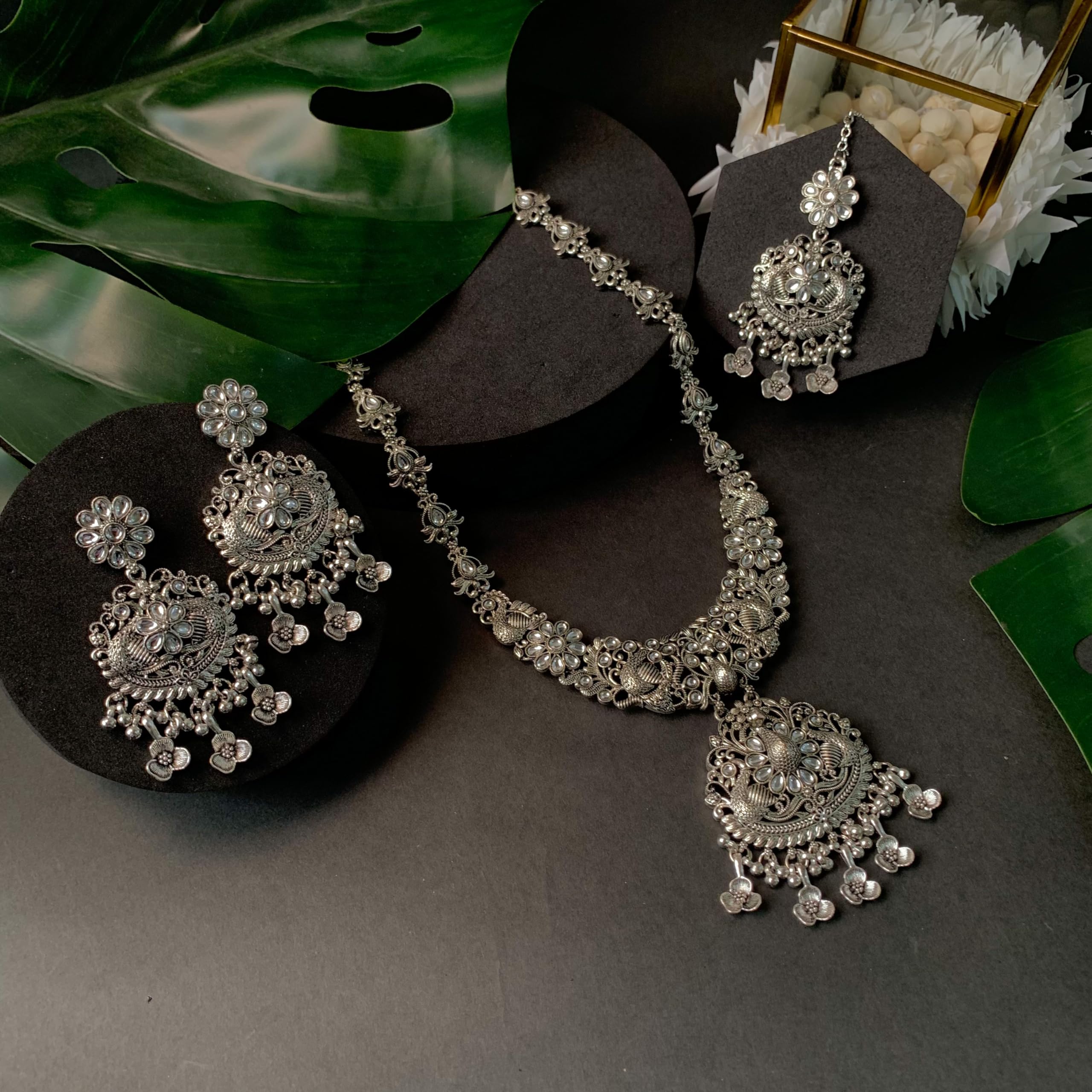 The silver oxidised necklace set consists of a necklace and a pair of earrings This stunning necklace set embodies the beauty of the ages with its oxidized metal finish that gives it a sense of timeless elegance. The intricately designed pendant tell a story of craftsmanship and artistry while the long chain drapes gracefully adding a touch of sophistication to any outfit The dark antiqued finish of the metal adds a touch of mystique echoing the aura of the festival's traditional rituals.. Paired with matching earrings this set is a masterpiece that transcends trends making you the center of attention wherever you go.The long chain adds a contemporary twist to the set while the earrings capture the same adventurous essence. Wear this set as a testament to your adventurous soul and your ability to find beauty in every corner of the world.
