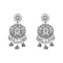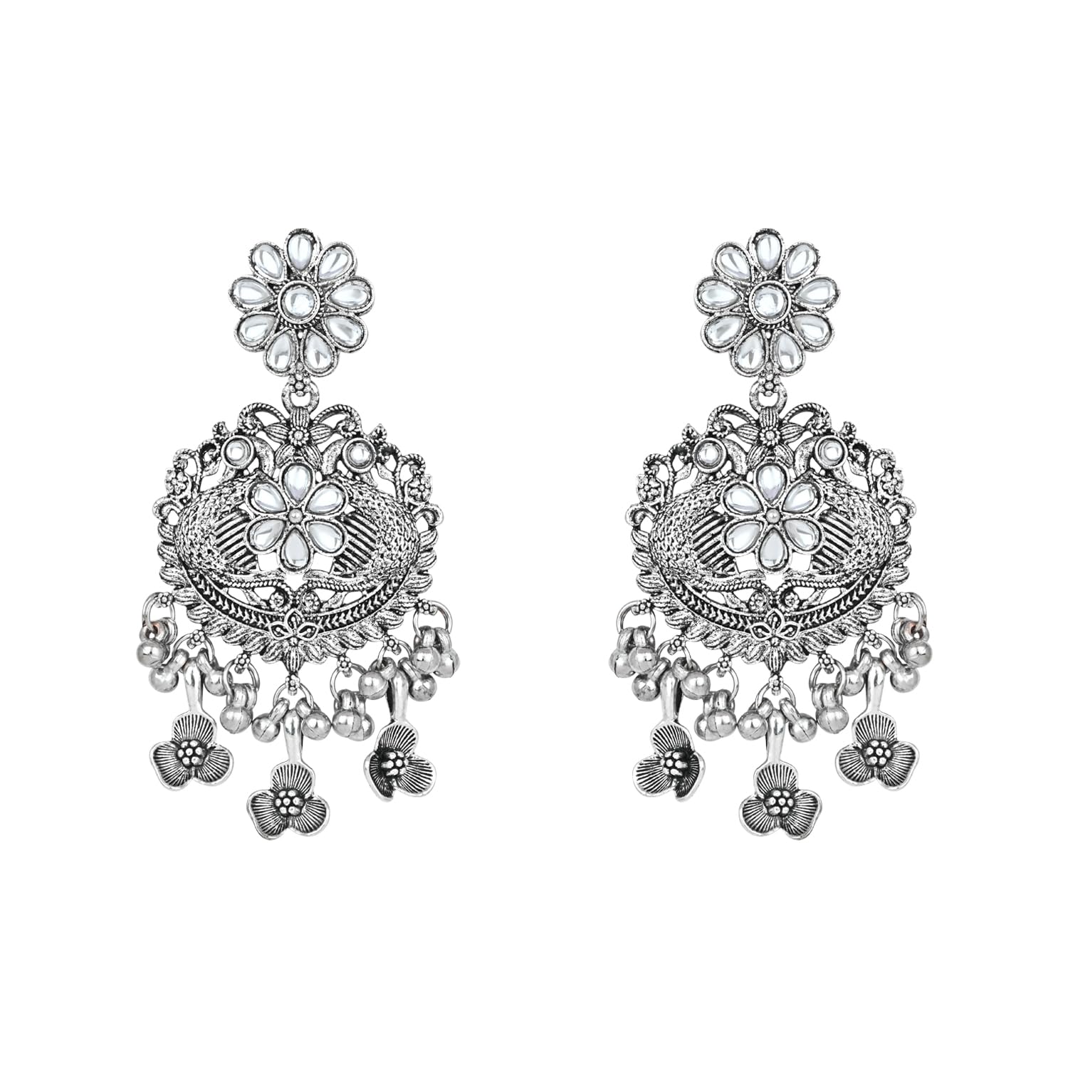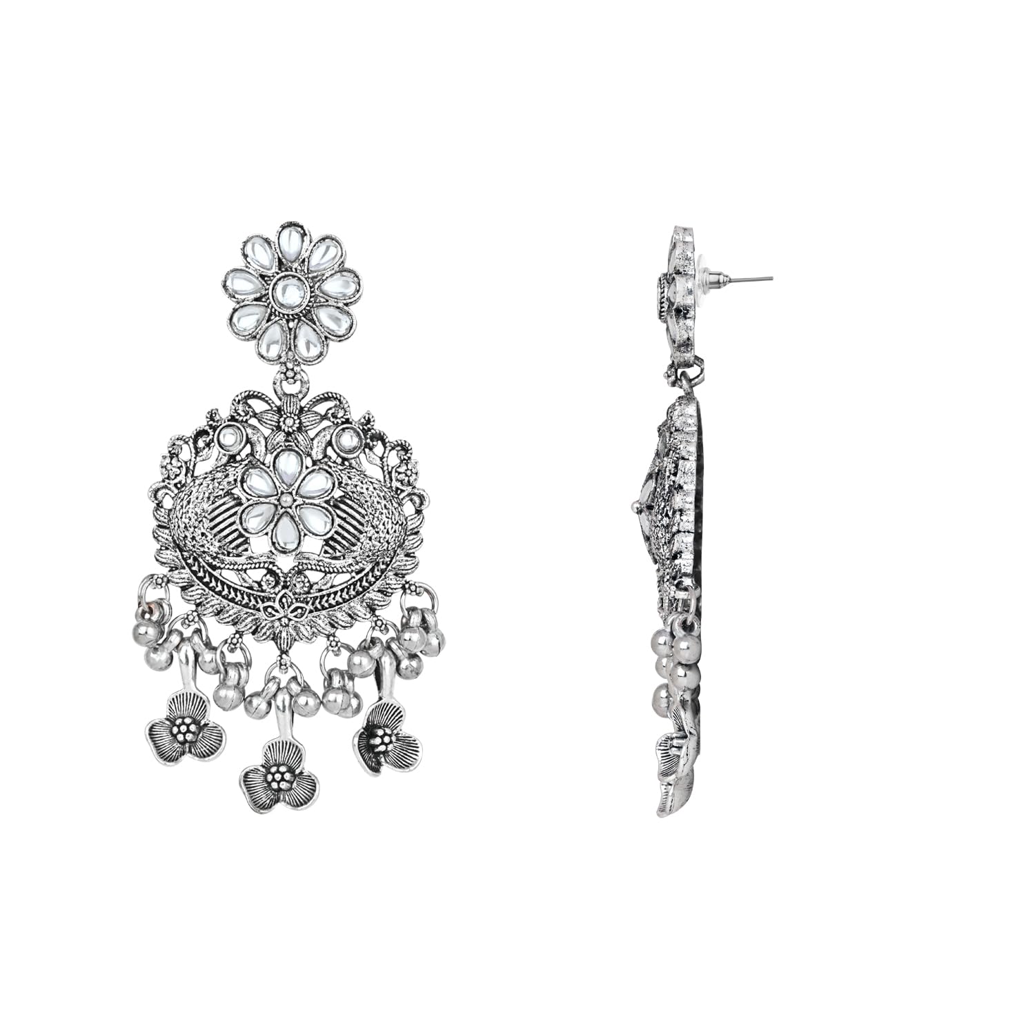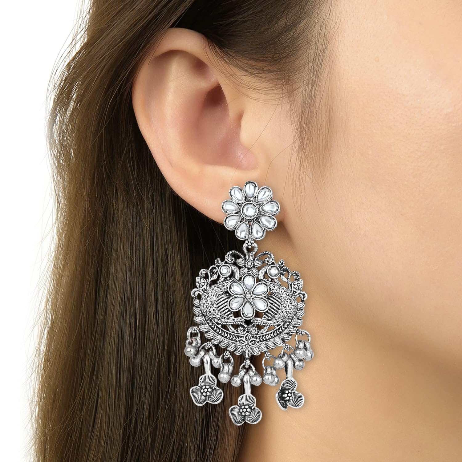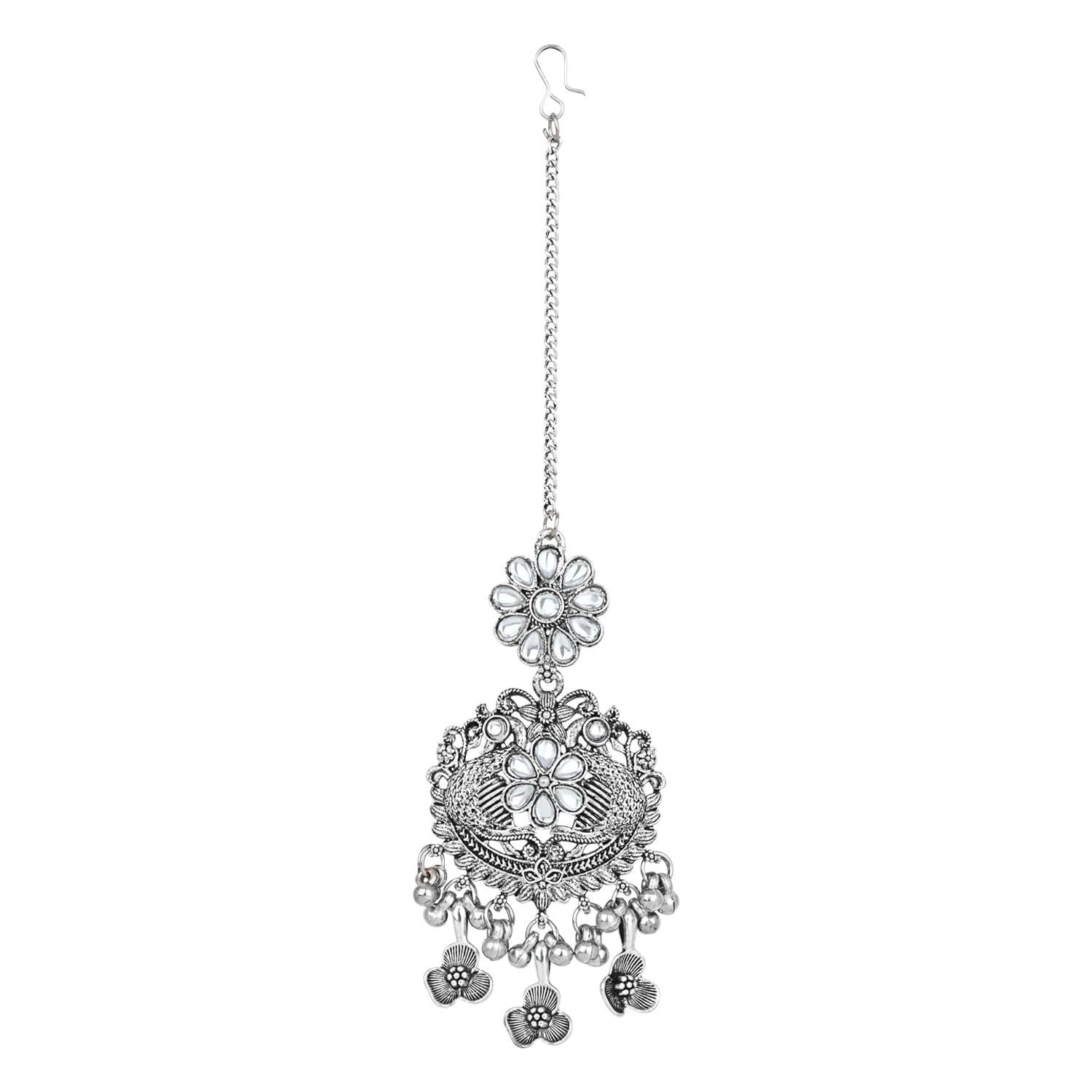 The silver oxidised necklace set consists of a necklace and a pair of earrings This stunning necklace set embodies the beauty of the ages with its oxidized metal finish that gives it a sense of timeless elegance. The intricately designed pendant tell a story of craftsmanship and artistry while the long chain drapes gracefully adding a touch of sophistication to any outfit The dark antiqued finish of the metal adds a touch of mystique echoing the aura of the festival's traditional rituals.. Paired with matching earrings this set is a masterpiece that transcends trends making you the center of attention wherever you go.The long chain adds a contemporary twist to the set while the earrings capture the same adventurous essence. Wear this set as a testament to your adventurous soul and your ability to find beauty in every corner of the world.