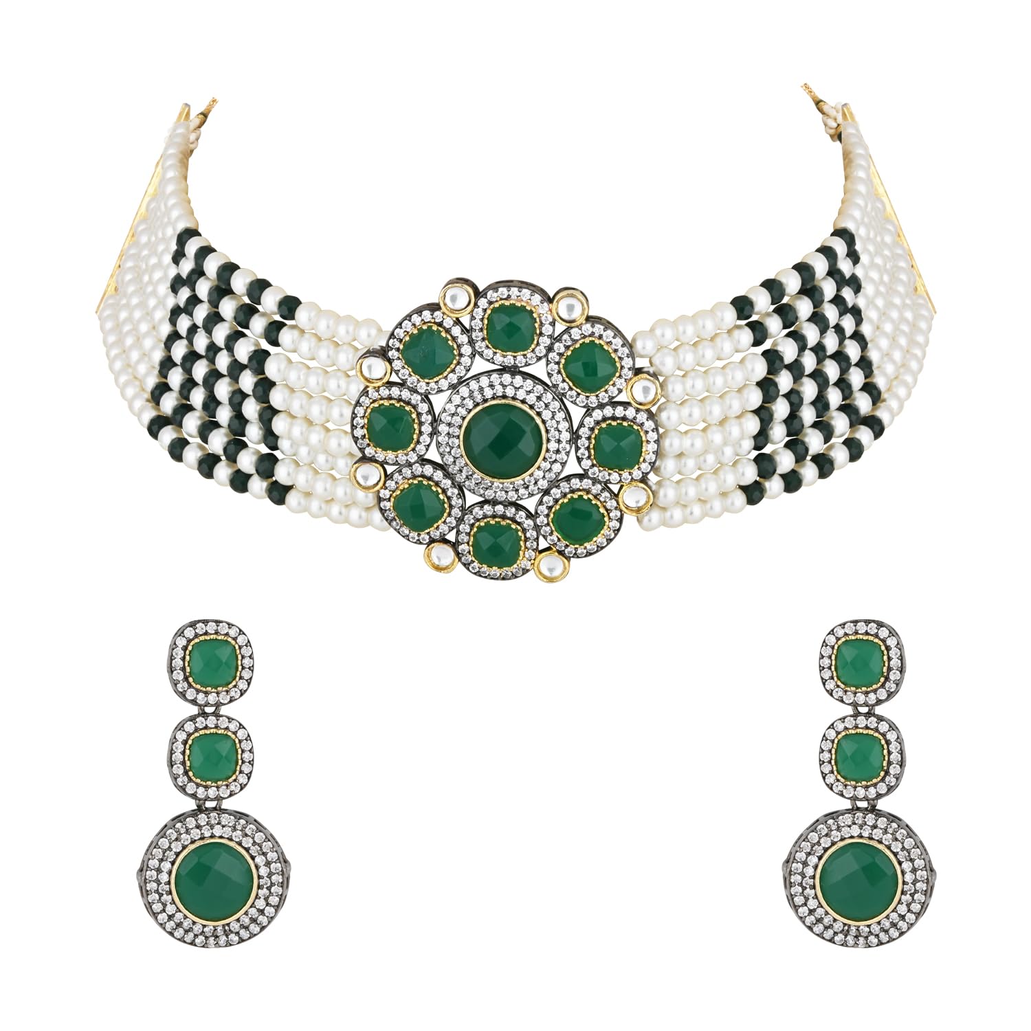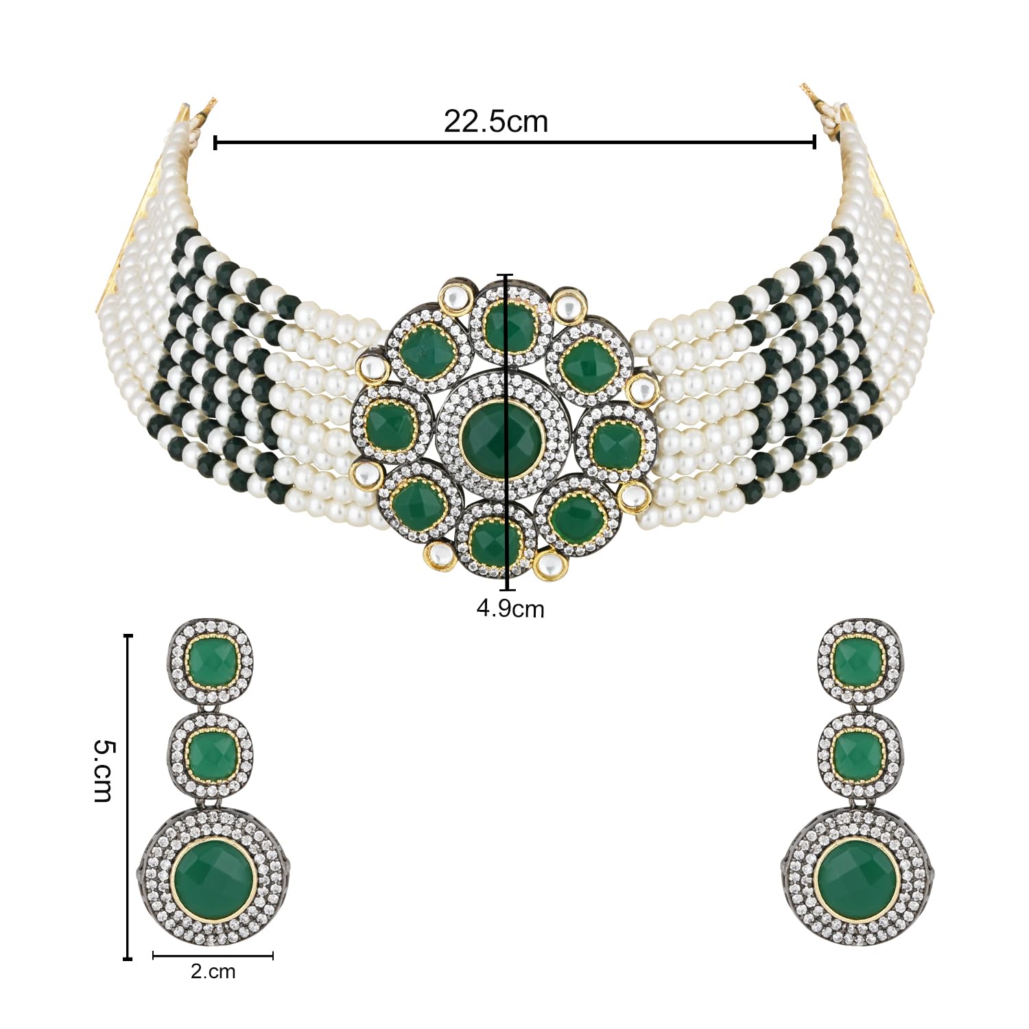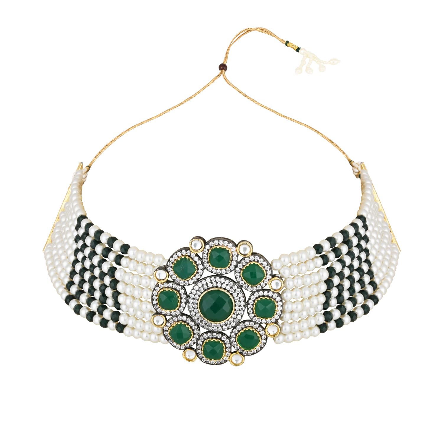 I Jewels Traditional Royal Kundan Pearl Stone Multistrand Design Green Choker Necklace Jewellery Set With Earrings For Women (ML336WG)