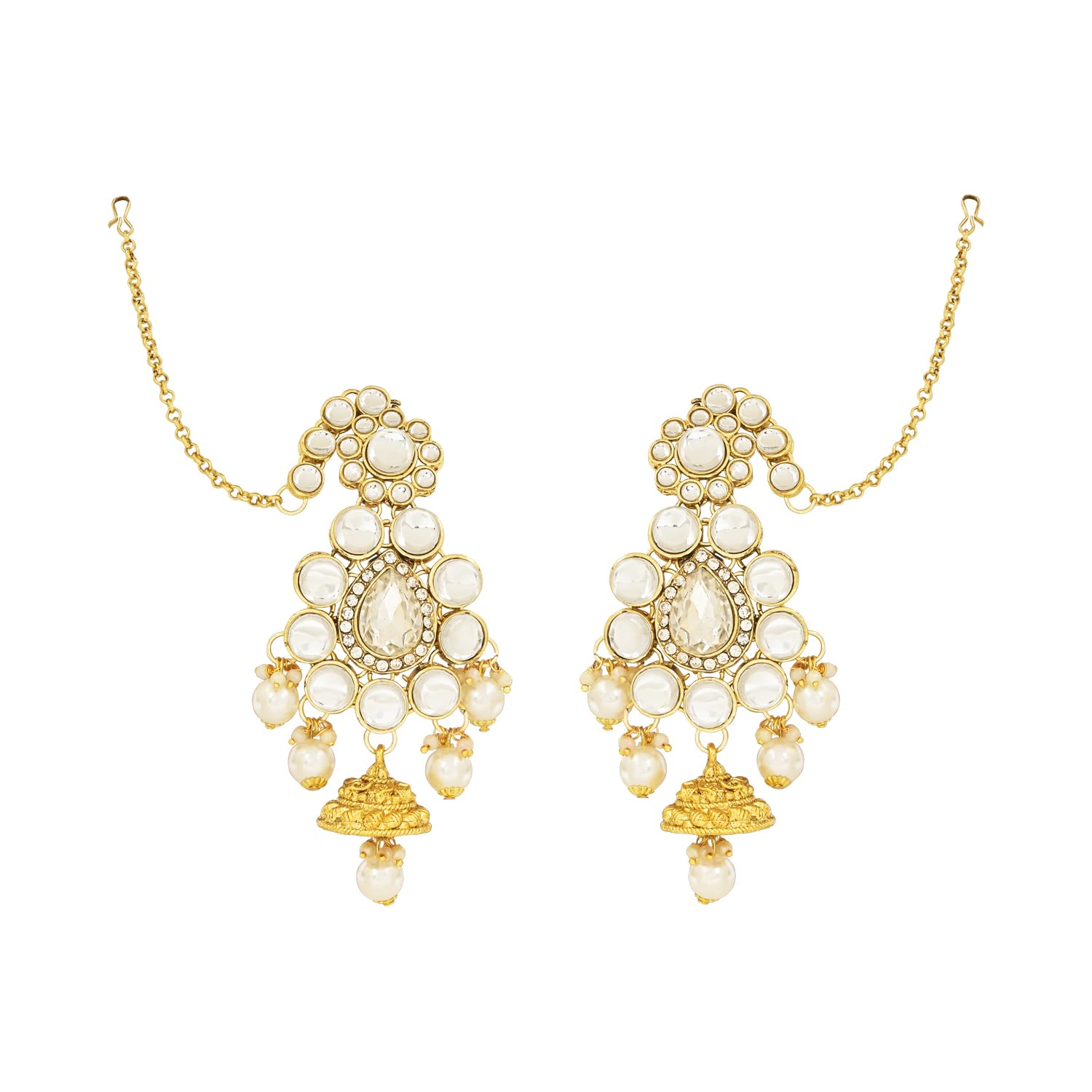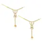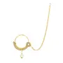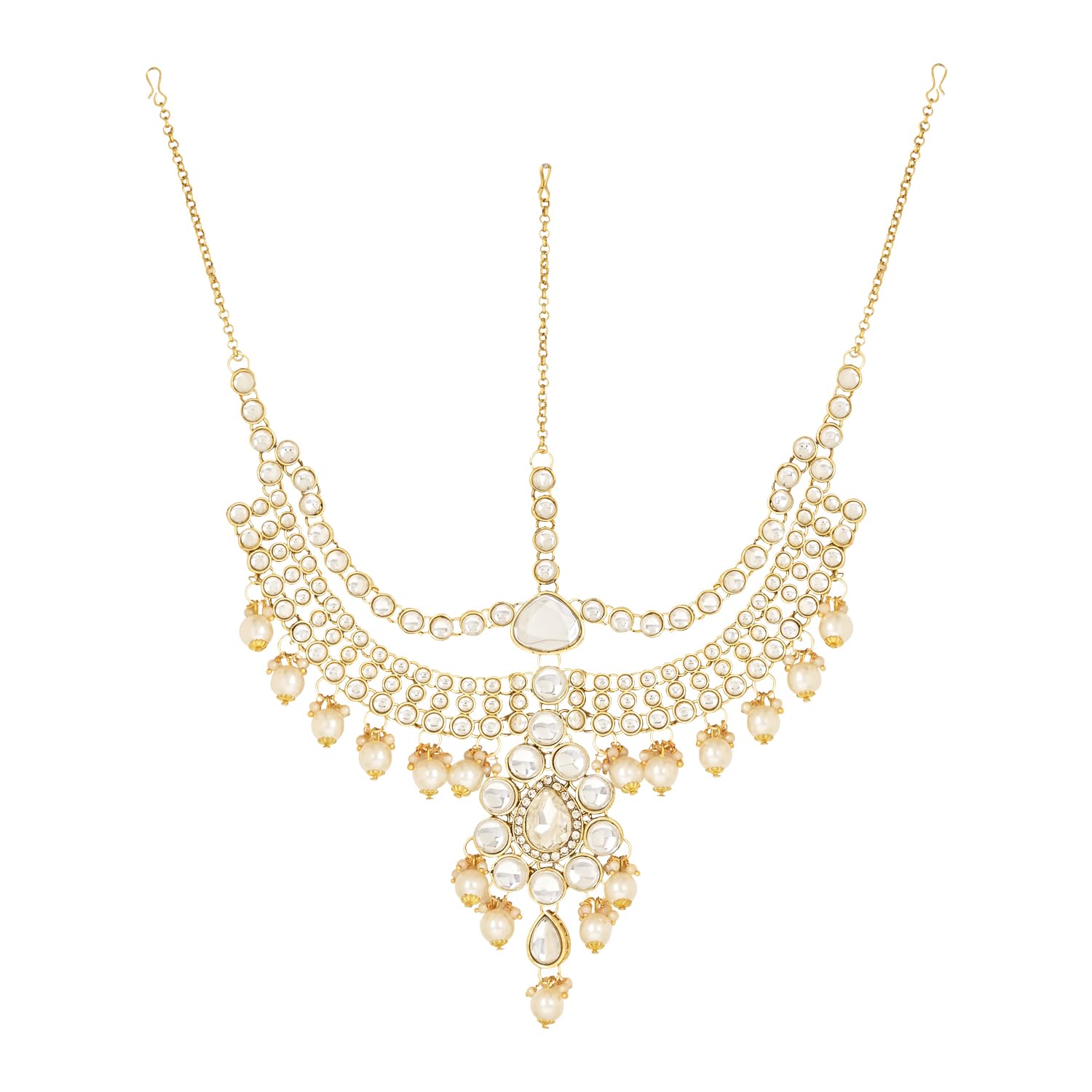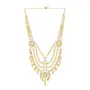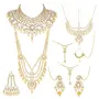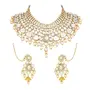 Celebrate your special day with the splendor of this radiant Gold-Plated Kundan Dulhan Bridal Jewellery Set. This opulent collection comprises a captivating long necklace an intricately designed choker and a pair of exquisite earrings. Completing the regal look the set includes a beautifully embellished nath (nose ring) a graceful passa (side headpiece) an alluring mathapatti (forehead ornament) and a pair of dainty panja (hand harness).The choker necklace adorned with glistening kundan and pearls exudes a captivating allure that perfectly complements any saree or lehenga enhancing your overall bridal appearance.Let this traditional bridal jewelry combo necklace set be the crowning jewel of your wedding ensemble reflecting your inner radiance and grace. Make your big day even more memorable with this stunning masterpiece that symbolizes eternal love and sophistication."