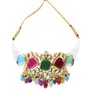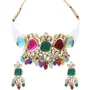 Elevate your ethnic look with this stunning Indian jewelry set featuring a luxurious Kundan choker necklace and matching statement earrings. The necklace showcases exquisite craftsmanship with intricate gold-toned metalwork adorned with vibrant multi gemstones and delicate pearl accents. The choker design is beautifully complemented by dangling multi beads that add movement and grace.The coordinating earrings feature a similar motif with a large pink gemstone surrounded by gold detailing and finished with cascading red beads. This set perfectly balances traditional Indian design with contemporary elegance, making it ideal for weddings, festivals, or any special occasion where you want to make a lasting impression.Key features: Kundan-style choker necklace with matching earrings Gold-toned metalwork with red gemstones Pearl and multi bead embellishments Perfect for Indian weddings and traditional events Versatile design to complement various ethnic outfits