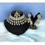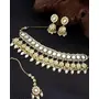 This stunning three-piece jewelry set features an exquisite choker-style necklace adorned with lustrous pearl drops and intricate metalwork, complemented by matching jhumka earrings and a beautiful maang tikka headpiece. Each piece showcases premium gold-tone plating with delicate floral patterns and dangling pearl embellishments that catch the light with every movement.The statement choker necklace creates a regal look with its multi-layered design, featuring oval pearl drops cascading down from an elaborate collar base. The jhumka earrings add graceful length with their bell-shaped pendants and pearl detailing, while the coordinating maang tikka completes this traditional ensemble with elegant sophistication.Perfect for brides seeking timeless South Asian wedding jewelry, this versatile set also elevates formal attire for special occasions, festivals, and cultural celebrations. The classic pearl and gold-tone combination pairs beautifully with both traditional lehengas and sarees as well as contemporary evening gowns.Handcrafted with attention to detail, this ethnic jewelry set makes a memorable gift and cherished keepsake that will enhance your jewelry collection with its timeless appeal. The lightweight design ensures comfortable wear throughout extended celebrations.Transform your look with this heritage-inspired adornment that captures the essence of traditional craftsmanship while delivering modern elegance. Order now to add this showstopping bridal set to your jewelry collection!