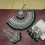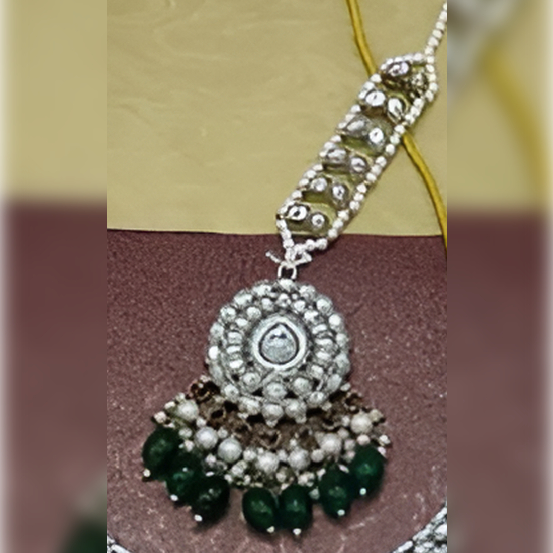 Make a stunning statement with this magnificent handcrafted kundan jewelry set featuring an ornate choker necklace, matching jhumka earrings, and Passa. This breathtaking ensemble showcases the timeless beauty of traditional Indian craftsmanship with a contemporary twist.Set Includes: Elegant choker necklace with kundan stones and emerald green beads Matching jhumka earrings with pearl and green bead embellishments Intricately designed Passa with kundan detailingArtisan Craftsmanship: Each piece is meticulously handcrafted by skilled artisans, featuring premium kundan stonework set. The striking combination of clear kundan stones, lustrous pearls, and vibrant emerald green beads creates a rich, royal aesthetic that elevates any outfit.Versatile Elegance: This jewelry set pairs beautifully with traditional attire like lehengas, sarees, and anarkalis for weddings and festivals, but can also add a touch of cultural elegance to contemporary fusion outfits. The intricate detailing and bold silhouette make it perfect for brides, bridesmaids, or anyone looking to make a sophisticated statement.Occasion Perfect: Ideal for weddings, engagement ceremonies, Diwali, Karwa Chauth, Teej, or any special celebration where you want to shine. This heirloom-quality set brings traditional elegance to modern celebrations.Transform your look and capture attention with this magnificent kundan jewelry set. Add to cart now to experience the perfect blend of traditional craftsmanship and timeless beauty!