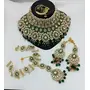 Elevate your bridal ensemble with this magnificent handcrafted Kundan jewelry set featuring an elaborate emerald green meenakari design. This traditional Indian bridal collection combines the timeless elegance of Kundan craftsmanship with the opulent allure of emerald-hued stones, creating a showstopping statement piece that radiates royal sophistication.Exquisite Features: Complete Luxury Set: Includes choker necklace, statement earrings, matching mangtika, and ornate nose ring Premium Artisanal Craftsmanship: Each piece meticulously handcrafted by skilled artisans using traditional techniques Stunning Materials: Features gold-plated settings with intricate Kundan stonework, lustrous pearls, and vibrant emerald green accents Ornate Design Elements: Showcases multiple rows of pearls, clear polki stones, and detailed meenakari work in rich emerald green Versatile Glamour: Perfect for bridal wear, festive celebrations, cultural ceremonies, and special occasions worldwide Heritage-Inspired: Embodies the elegance of traditional South Asian jewelry design with contemporary appealPerfect For: Brides seeking a statement bridal set for wedding ceremonies Festival celebrations including Diwali, Eid, and Karwa Chauth Formal cultural events and traditional ceremonies Pairing with sarees, lehengas, anarkalis, or fusion Indo-western outfits Collectors of distinctive ethnic jewelry pieces Gifting for special occasions and milestone celebrationsTransform your look with this extraordinary jewelry collection that combines centuries of artistic tradition with breathtaking design. The rich emerald green accents beautifully complement outfits in jewel tones, pastels, or classic colors, making this versatile set a treasured addition to your jewelry collection.Order today to experience the unparalleled craftsmanship and timeless beauty of this authentic handcrafted Kundan jewelry set.
