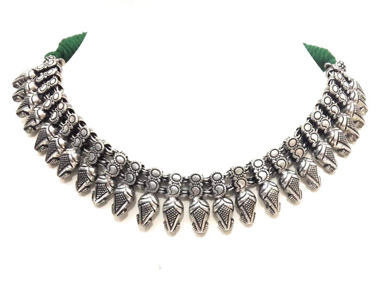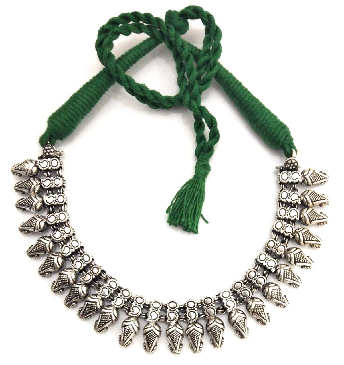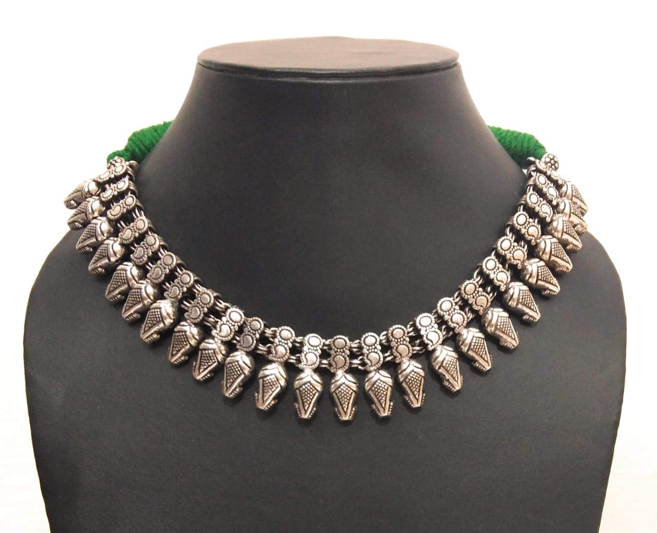 Dark Green Thread oxidized silver Choker Necklace with Antique Texture Tribal design Adds to the beauty over time 14 Inches long Heavy metal beads Embellishment Oxidized silver metal Terrific Party wear Looks magnificent with any dress Be assured for quality with athizay Great gift for girls & women. Think your style Make your style..