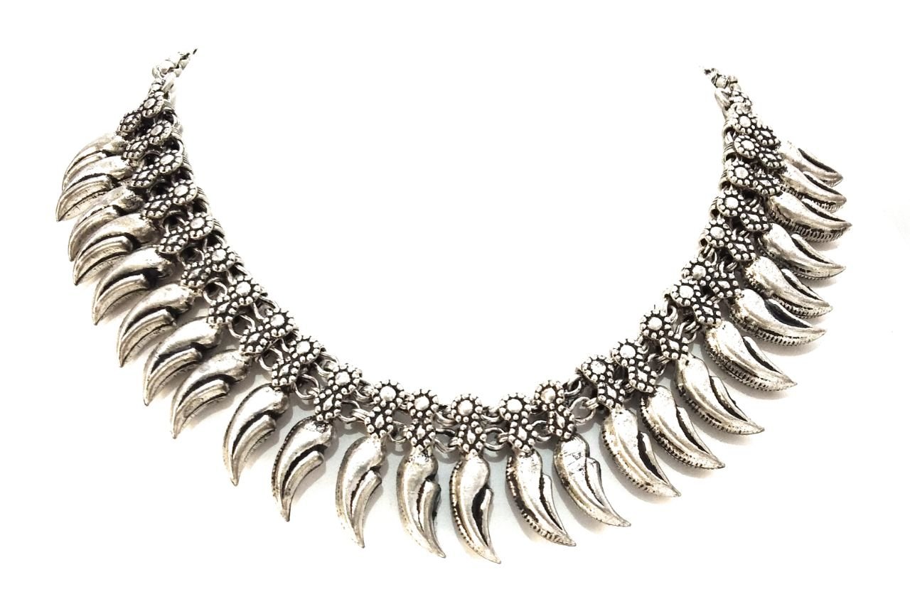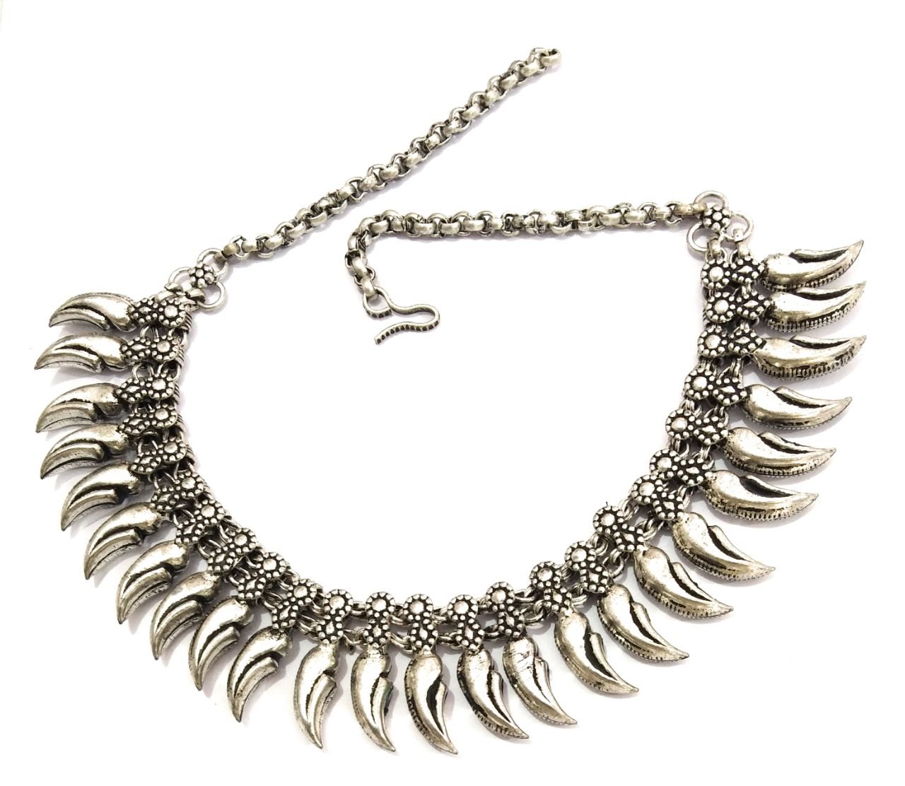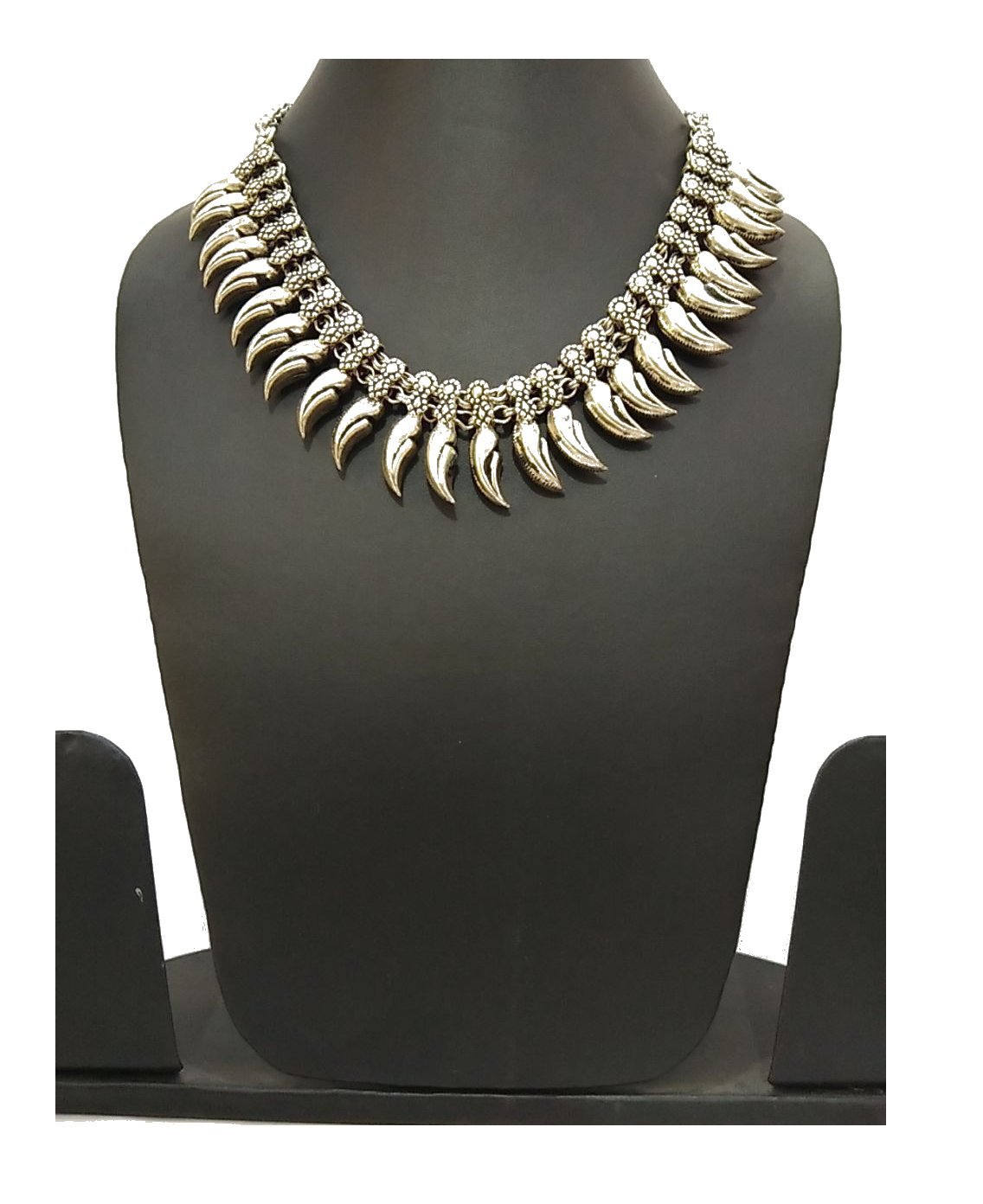 Choker Necklace with Antique Texture long beads pattern metal beads in brass metal. Tribal design. Adds to the beauty over time. 14 Inches long Heavy metal beads Embellishment.silver Oxidized metal.Terrific Party wear. Looks magnificent with any dress. Be assured for quality with athizay. Great gift for girls & women. Think your style Make your style..