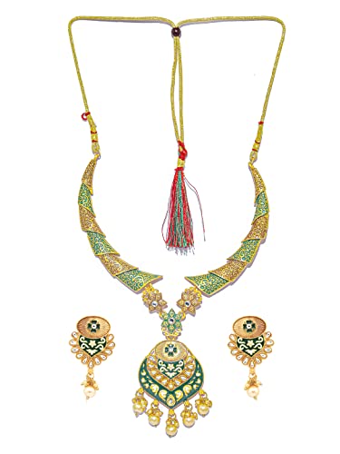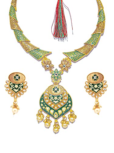 Priyaasi Ethnic Gold & Green Floral Meenakari Jewellery Set One Size Brass Kundan