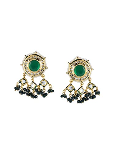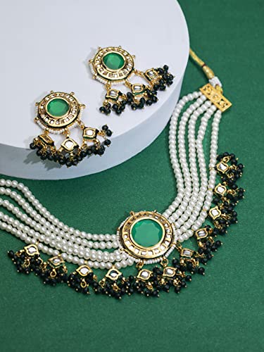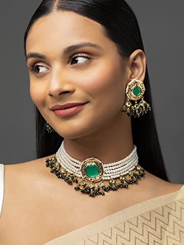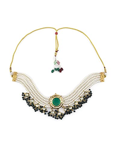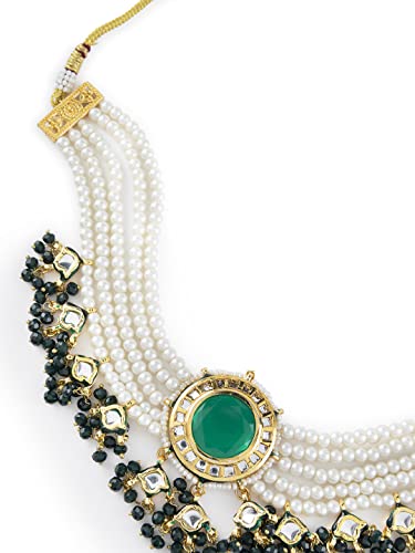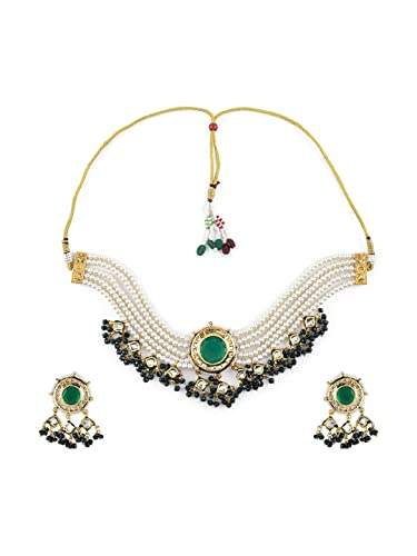 This jewellery set for women is made of brass and is gold-. The necklace can be sed with a drawstring closure. This multi-layered kundan jewellery set for women is made of green stones and pearls. This jewellery set for women will look great with ethnic and bridal wear.