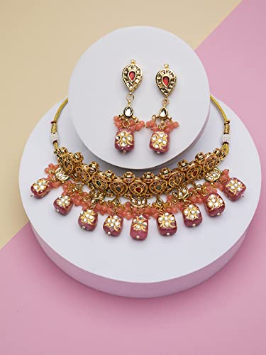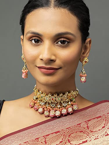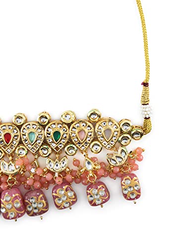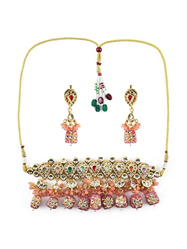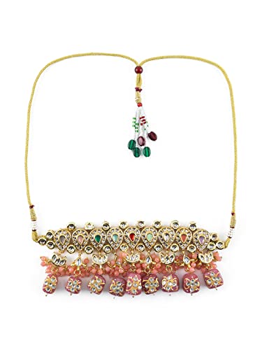 This choker jewellery set for women is made of brass and is gold-. The necklace can be sed with a drawstring closure. This jewellery set for women is made of multi-coloured stones. This jewellery ser for women will look great with ethnic and bridal wear.