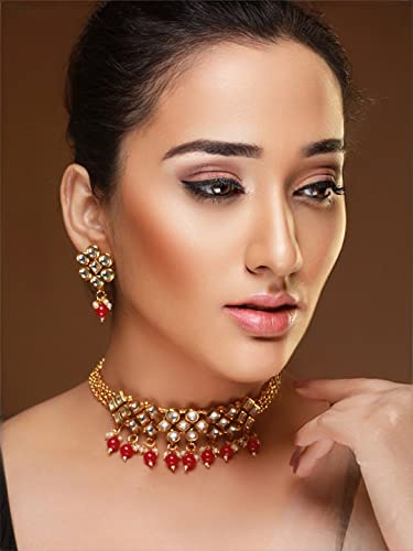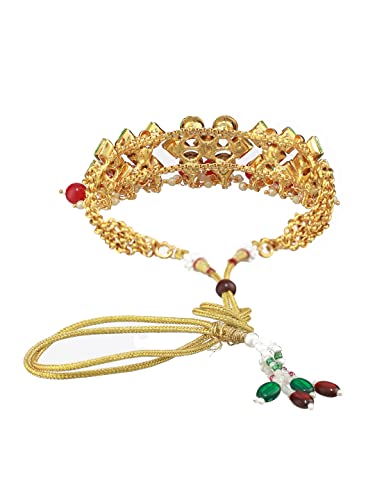 This gold-Colorjewellery set can be sed with a drawstring closure. This kundan pearl choker set is a sight to behold. This set will look great with ethnic and occasion wear.