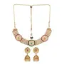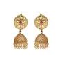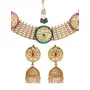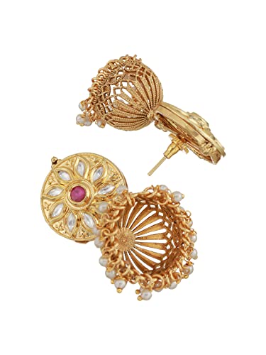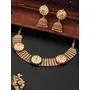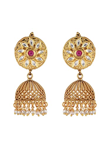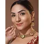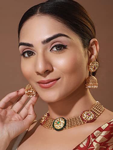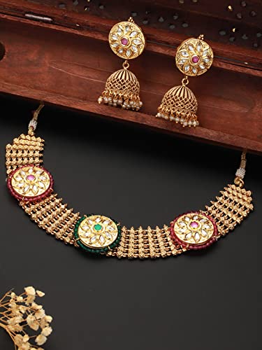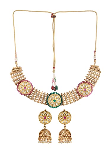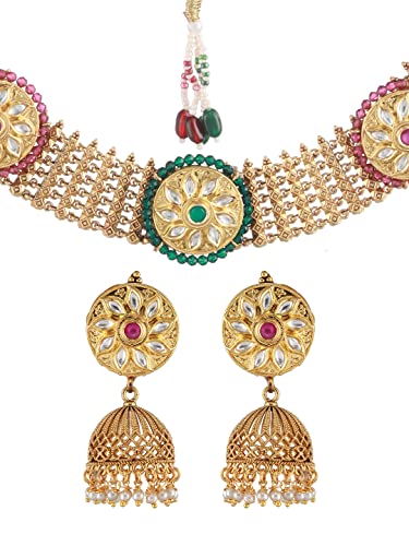 This jewellery set for women is made of brass metal and is gold-. The necklace can be sed with a drawstring closure. This floral studded jewellery set for women is studded with red stones. This jewellery set for women will look great with ethnic and bridal wear.