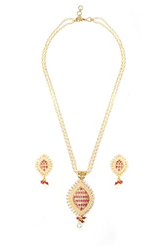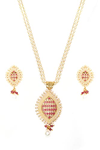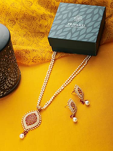 HomeFashionNecklacePriyaasi White & Red Layered Studded Ruby Stone Jewellery Set for Women | Leaf-Inspired Design | Chain of Pearls | Jewellery Set for Women - Wedding Festivals Party and Functions