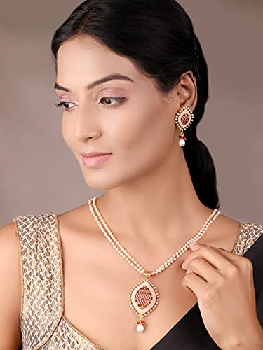 Priyaasi White & Red Layered Studded Ruby Stone Jewellery Set for Women | Leaf-Inspired Design | Chain of Pearls | Jewellery Set for Women - Wedding Festivals Party and Functions