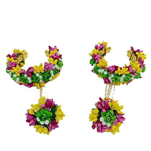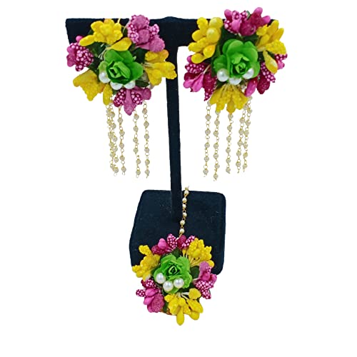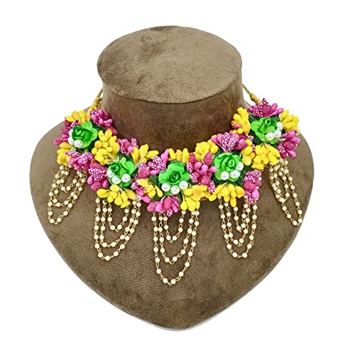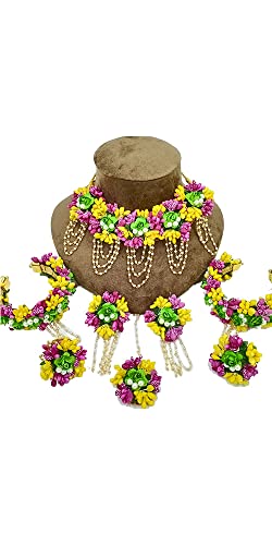 HomeFashionNecklaceRKG HANDICRAFTS SA FLORAL Women's artificial flowers Jewellery Set Floral gota patti Necklace, Earrings, Mang Tikka, Bracelet with rings Bridal Set in Pink, Yellow, Green] for women