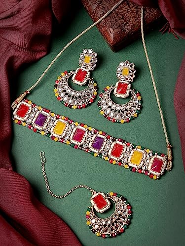 If you're looking for an affordable yet stunning choker necklace set, this is it! The white Kundan and bead studded design exude elegance, making it a must-have for any fashion-conscious woman.