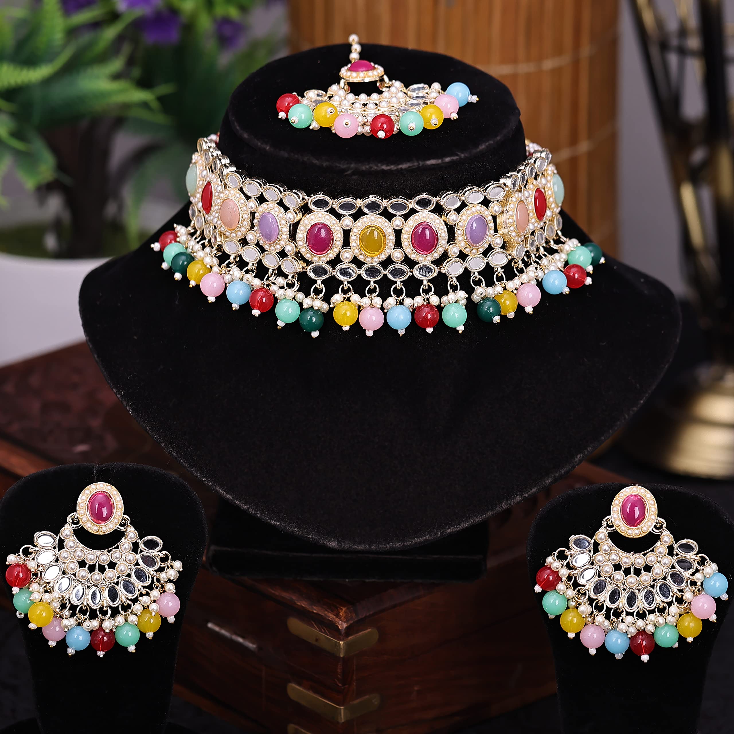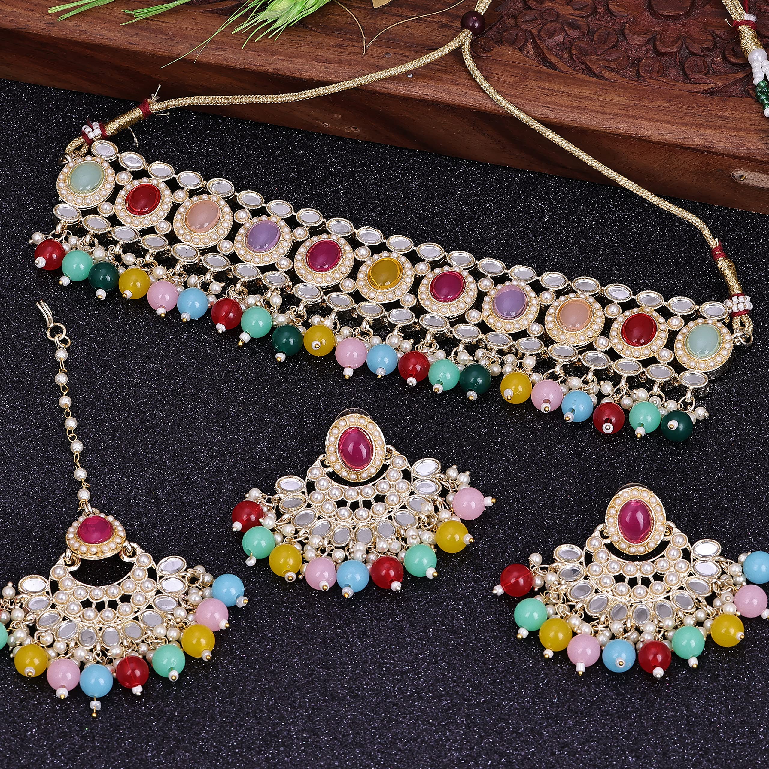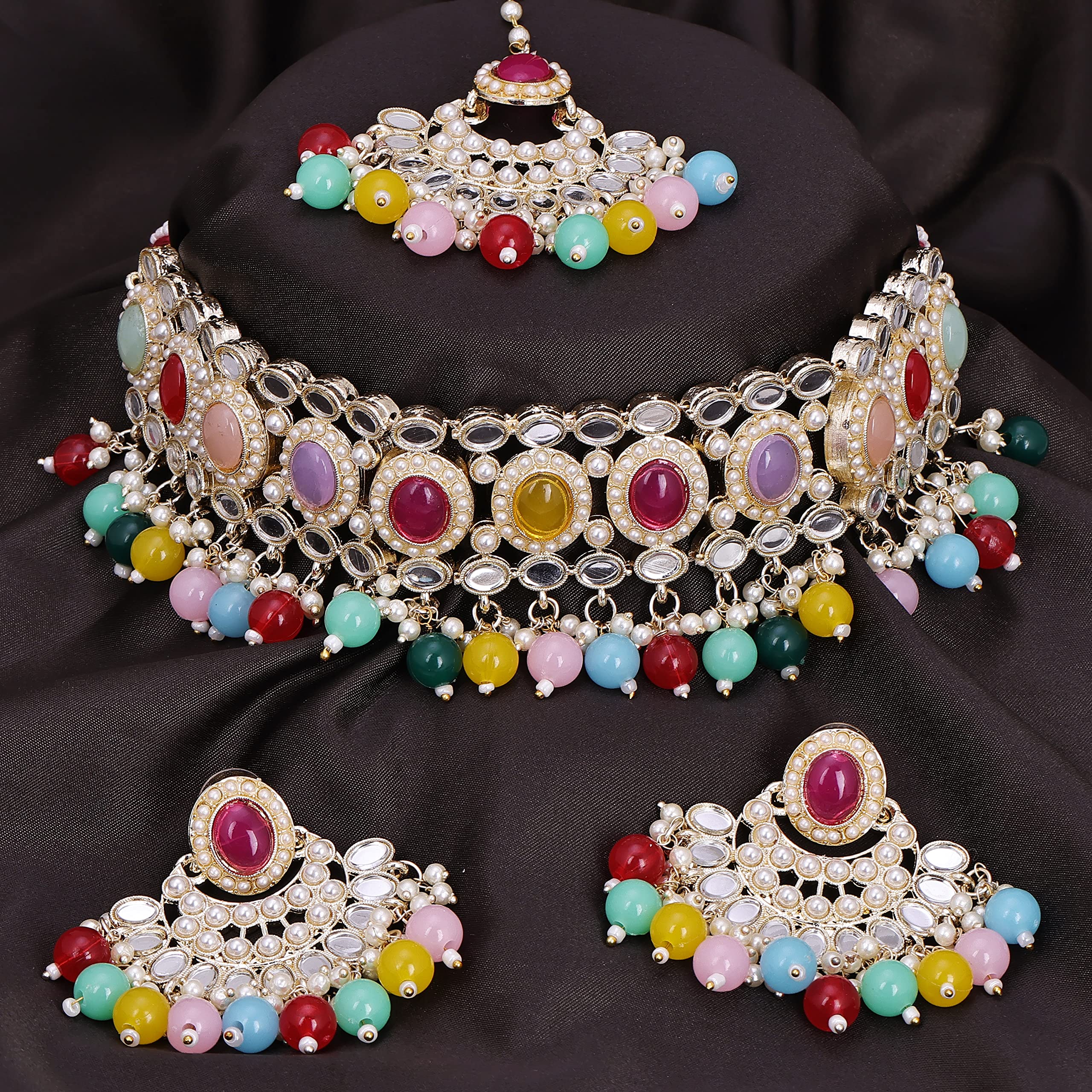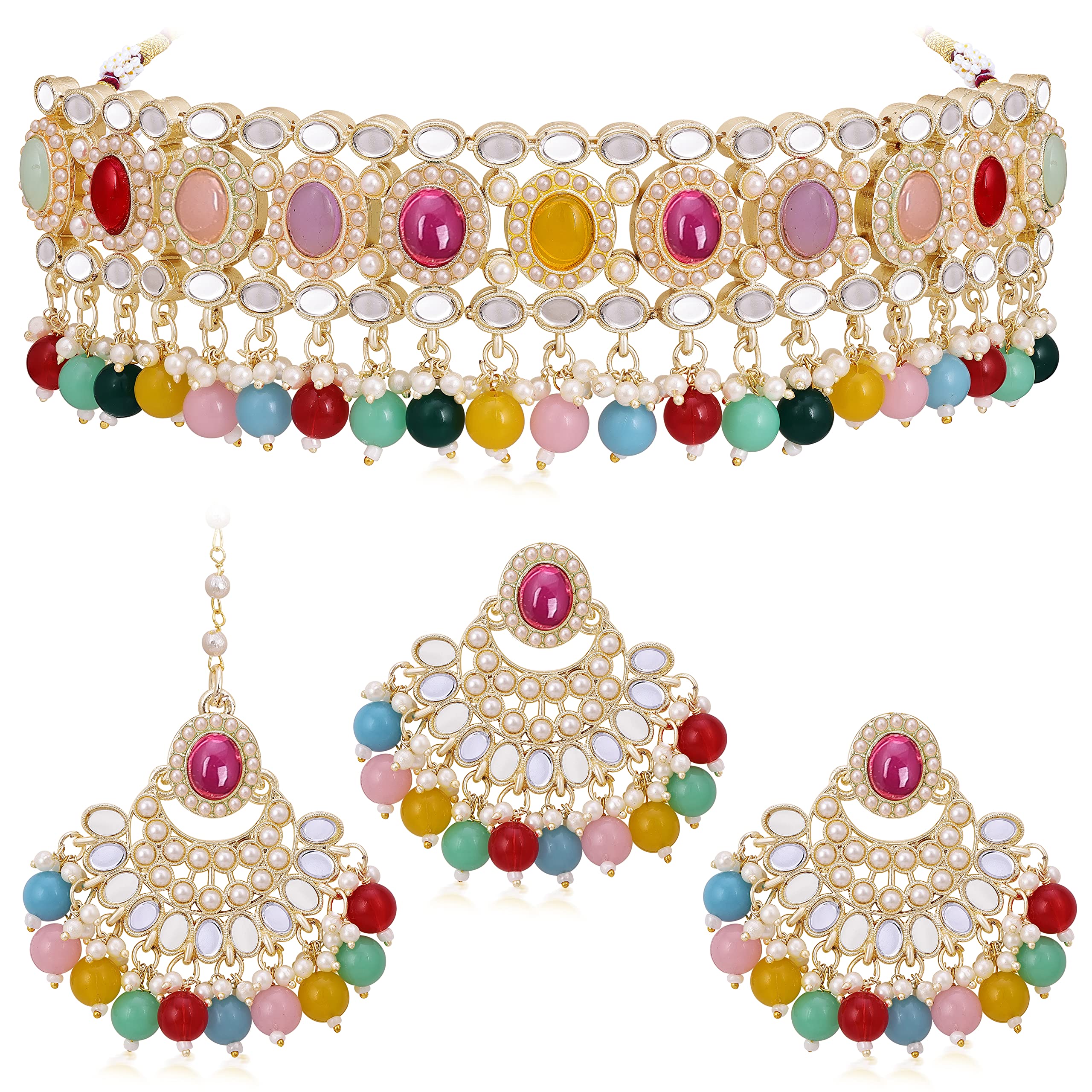 Sukkhi Traditional Wedding Wear Square Shape with Black Beads Choker Necklace & Earring Maangtikka Set.