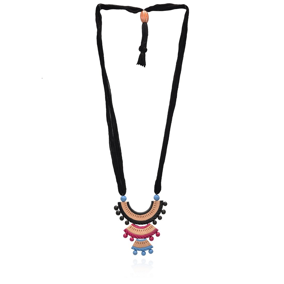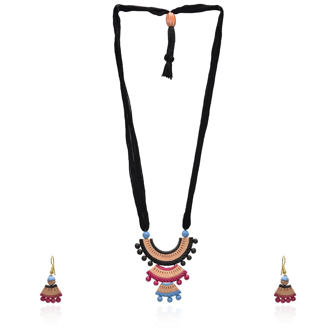 The product in display is made from terracotta material and is finished in an attractive black color. Furthermore this product features a strand shape and a design that renders it with the versatility to be worn as a festive occasion wear