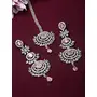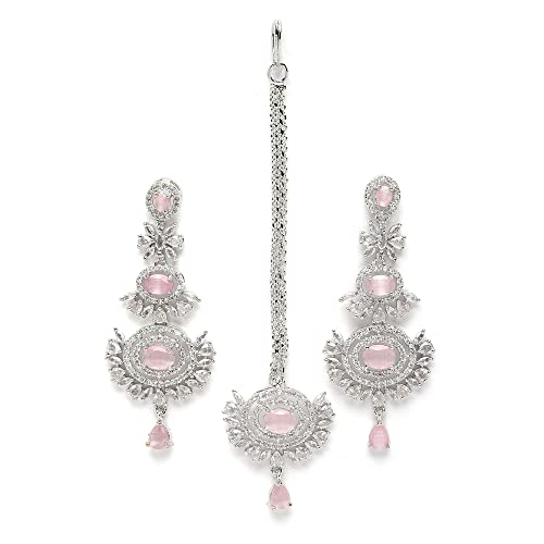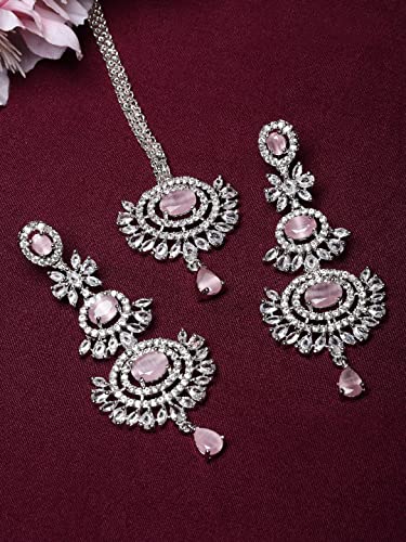 Women Rose Gold Plated American Diamond Studded Maang Tikka & Earrings Jewellery Set t