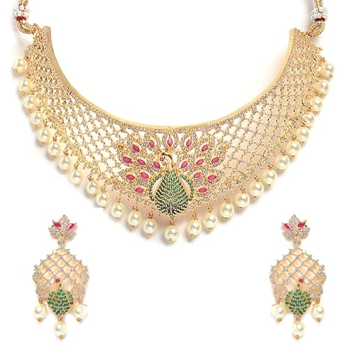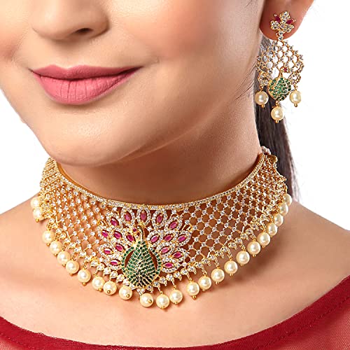 What You Get - 1 Elegant Looking White-Pearl Based Gold Plated Choker With Matching 2 N Earring and Matching Long Earrings. Wedding / Festive / Ethnic look floral tikka. It can be worn with all kinds of outfits and for all the age group.; Each Zeneme jewellery for women comes with a Signature gift box and makes excellent gift choice for birthdays wedding anniversaries Festivals Valentine’s Day Mother's Day Diwali Christmas and all your special occasions.