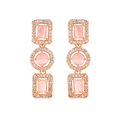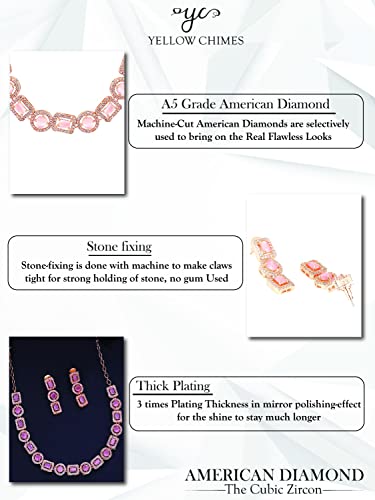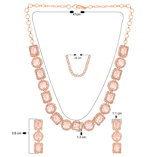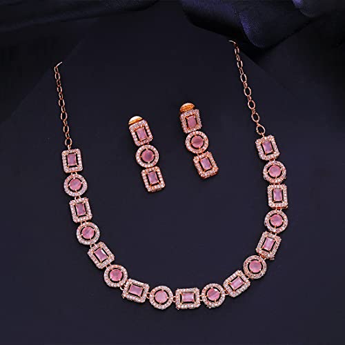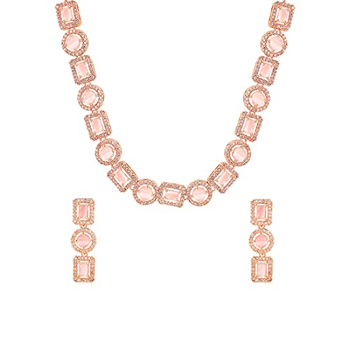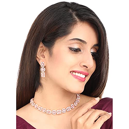 Elegant and lovely Stylish Pretty Party Wear Designer Contemporary PieceThis Rose Gold Plated American Diamond Necklace Set Designer Jewellery Set with Drop Earrings A5 Grade clarity is Stunning & Preciously Suitable for all kinds of occasions. Beautiful Looks at One Glance - with Intricate High Polish creates Glamorous Reflections and adds Luxurious Looks.Produced under Quality Control; One by One Checking; Focus on Detail Processing. Top Quality/ Latest Trend Design/Anti-Allergy.
