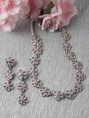What You Get:- This jewellery set consists of a necklace and a pair of earrings. Oxidised Silver-Plated Necklace has Flower shaped American Diamond studded detail secured with a Drawstring closure. A pair of matching Drop Earrings each secured with a Post and Back Closure. LUXURY GIFTING IDEA:- Give a meaningful and luxurious gift with Zeneme Jewellery. A favourite gift choice each Zeneme jewellery for women comes with a Signature gift box and makes excellent gift choice for birthdays wedding anniversaries Valentine's Day Mother's Day Diwali Christmas and all your special occasions. MATERIAL CRAFTSMANSHIP:- Finest quality stones and environmentally friendly nonprecious Metals are used for making the jewelry set. It is safe for wearing for long hours. Exquisite handwork is required since some crystals are too small to pick my fingers really hard and time-consuming. JEWELLERY CARE:- Keep the jewellery away from direct heat water perfumes deodorants and other strong chemicals as they may react with the metal or plating. Store the jewellry when not in use in a storage box or a cloth pouch to retain its shine. Nickel free and Lead free as per International Standards that makes it very skin friendly. The plating is non-allergic and safe for all environments.