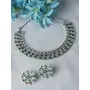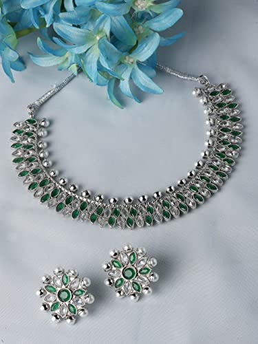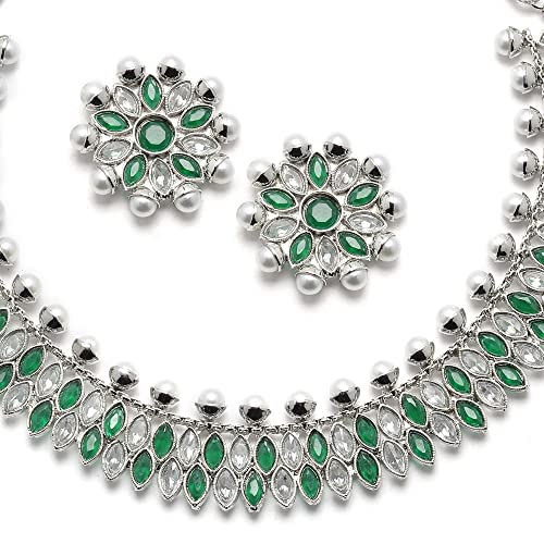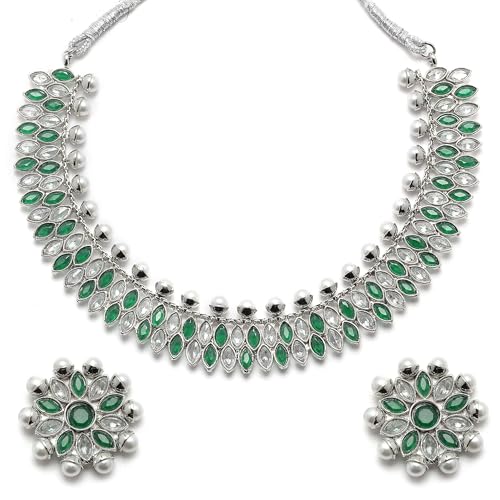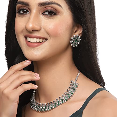 What You Get:- This jewellery set consists of a necklace and a pair of earrings. Oxidised Silver-Plated Necklace has Leaf Shaped American Diamond & Pearl studded detail secured with a Drawstring closure. A pair of matching Drop Earrings each secured with a Post and Back Closure. LUXURY GIFTING IDEA:- Give a meaningful and luxurious gift with Zeneme Jewellery. A favourite gift choice each Zeneme jewellery for women comes with a Signature gift box and makes excellent gift choice for birthdays wedding anniversaries Valentine's Day Mother's Day Diwali Christmas and all your special occasions. MATERIAL CRAFTSMANSHIP:- Finest quality stones and environmentally friendly nonprecious Metals are used for making the jewelry set. It is safe for wearing for long hours. Exquisite handwork is required since some crystals are too small to pick my fingers really hard and time-consuming. JEWELLERY CARE:- Keep the jewellery away from direct heat water perfumes deodorants and other strong chemicals as they may react with the metal or plating. Store the jewellry when not in use in a storage box or a cloth pouch to retain its shine. Nickel free and Lead free as per International Standards that makes it very skin friendly. The plating is non-allergic and safe for all environments.