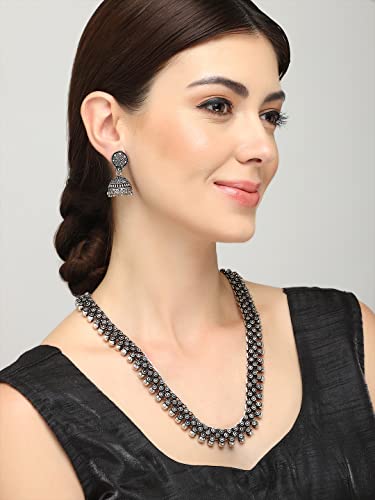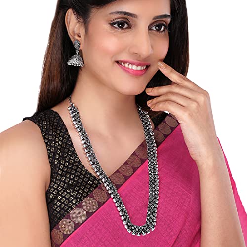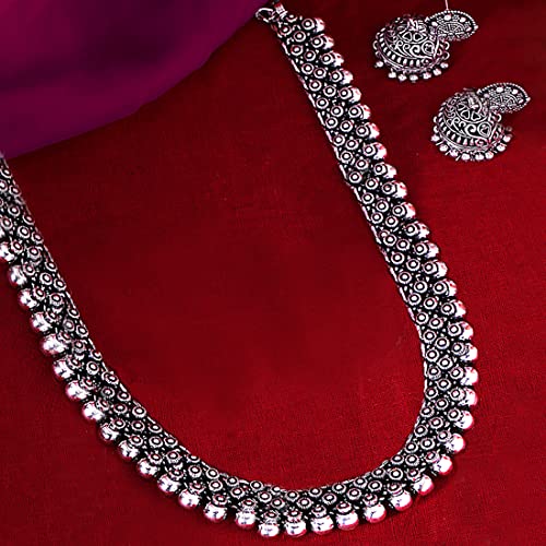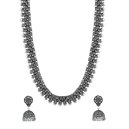 HomeFashionNecklaceYellow Chimes Antique Silver Oxidized Ethnic Indian Traditional Kolhapuri Long Necklace Set with Jhumka Earrings Fashion Jewelry for Women