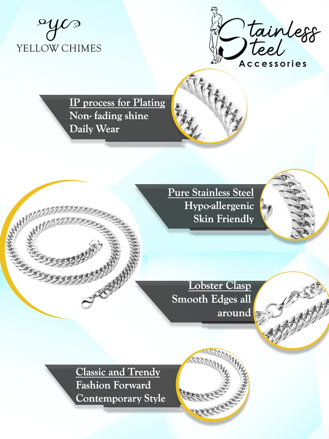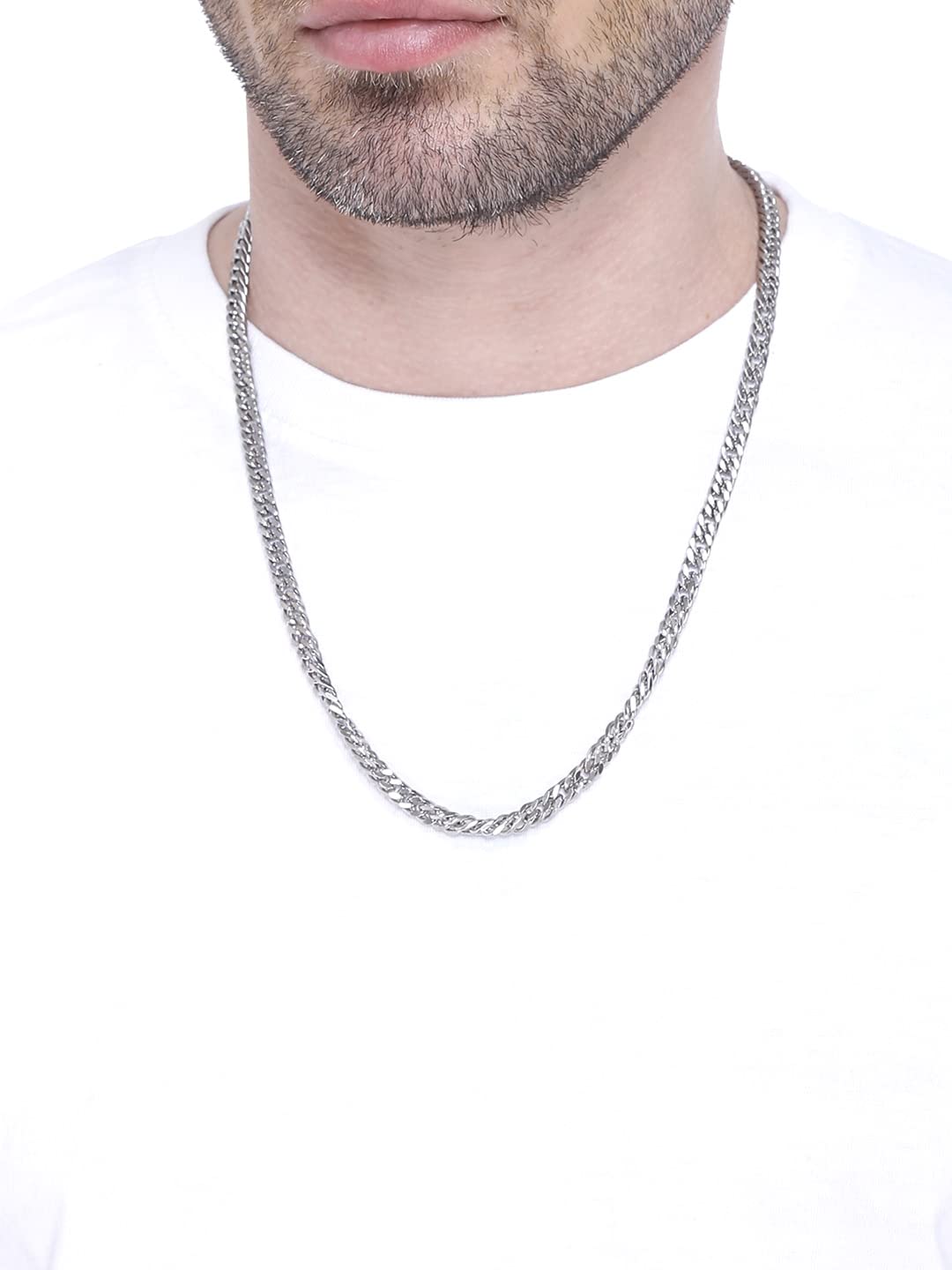 Elevate your everyday look with this stylish and durable Yellow Chimes silver chain for men. This men chain is crafted from high-quality stainless steel ensuring long-lasting wear without compromising comfort. Its versatile design complements any attire making it an ideal chain for men for daily wear to the office or college a night out with friends or even a date night with your girlfriend. The secure lobster clasp keeps the chain securely fastened while the sleek silver finish adds a touch of sophistication. Whether you're looking for the perfect gift for your son friend or a special man in your life this silver chain is a timeless choice. This men necklace pairs well with both Western and traditional outfits making it a versatile accessory for any occasion. This chain for men is not only a stylish accessory but also a testament to quality and craftsmanship making it an excellent addition to any man's jewelry collection. You can find this and other stylish men accessories at your local shop. This Yellow Chimes chain is designed to resist rusting ensuring its longevity. It comes in a sleek and elegant Yellow Chimes box adding an extra touch to your purchase.